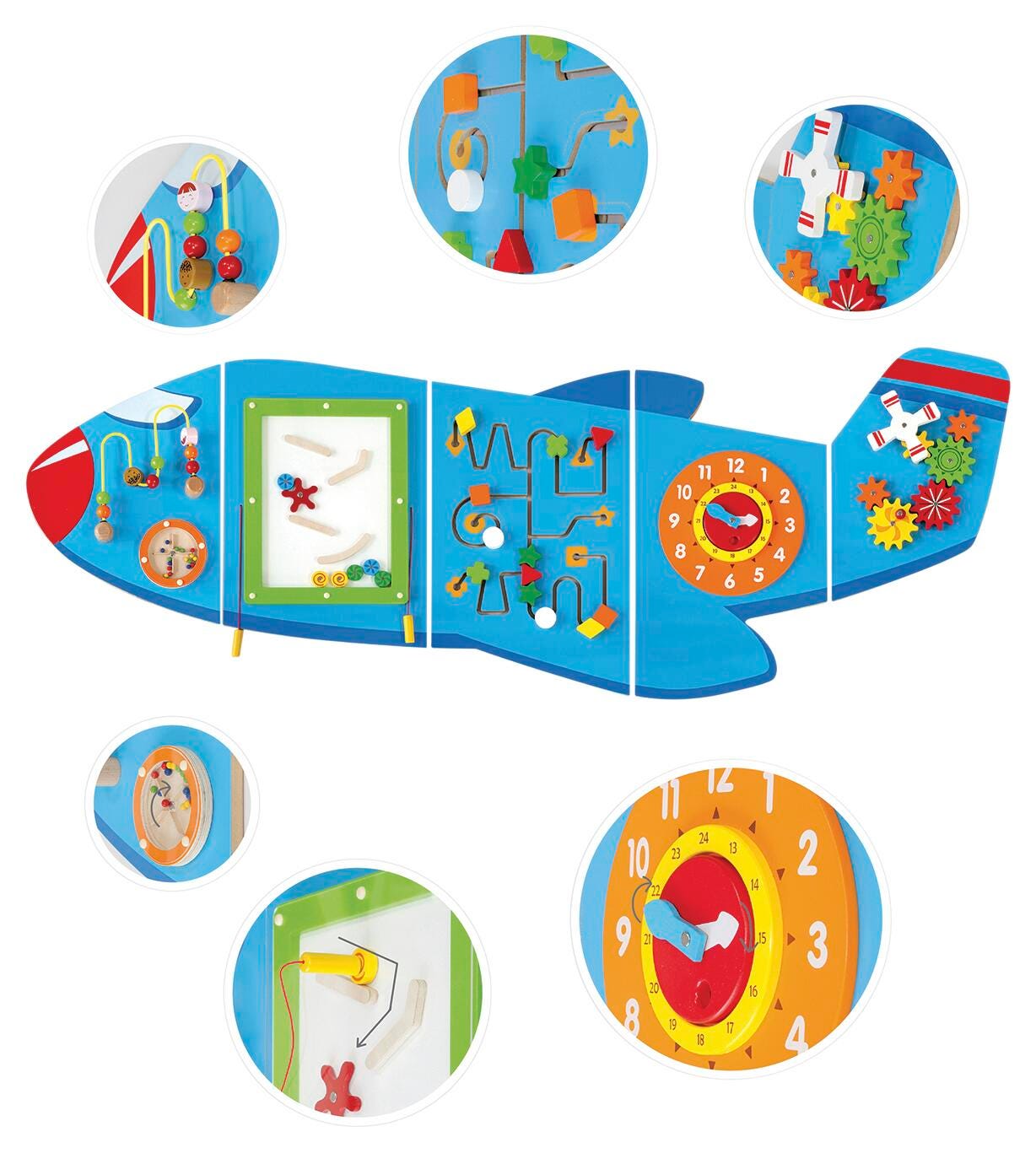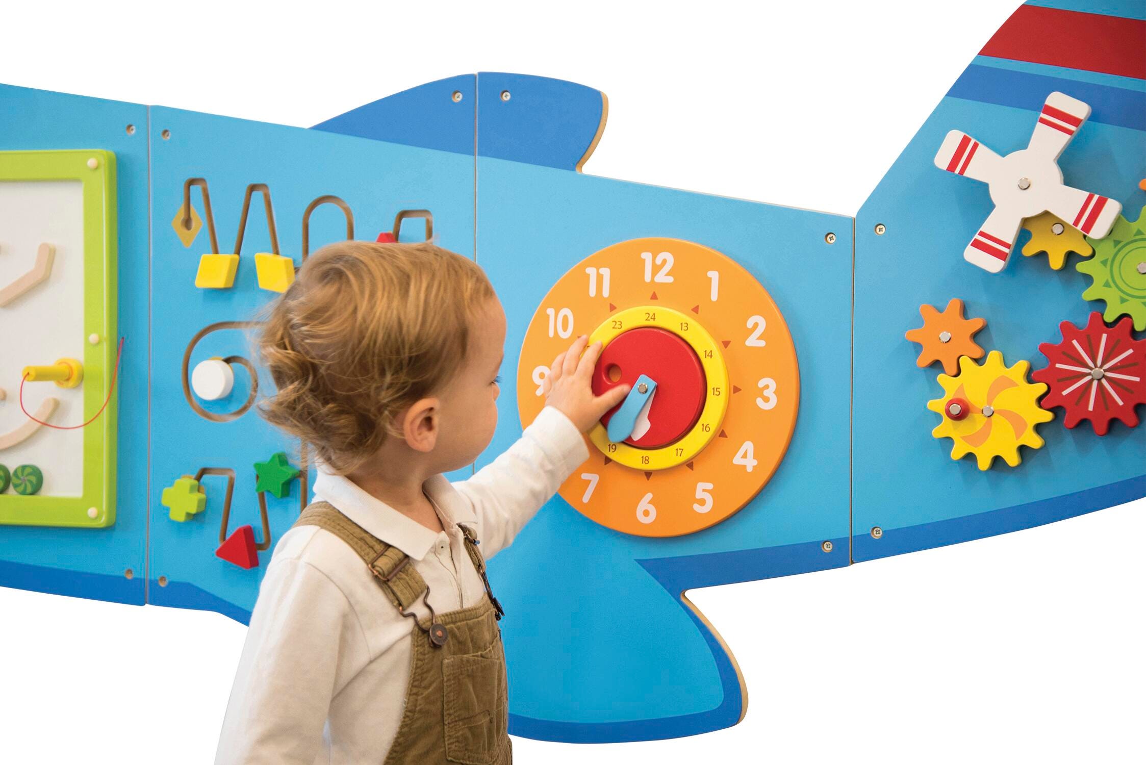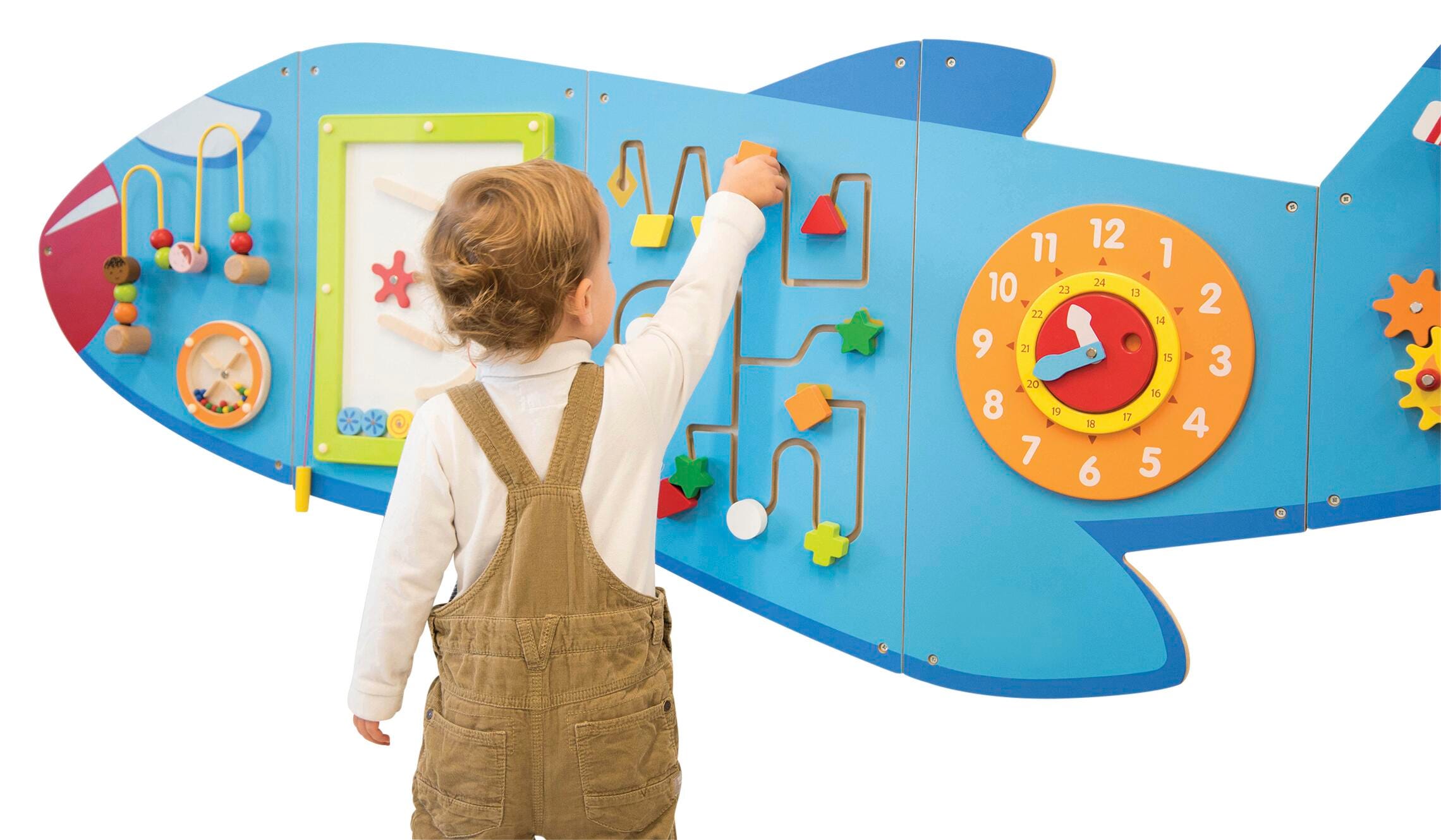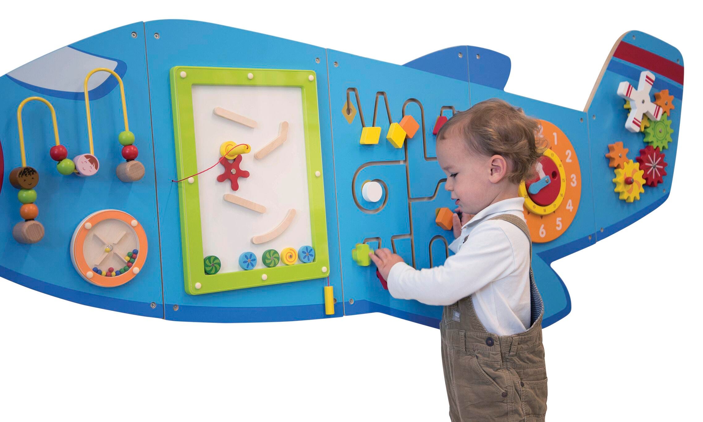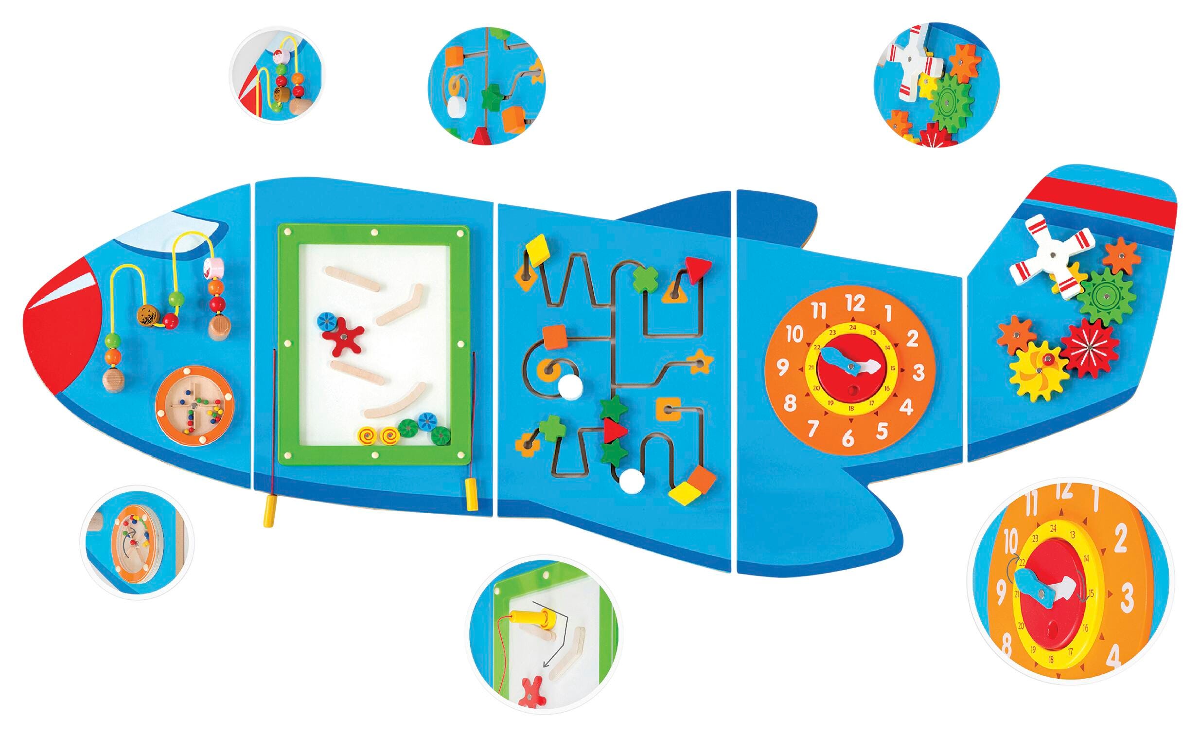 Children love the colorful, tactile manipulatives on this engaging Airplane! The Airplane Activity Wall Panels help develop motor, collaborative play, communication, language and early math skills. The set of 5 panels contains 6 different puzzles and effects to play with including wire beads, a rolling disc with sound, a magnetic block slider, a trace and track toy, a clock with moving hands and turning gears. Constructed with MDF. The learning panels are shipped in one box which contains the set of five panels. Each panel includes its own fixing holes and comes with screws. Size of 5 Mounted panels: 5 ft 7-1/2 in L x 2 ft 2 in H. Appropriate for ages 18 months and up.