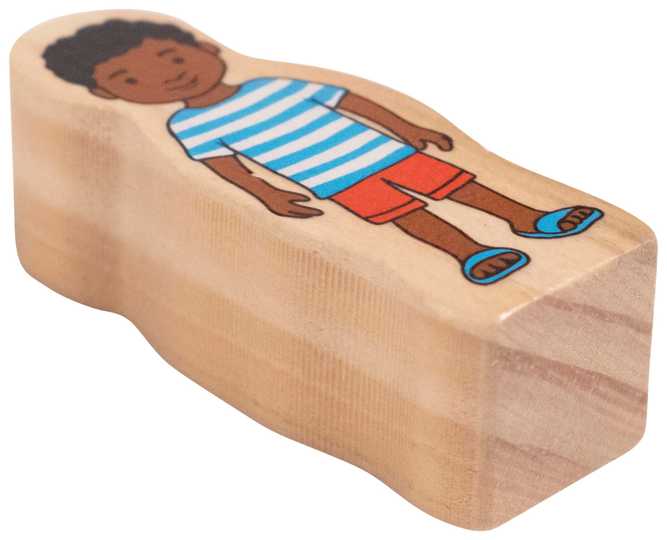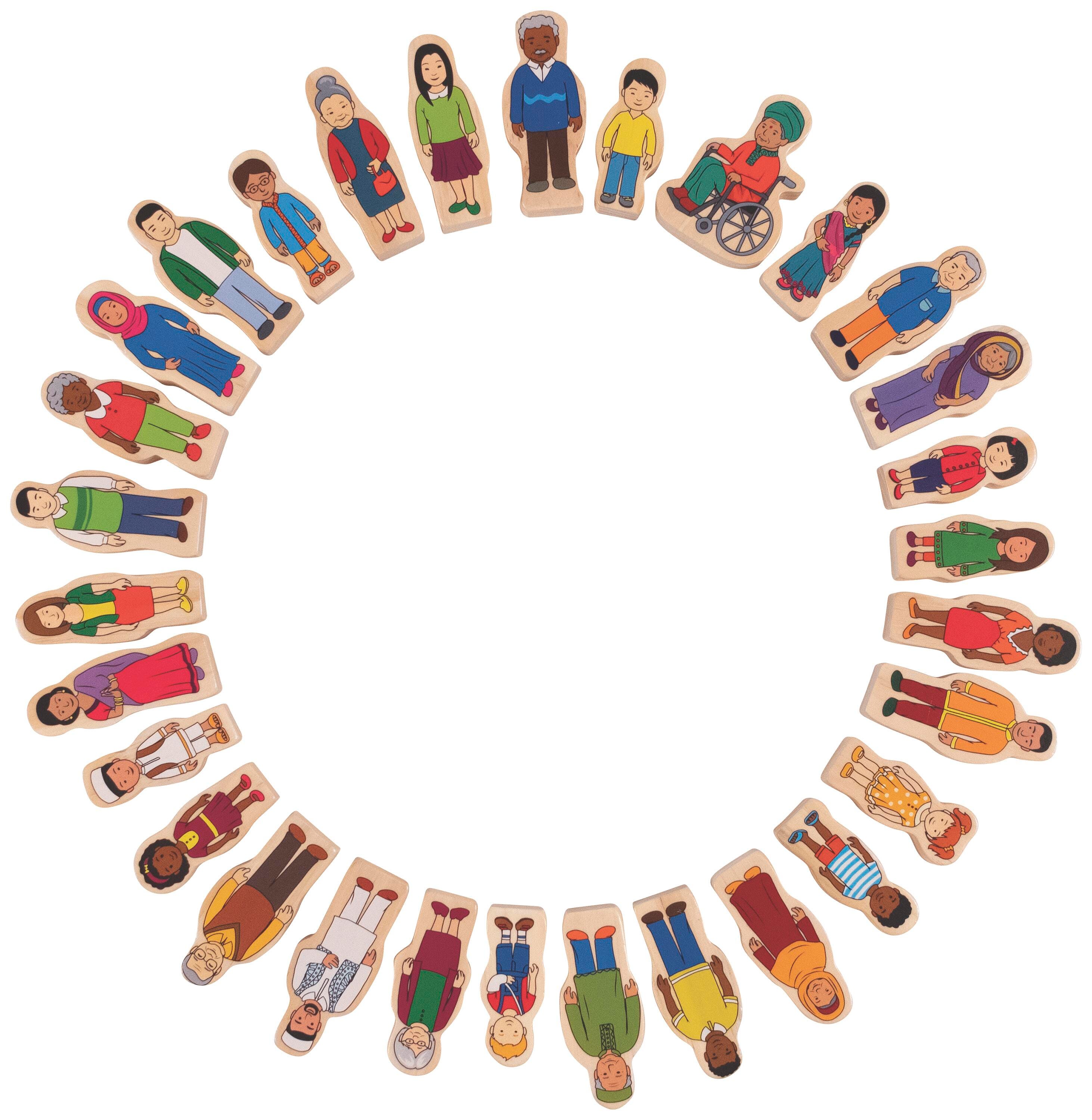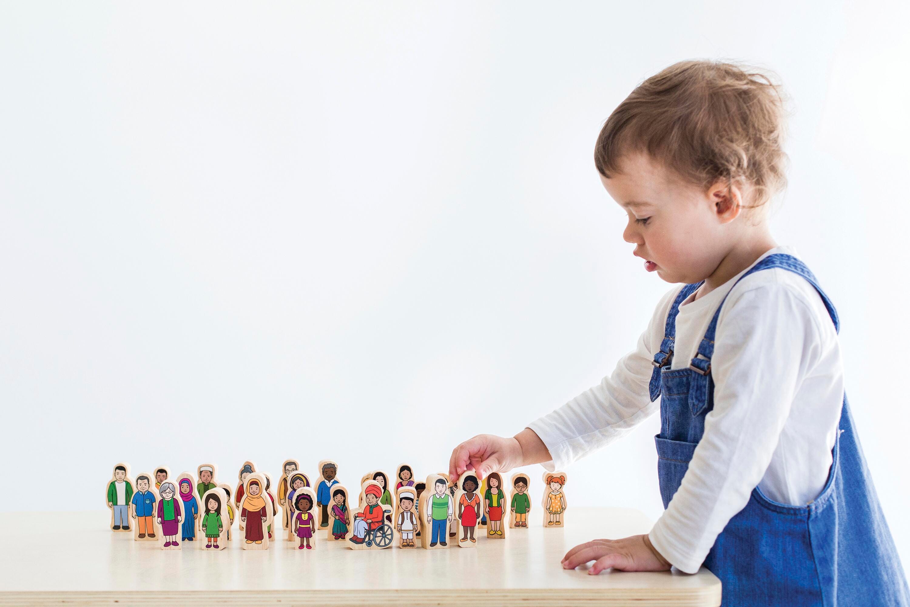 This set of 30 family-themed, chunky, wooden blocks is designed for children aged 12 months and up. Made with New Zealand Pine, the pieces are 3/4 inch 2 centimeters thick so they stand on their own. A range of ages, cultures, and genders are represented, and figures are screen-printed and lacquered on both sides for ease of use and durability. Sizes range from 2 to 1/4 to 3 inches in height.