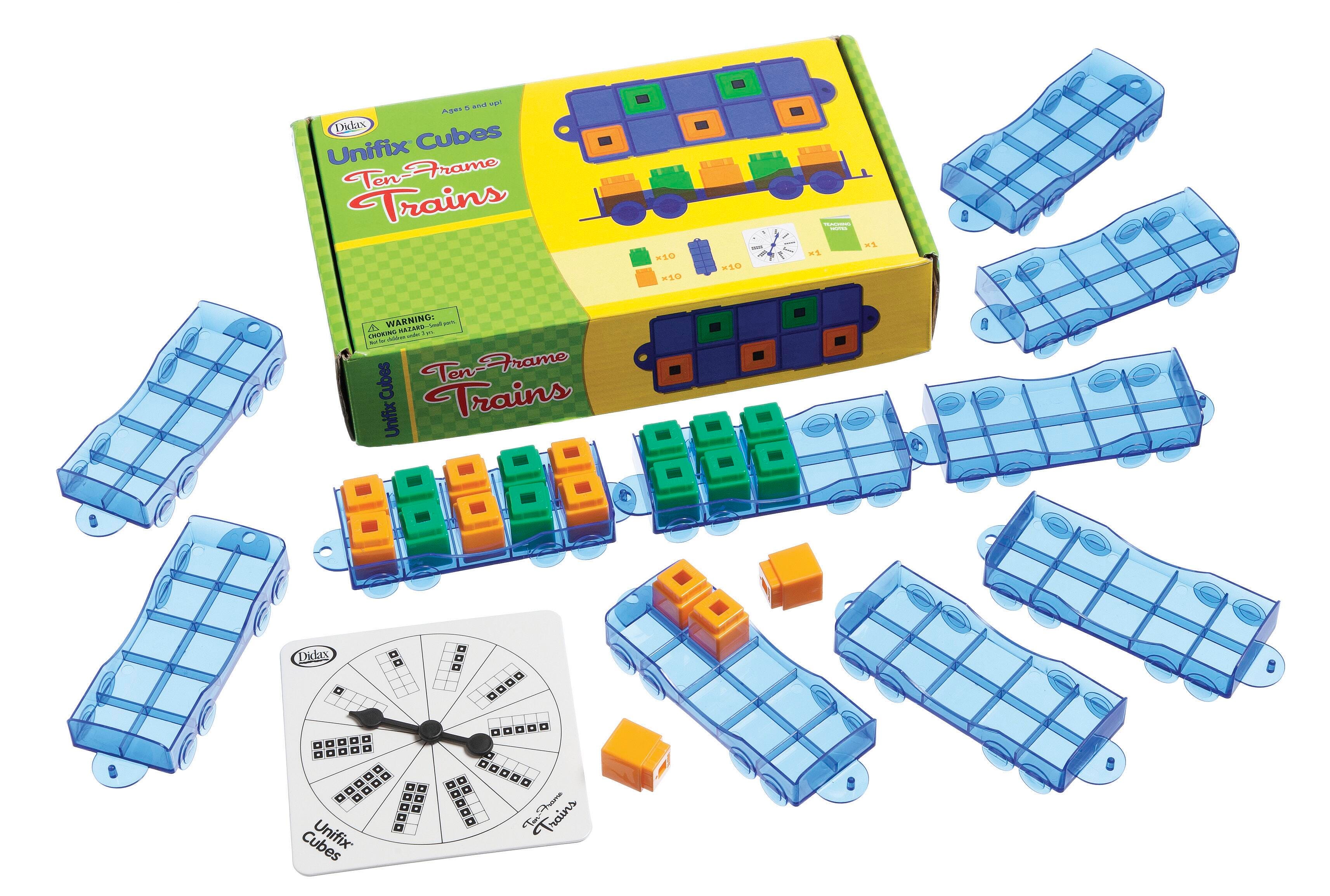 Description These manipulatives help kids develop a concrete understanding of the concept of ten by connecting train cars, each holding 10 unifix cubes. By filling the spaces and connecting the cars, children can see and feel the transition from 10 to 11, 20 to 21, etc. Designed for grades PreK - 2. Set includes 10 cars and 20 cubes, along with ten-frame spinner and teacher's guide.Features Connect trains to teach "10 and more" Teaches a foundational understanding that students will build upon for years to come For individual or small group use Includes: 20 Unifix Cubes, 10 Cars, 1 Ten-Frame Spinner, Teacher's Guide