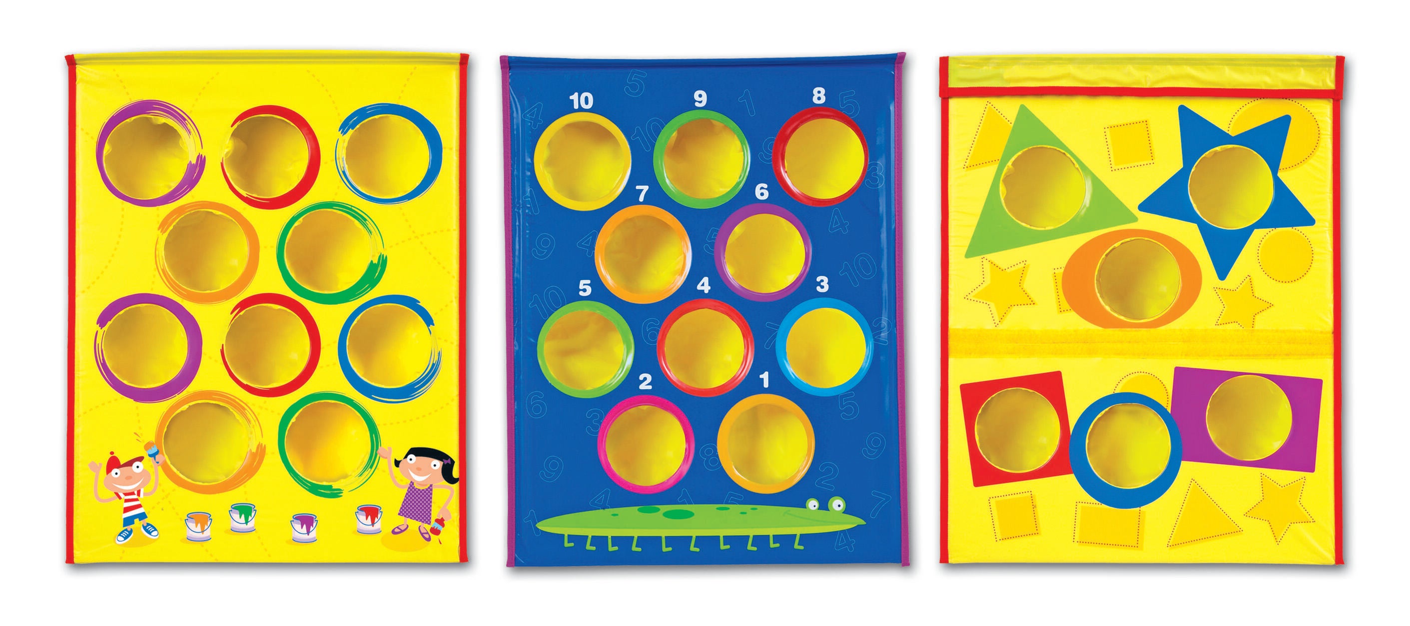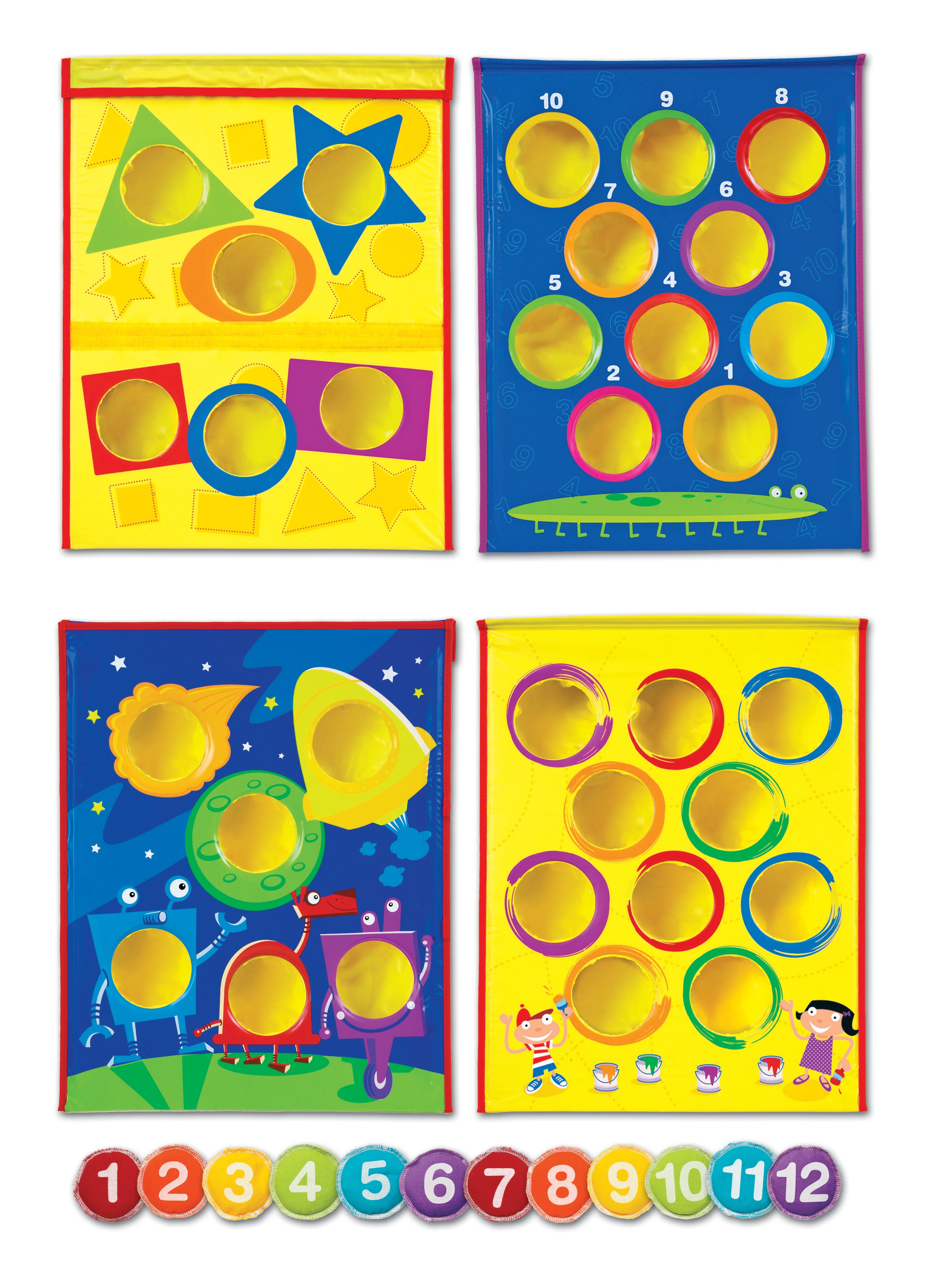 The Smart Toss Bean Bag Tossing Game from Learning Resources provides kinesthetic learning opportunities and promotes physical health with a multi-purpose game board. The board offers four play options: Recognition of colors, numbers, or shapes, and free play, and has four different game board displays to match. This fun and approachable game is great for carnivals, Field Day, Math Night, or other school events. The bean bags measure 3 inches in diameter, are labeled with numbers 1 through 12, and come in a variety of fun colors. The board feature two handy storage pockets and a carry handle. Recommended for ages 3 and up.