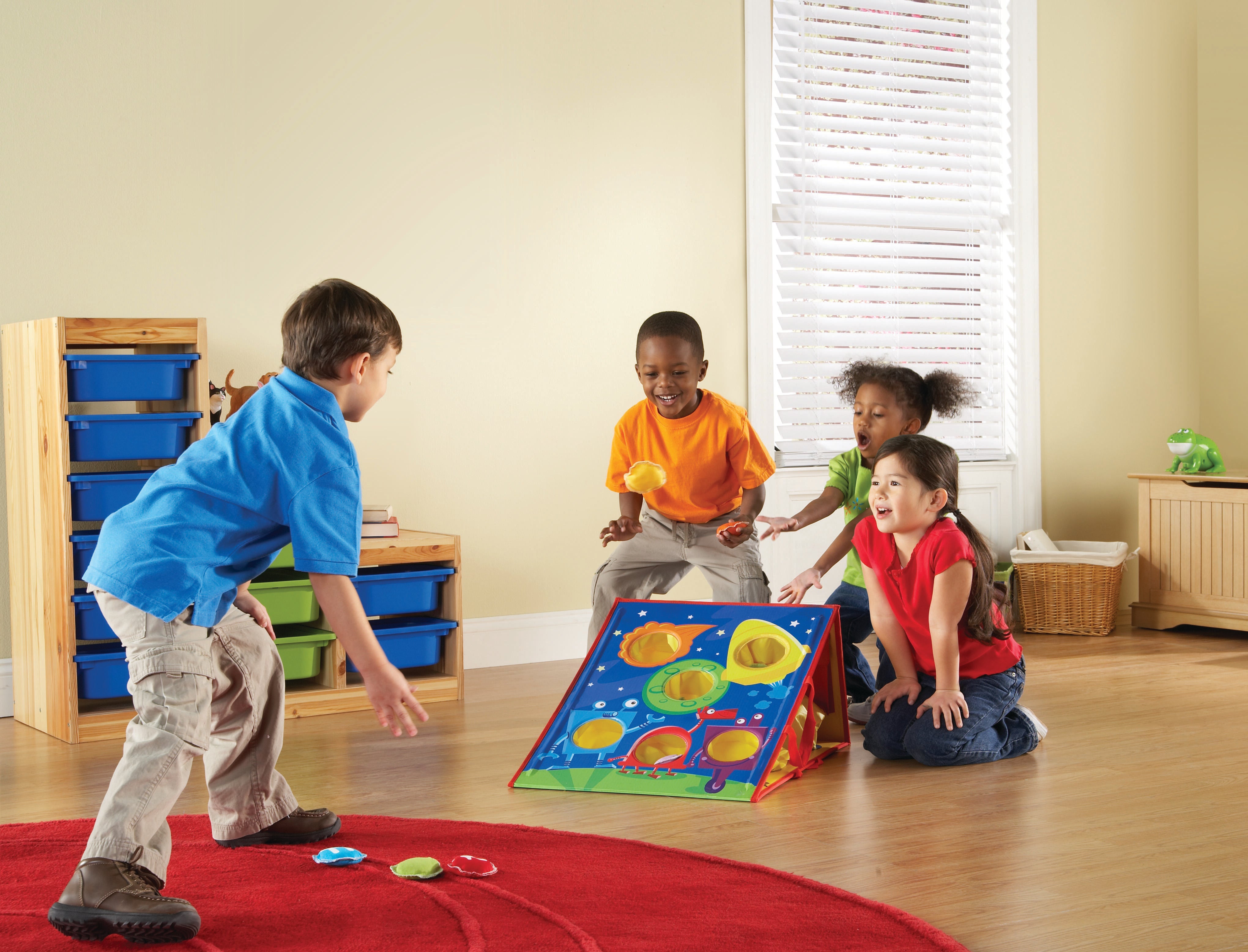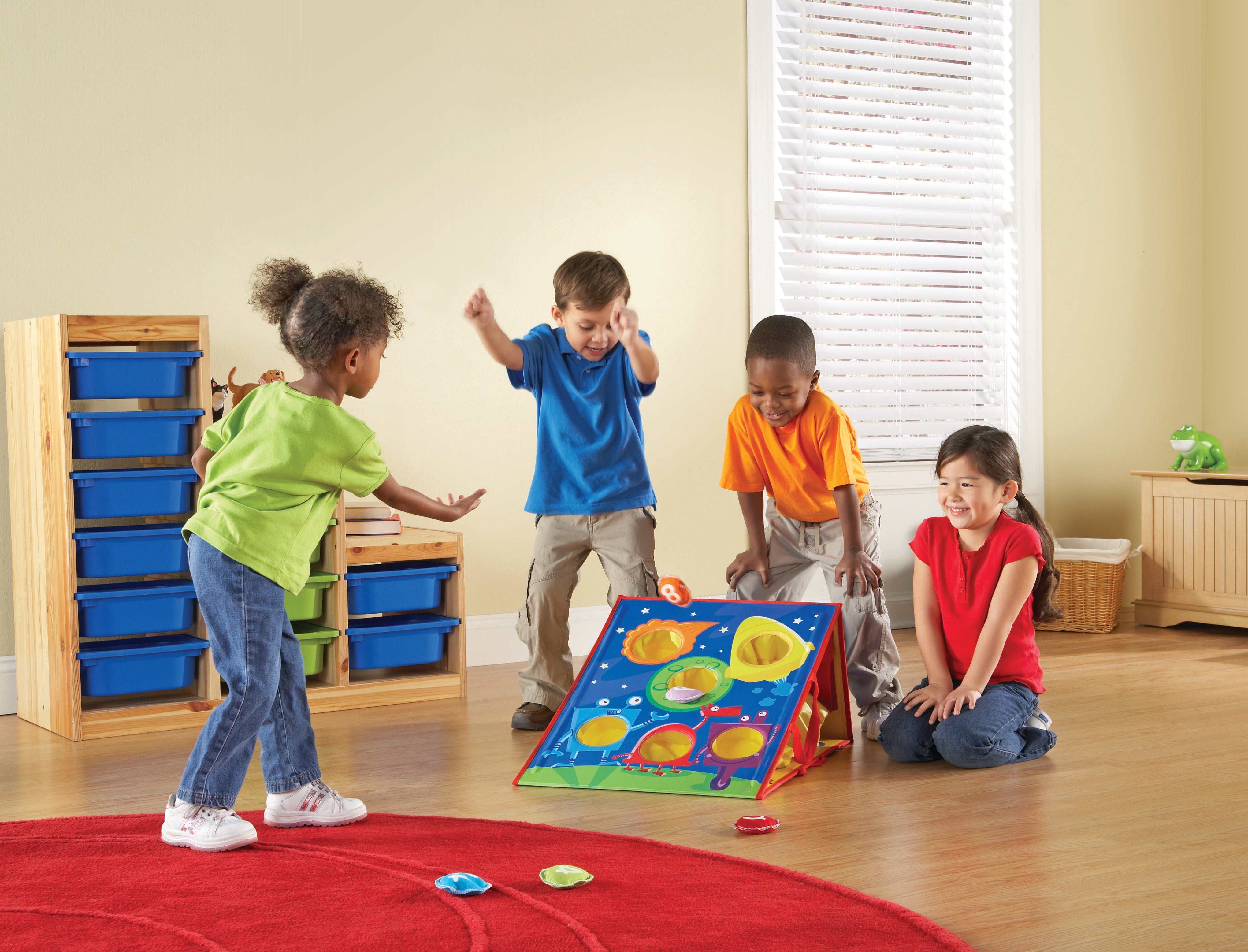 Facilitate learning through active play and movement that encourages gross motor development as students balance, aim, and toss