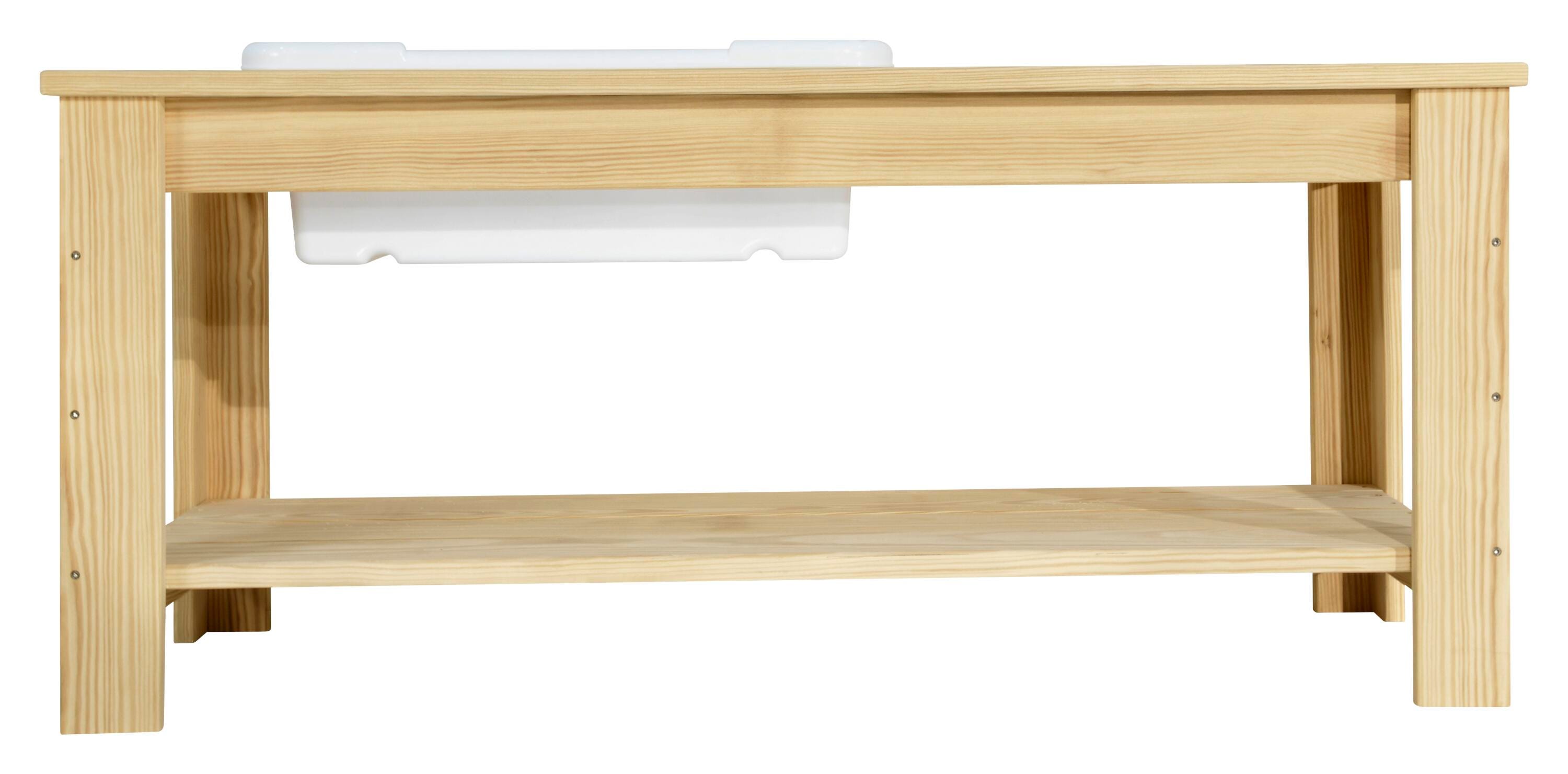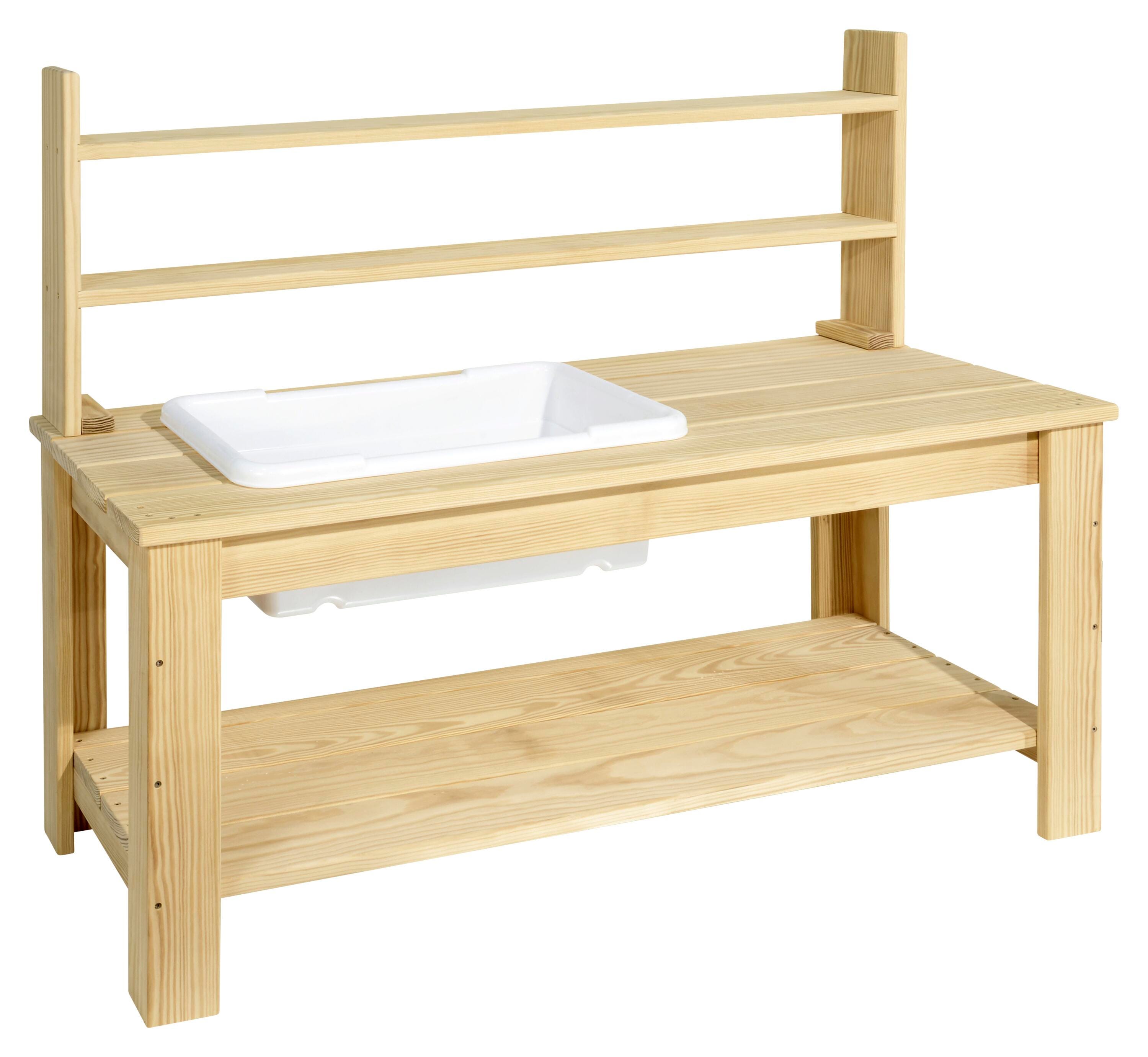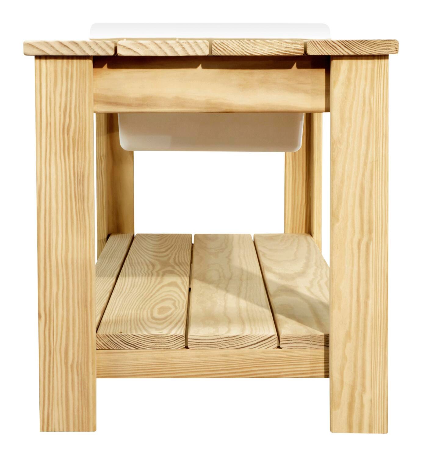 Description Provide a natural place to play or garden for your kids outside with the Wood Designs™ Farmhouse Sink. This kid-sized farmhouse sink features a large removable white liner with ample space to get your hands dirty on top and a lower shelf to store and display all your backyard playthings. Frame measures 54 W x 22-1/2 D x 24 H inches, and plastic tub measures 24-3/4 W x 15 D x 8 H inches. The Farmhouse Sink comes fully assembled.Features GREENGUARD Gold certified Constructed with acetylated wood that resists shrinking, warping, and rotting Edges and corners rounded for safety Stainless-steel hardware 10-year warranty/Plastic tub 1-year warranty Includes: Frame for Farmhouse Sink White Plastic Tub