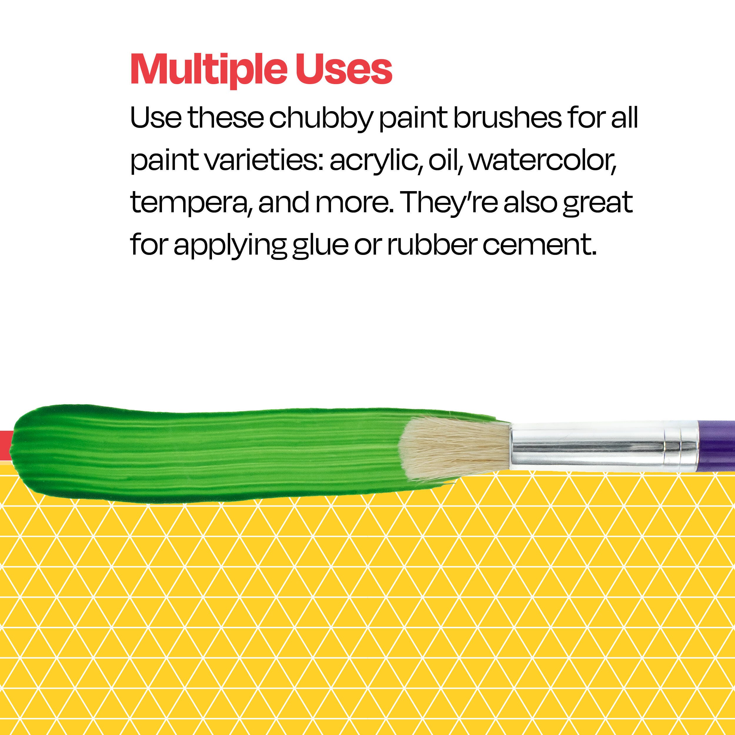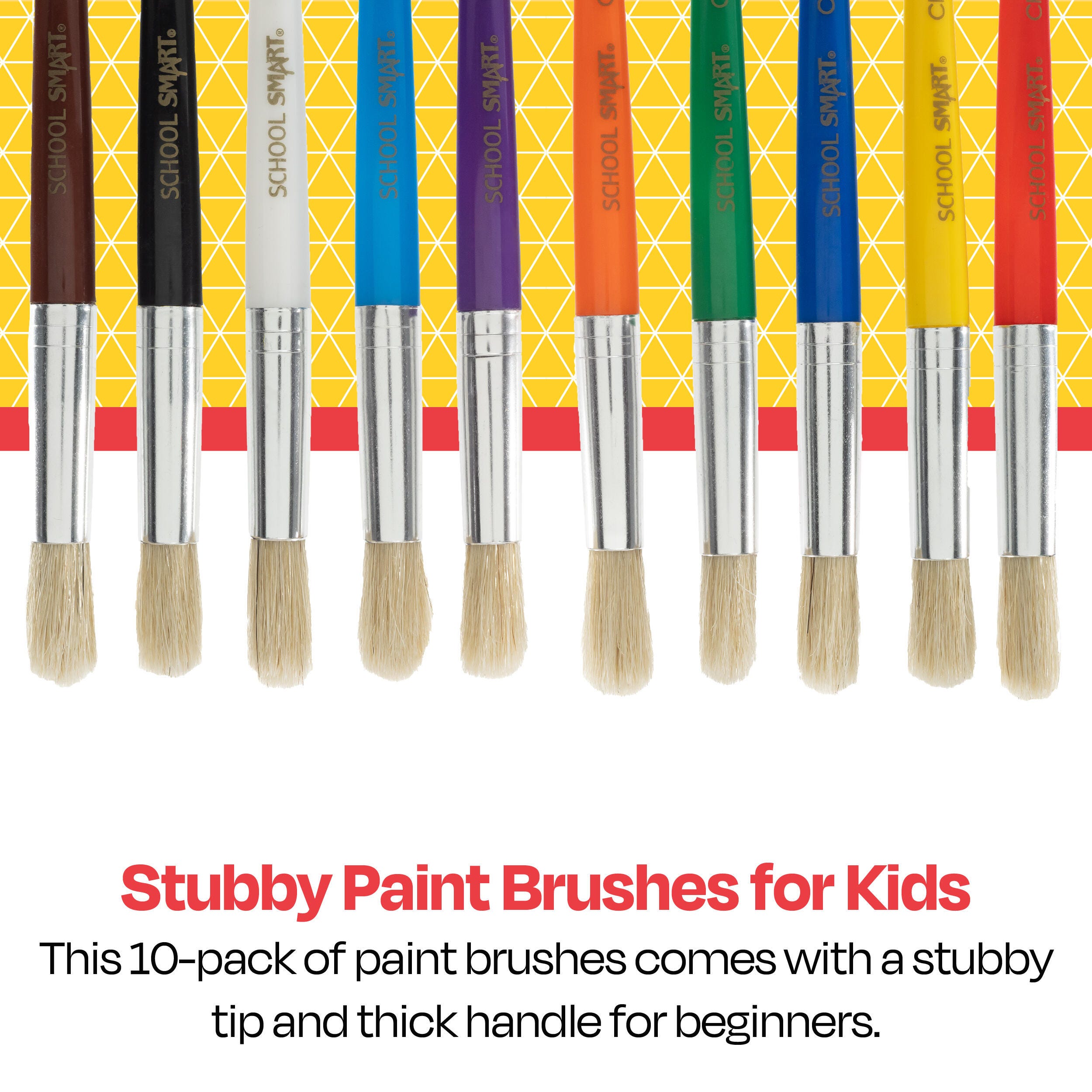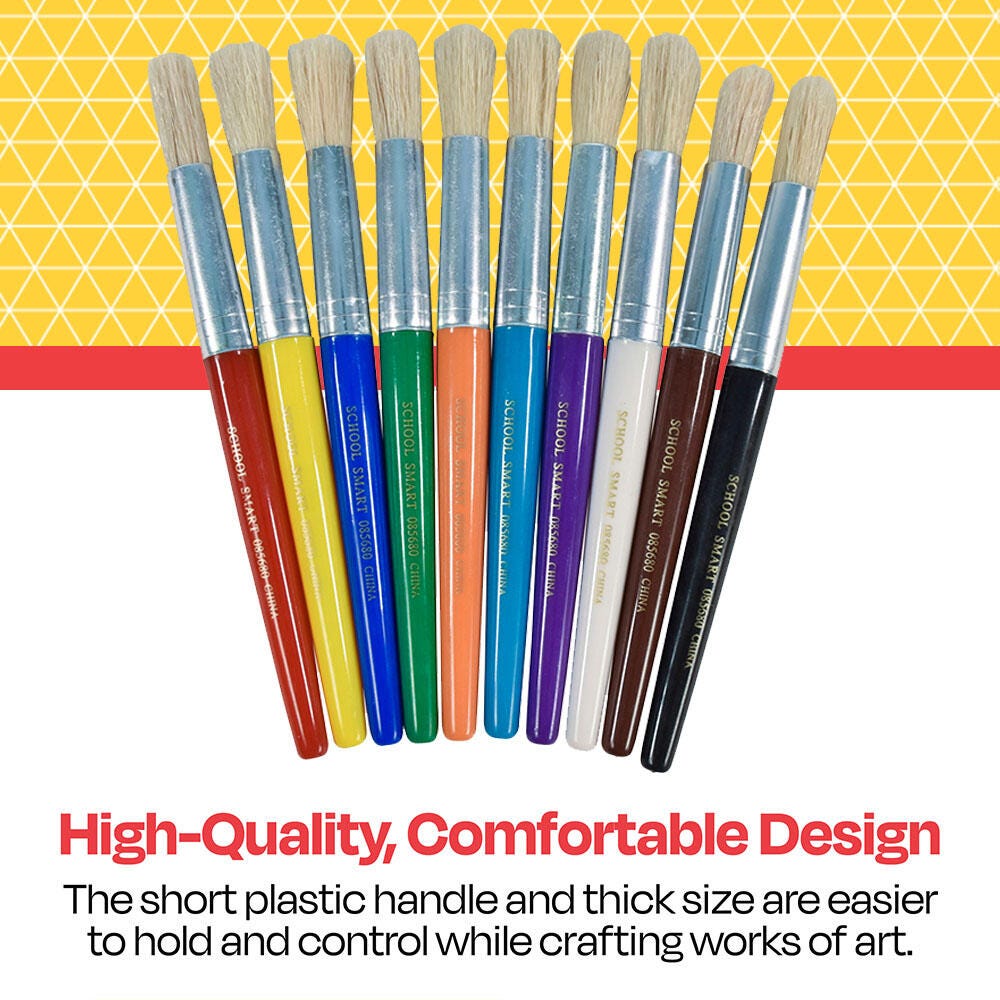 Description These easy-to-use School Smart stubby paint brushes are jumbo-sized and kid-friendly paint brushes. Young artists and beginners love the comfortable size and fun assorted colors. You can use the children’s chunky paint brush for indoor or outdoor learning, exploring different painting techniques, color mixing, free-form creativity, and everything in between. This pack of classroom paint brushes contains 10 art brushes in assorted colors, each measuring 7-1/2 inches long.