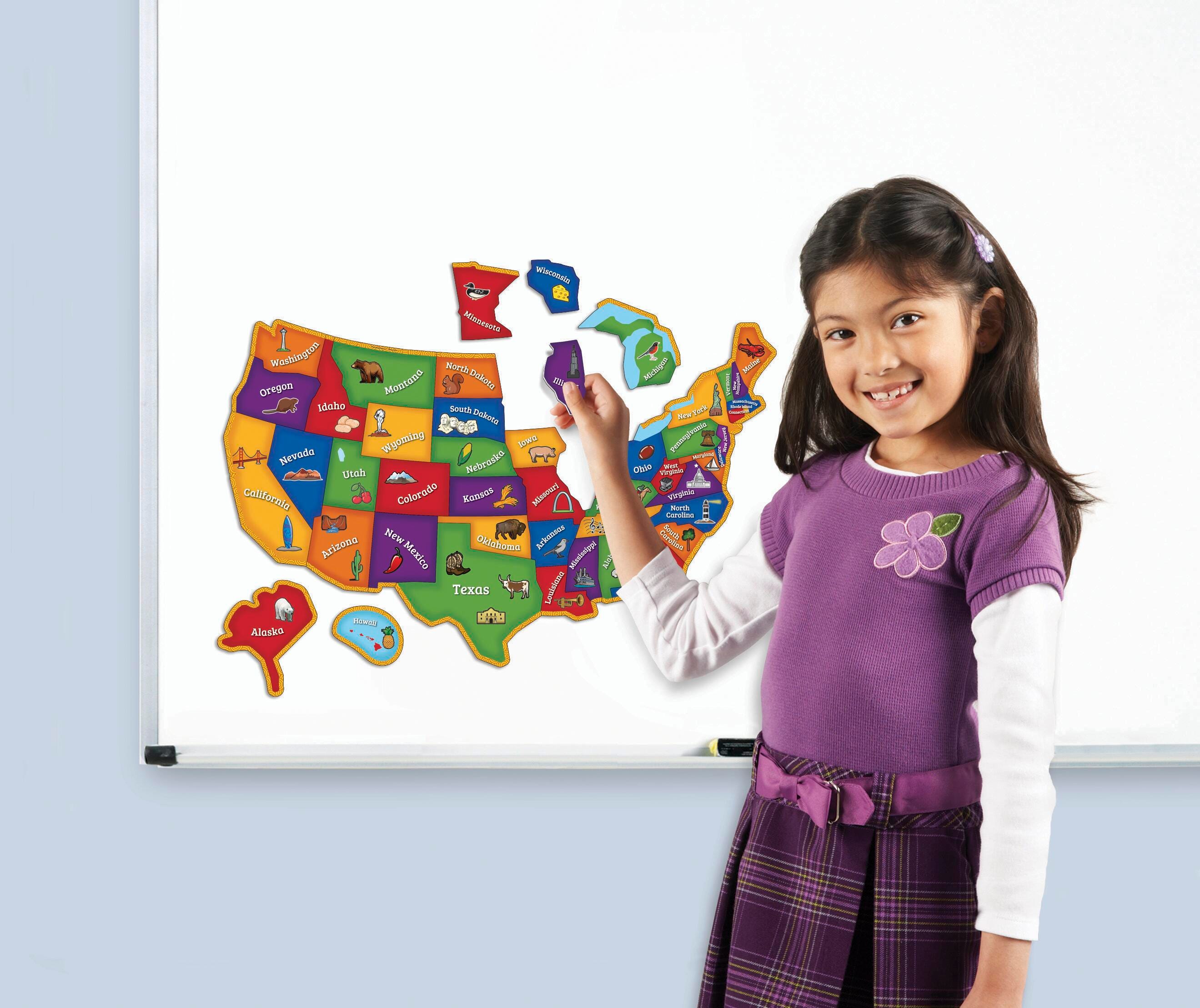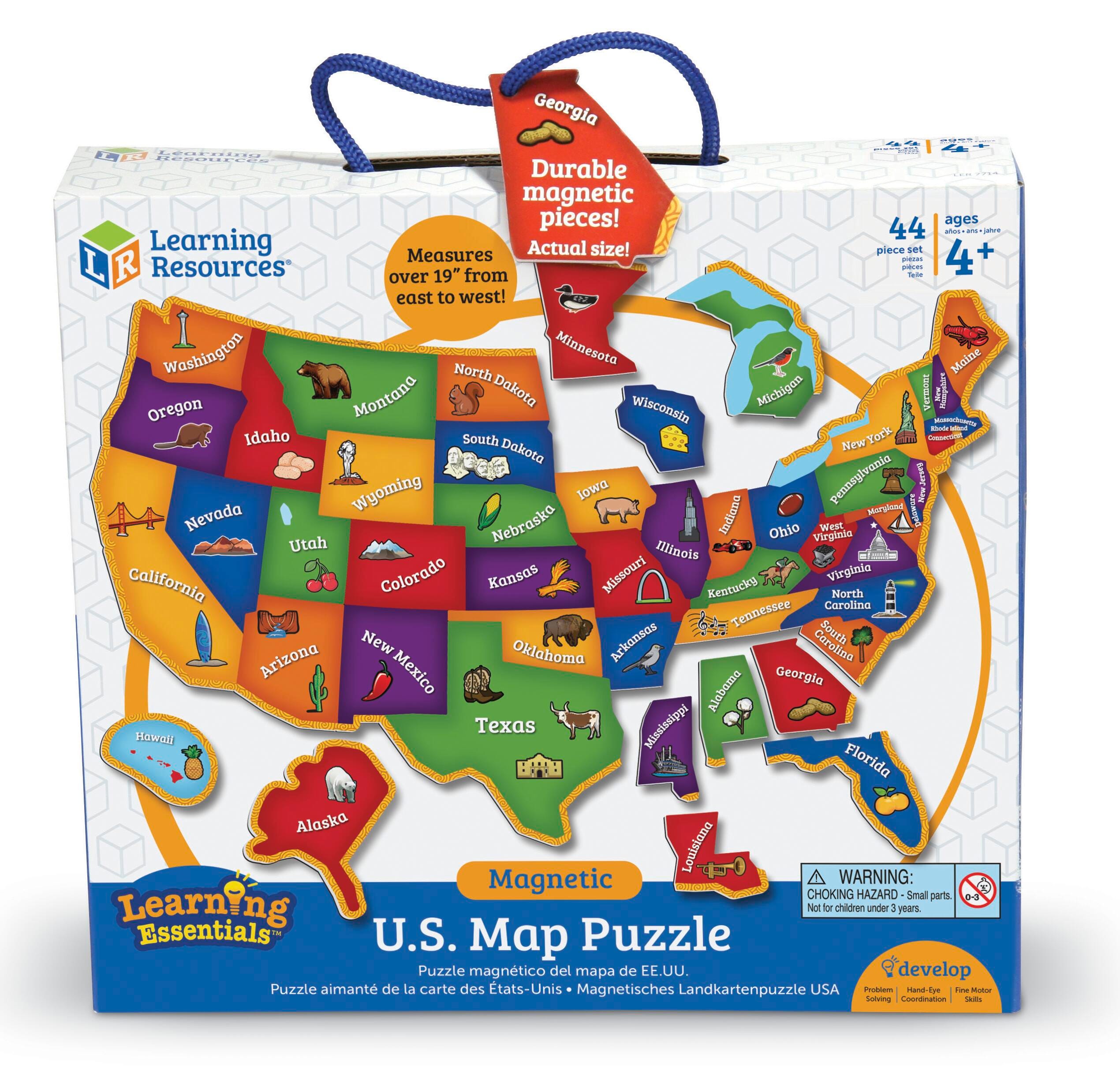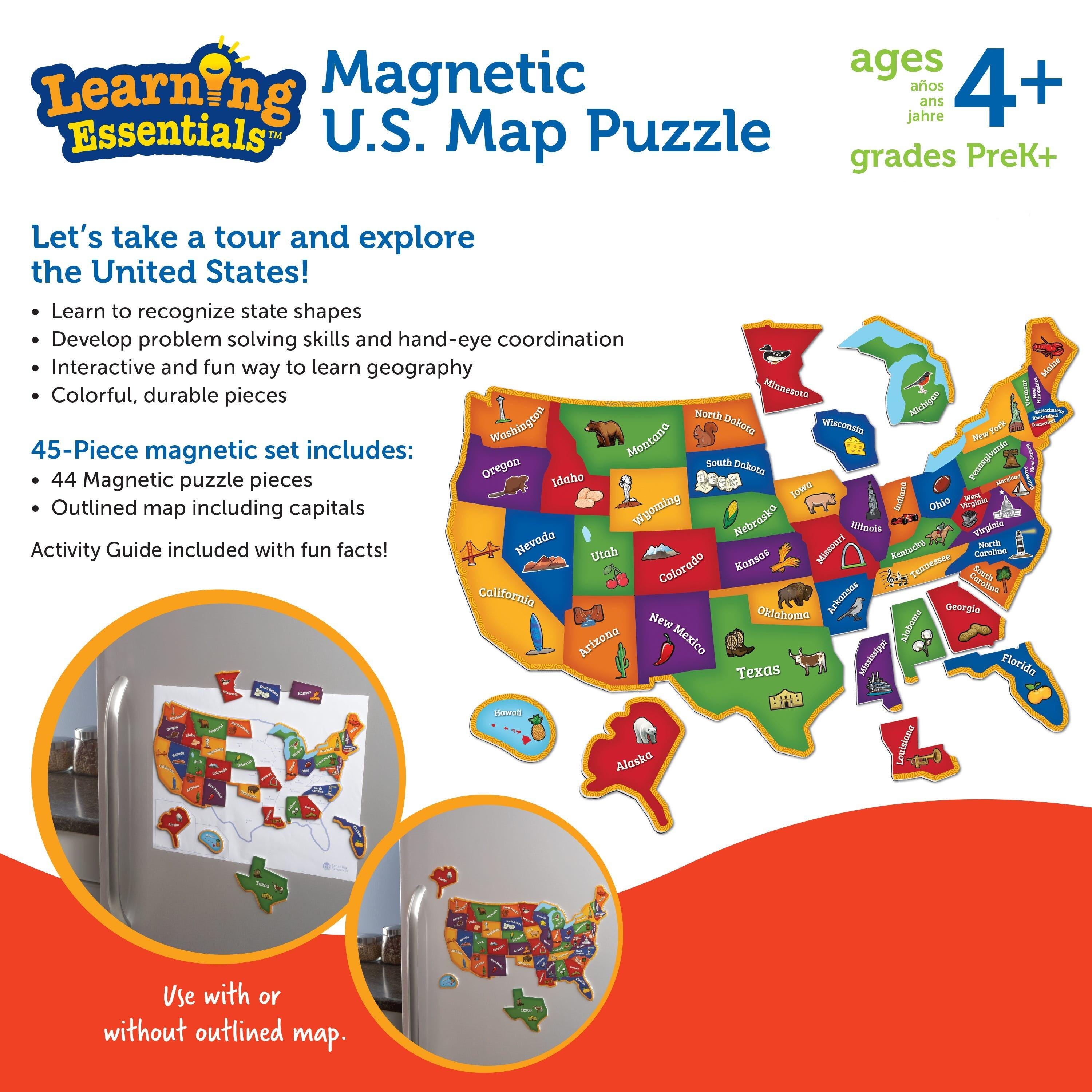 Description Build early geography and fine motor skills with this interactive puzzle map. These durable, magnetic pieces include state names, landmarks, plants, animals, and more. Perfect for school or home. Includes 44 pieces with an outline to help guide proper placement. Measures 19 L x 13 H inches.Features A fun, interactive way to learn about geography Develops fine motor, critical thinking and spatial relations skills A great addition to early learning programs