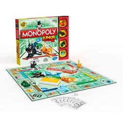 Hasbro's Monopoly Jr. Game includes gameboard, 4 tokens and 20 chance cards, 48 sold signs, 90 banknotes, 4 character cards and 1 die. It is patterned in a way that children can love and understand. Pass go, take a chance card, and you might just build the property of your dreams... or you might end up in jail! Whatever happens, it's fun all the way to the top. The player with the most money wins the game.Includes: Gameboard, (4) Tokens, (20) Chance Cards, (48) Sold Signs, (90) Banknotes, (4) Who's Your Token? Character Cards and (1) Die