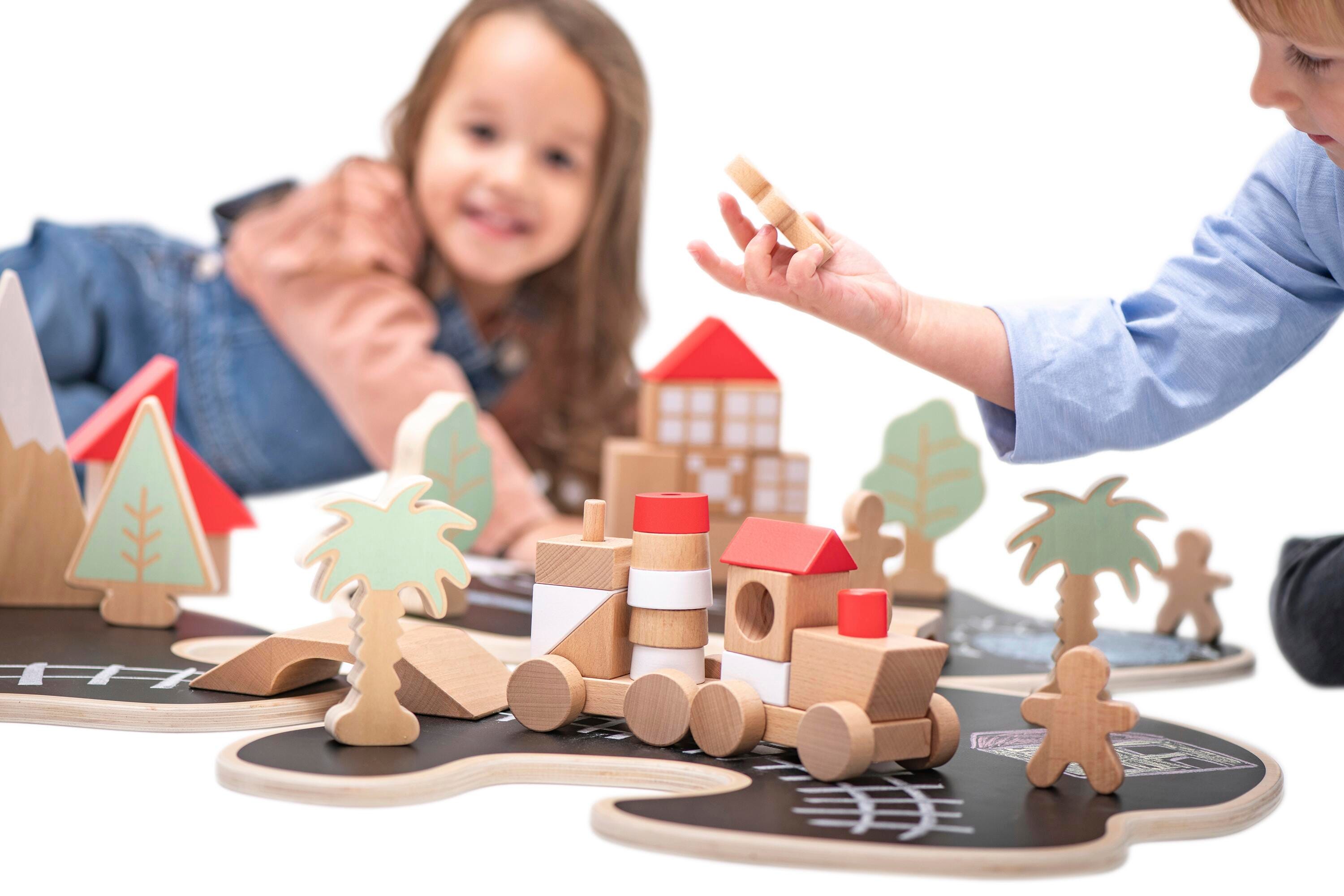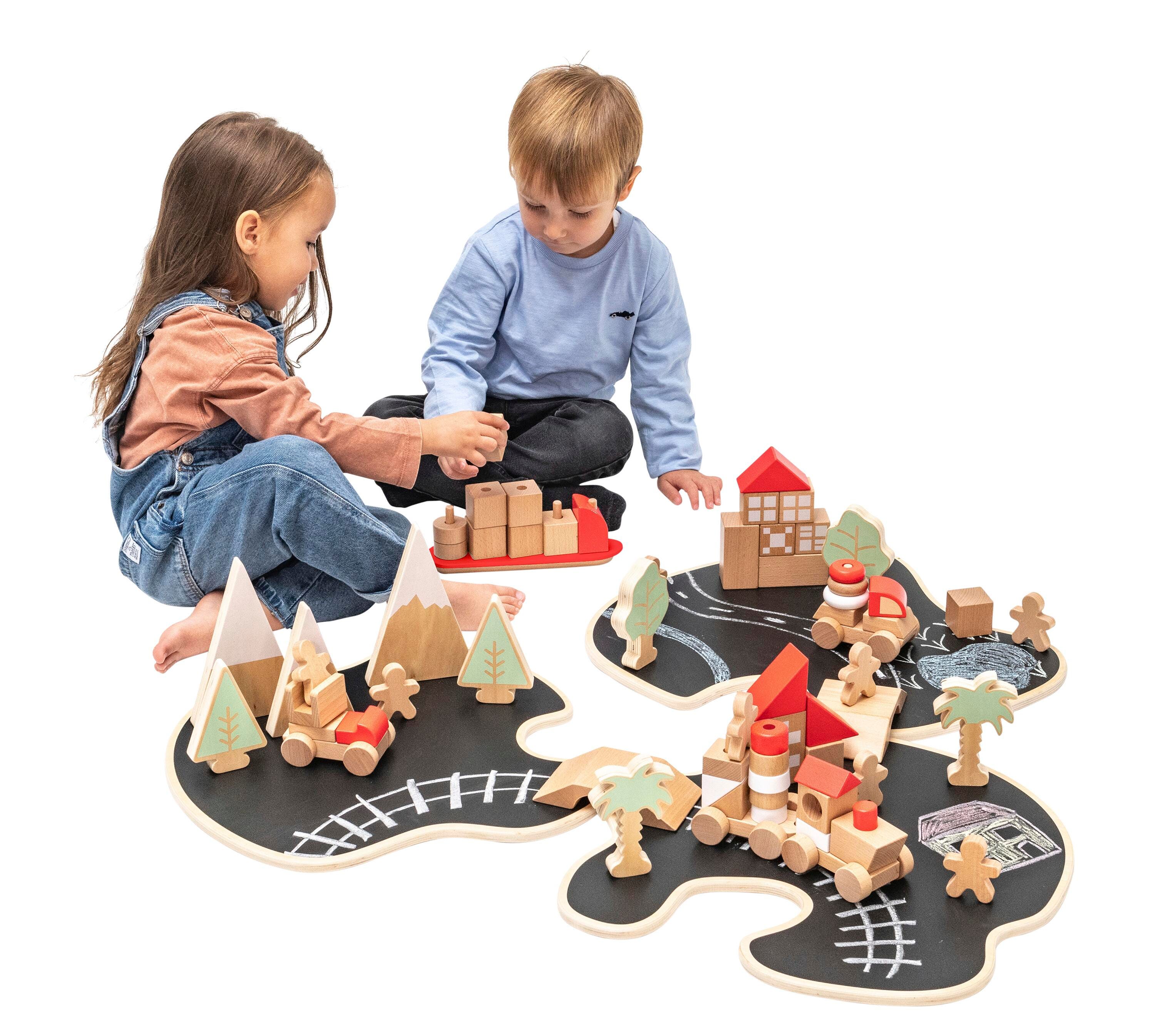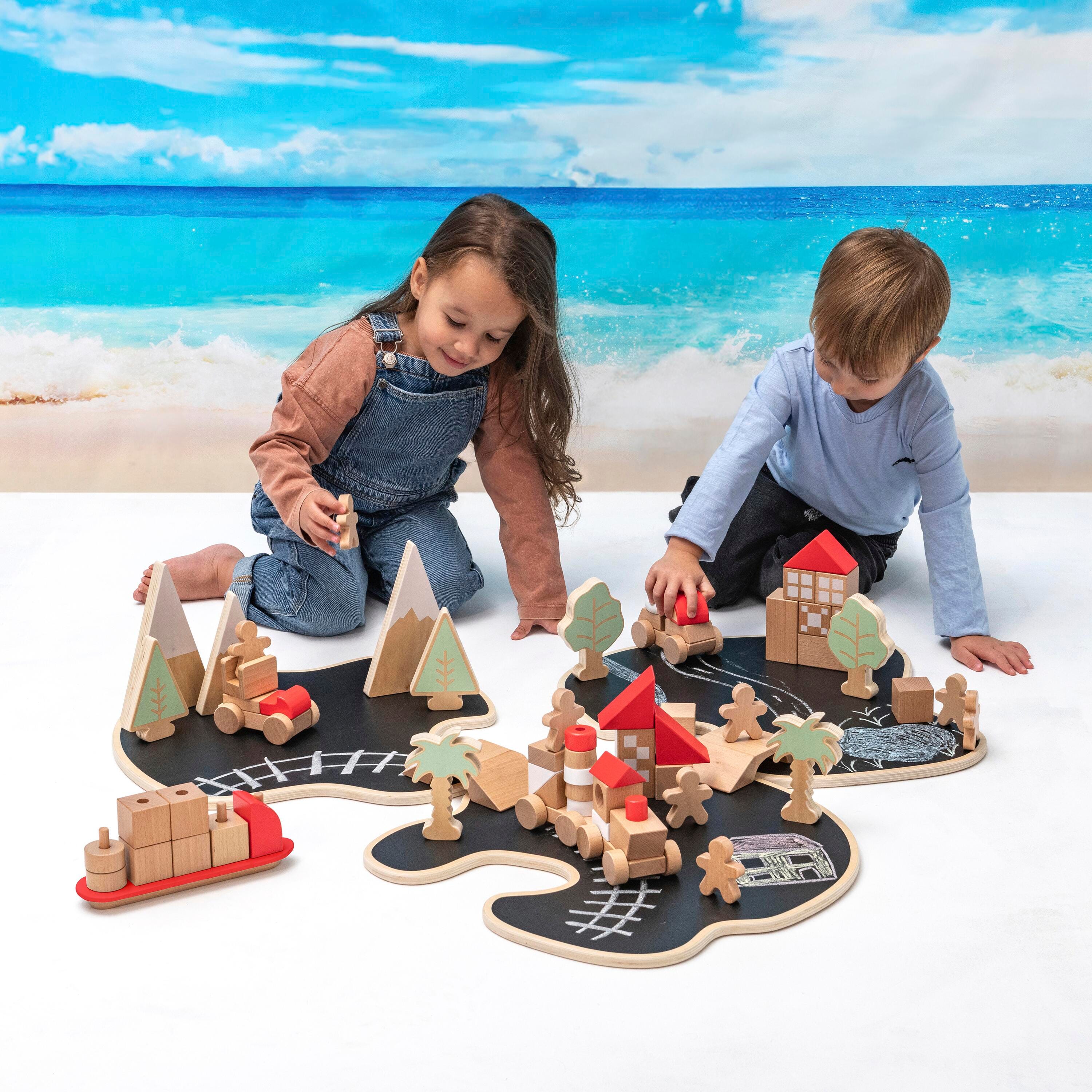 This adorable Story Island set of manipulatives can ignite imagination and collaboration as children bring small worlds to life. This set includes 3 islands that have a chalk-friendly surface that allows children to draw and design the pieces of their world like houses, roads, shops, rivers, and more. The cars, boats, and trains encourage imaginative role play as children create different events and situations across the islands with their friends. The mountain and tree pieces add dimension and a natural touch to their imagined environments. This set includes a total of 68 pieces, with 3 Islands, 3 Mountains, 2 Bridges, 6 Trees, 8 Gender Neutral People, 12 House Blocks, 2 Cars, 1 Boat, 1 Train, and 30 blocks for building.Features