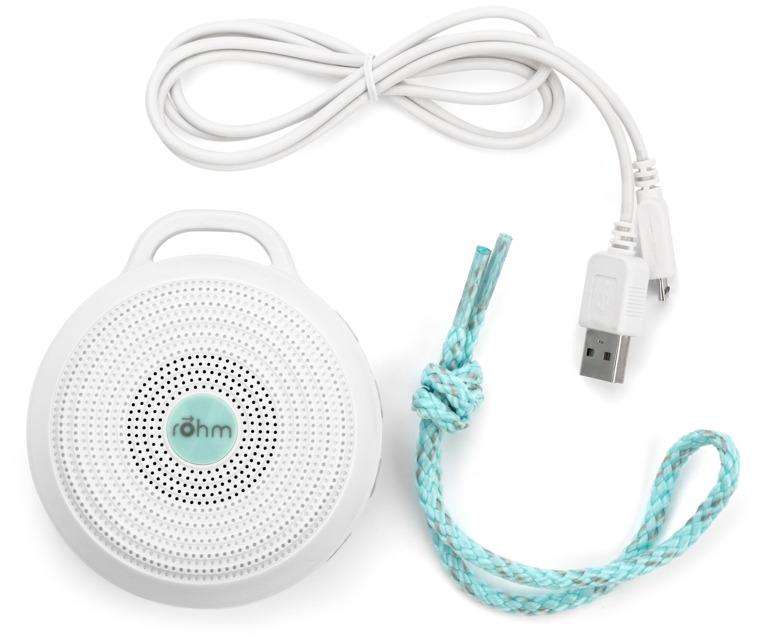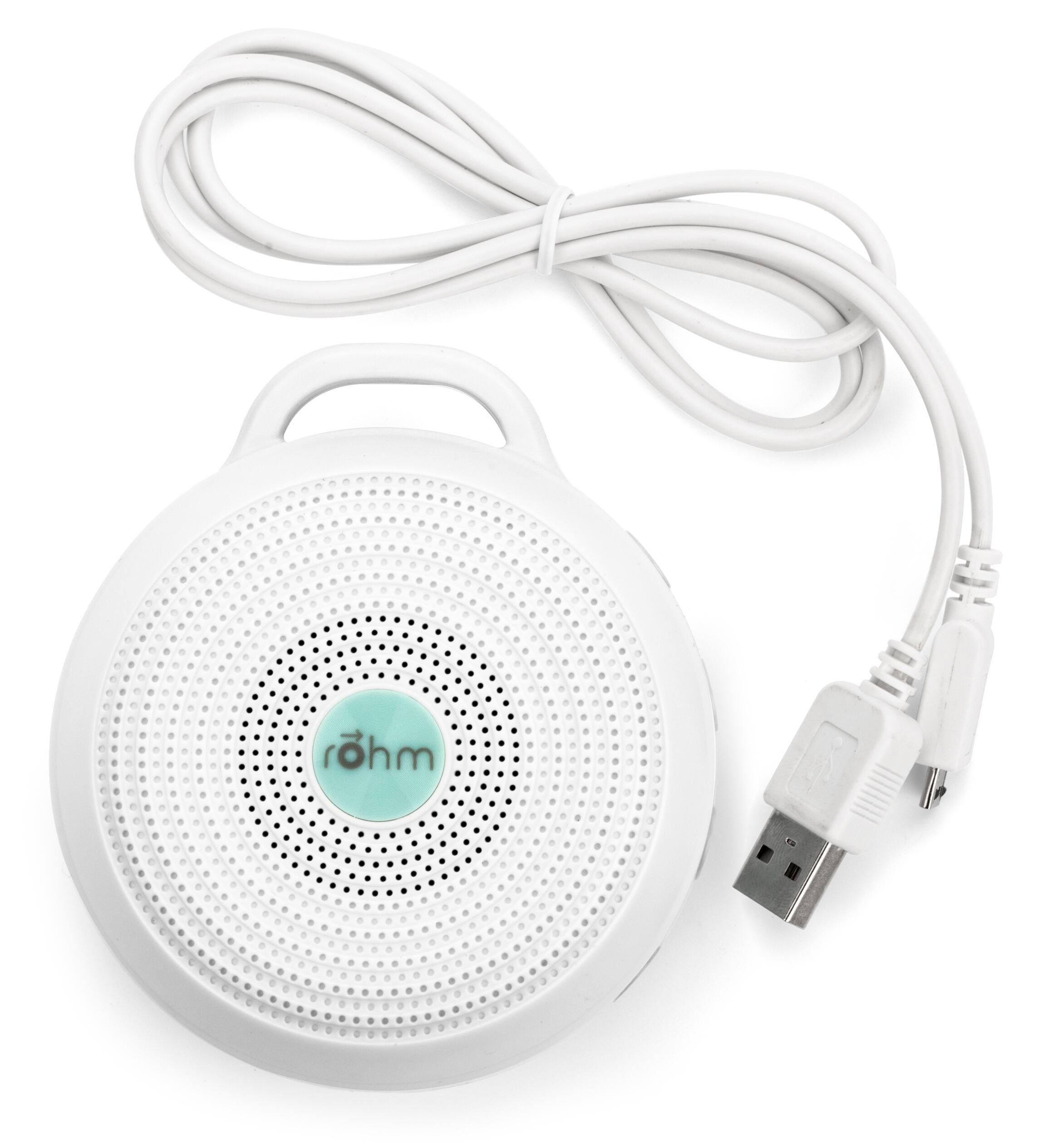 Portable sound machine is designed to mask noises anywhere, at any time. Rohm creates a soothing, consistent sound environment for sleep, privacy, or concentration. Features three sound options proven to promote sleep and mask noise: bright white noise, deep white noise, or gentle surf. Rechargeable battery.