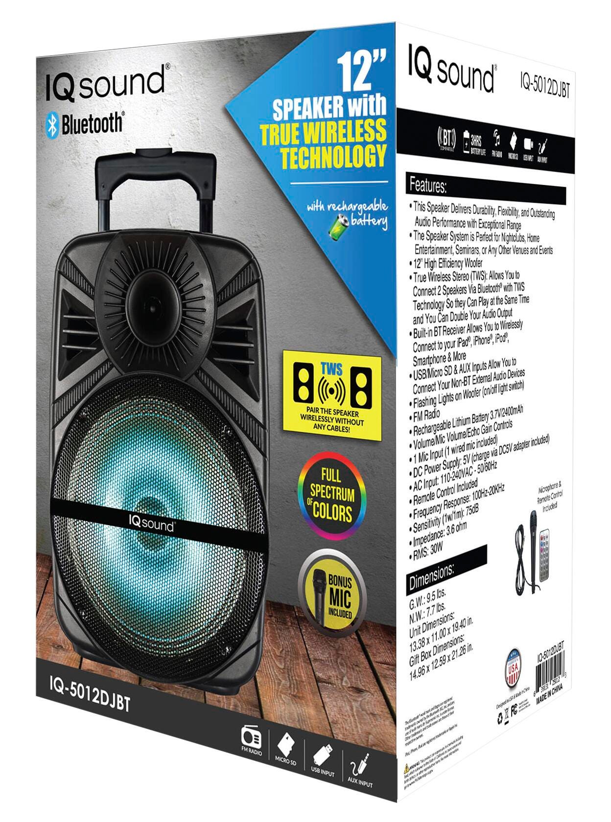 This speaker delivers durability, flexibility, and outstanding audio performance with exceptional range. Perfect for home entertainment, seminars, or any other venue and event. True Wireless Stereo (TWS) allows you to connect 2 speakers via Bluetooth with TWS technology so they can play at the same time and you can double your audio output with the 12 inch high efficiency woofer. The built-in BT receiver allows you to wirelessly connect to your iPad, iPhone, iPod, smartphone and more, and the USB/Micro SD and AUX inputs allow you to connect your non-BT external audio devices.Includes: