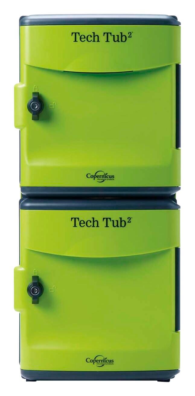 This Tech Tub2 offers an affordable, flexible and mobile solution for charging and storing devices used in PreK-8 classrooms. This Tub stores up to 10 iPads, depending on case size. Store, charge and carry your devices anywhere in the school with ease with two ergonomic handles on the door and back as well as a flip-up handle on the top. They are ideal for schools that share devices or for one on one environments. They can clip and move together like a 10 device Tub or can be two separate 6 device Tub, with easy access tray for device USB-C 20W adapter and power strip and 3 point lock with 2 keys. Internal 10 outlet power strip with surge protection (USB-C 20W Adapter) charges 6 devices (1 without a case) or 5 devices with cases. 10 outlet power strip is included to allow for enough space for the new, larger Apple Adapters.