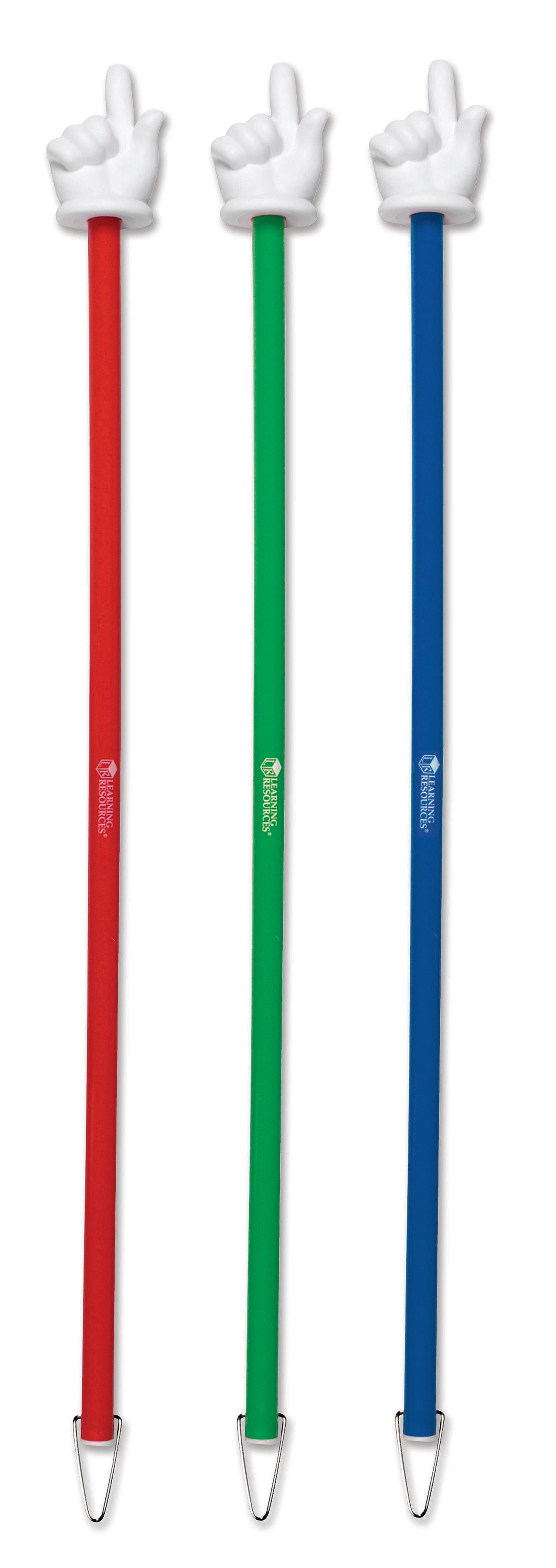 Description Learning Resources Hand Pointers are whimsical instruments that generate positive behavioral support and make students eager to participate. Use with whiteboards, pocket charts, maps, and more. Young students reach farther with 24 inches. Colorful hands are easy to see against whiteboards! Ages 3 and up.