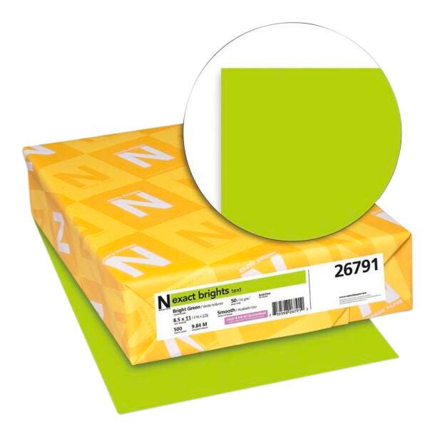 Description This Bright Green Multi-Purpose Colored Paper from Exact is ideal for use with standard printers, standard and high-speed plain paper copiers, duplicators, and mimeograph machines. Great for creating posters, flyers, and signs that pop in vibrant colors. Sold with 500 sheets per pack. Each sheet measures the standard 8-1/2 x 11 inches.Features Environmentally friendly, 30% recycled post-consumer waste content Laser, inkjet, copier guaranteed Perfect for any classroom or office application Attention getting 20 lb smooth finish bright paper