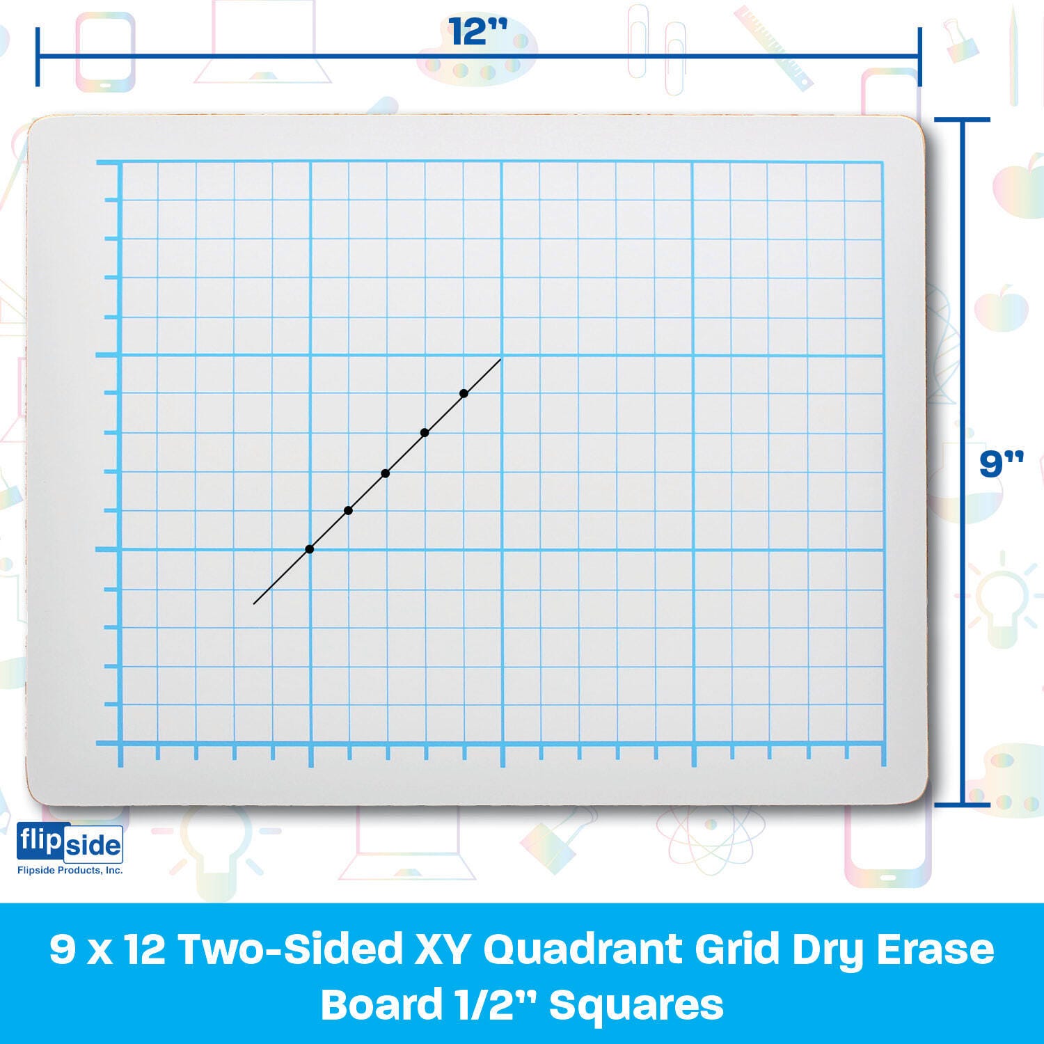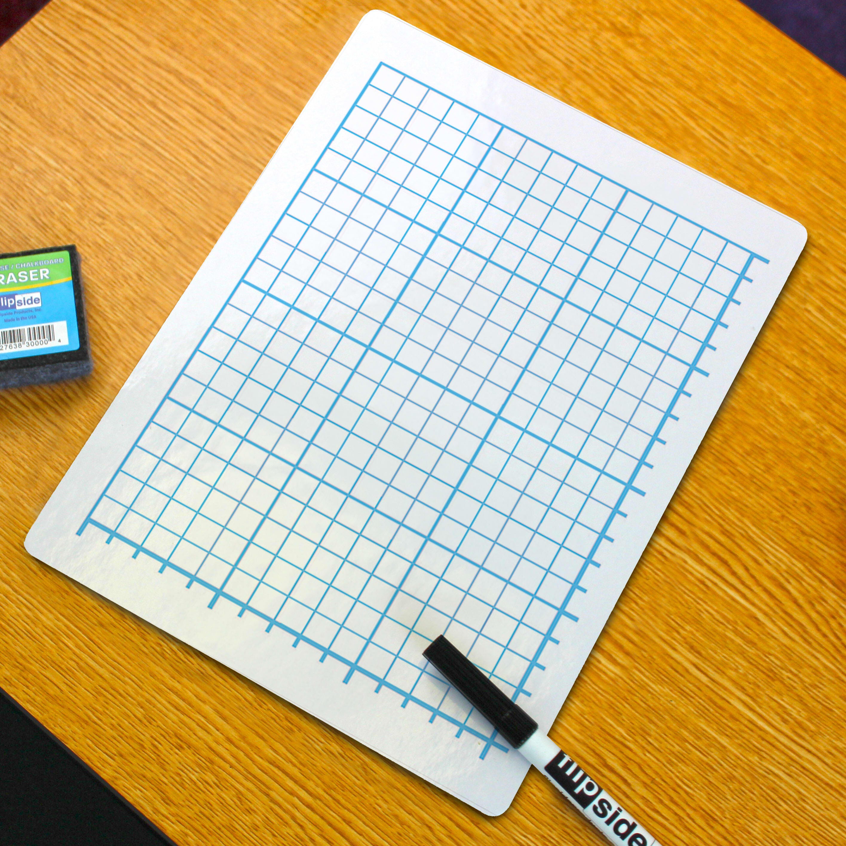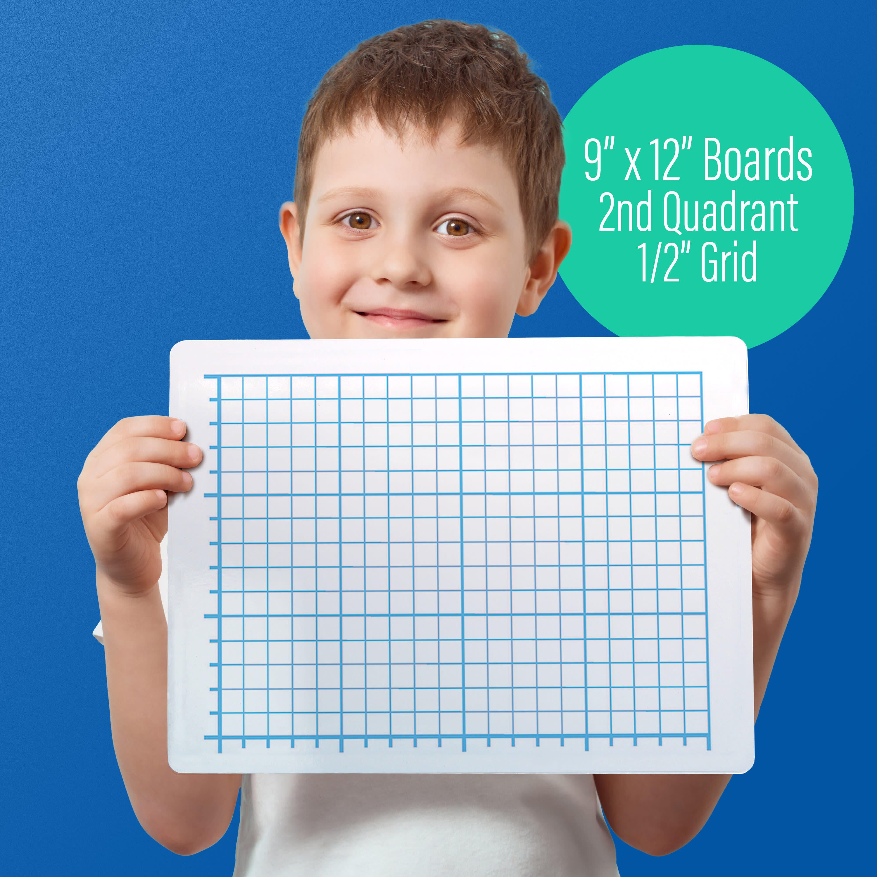 Quadrant Grid Dry Erase Board is ideal for bar graphs, line graphs, pictographs and more! Two-sided board features a 15 row by 20 column grid of 1/2 inch squares in Blue on white surface. Bold lines marking every 5th row or column help students stay organized while learning to graph. Back side is plain white dry erase surface. Rounded corners and smooth edges for safety and comfort. Hardboard backing will not warp or chip. Board measures 12 inch wide x 9 inch high x 1/4 inch deep. Class Pack of 24.