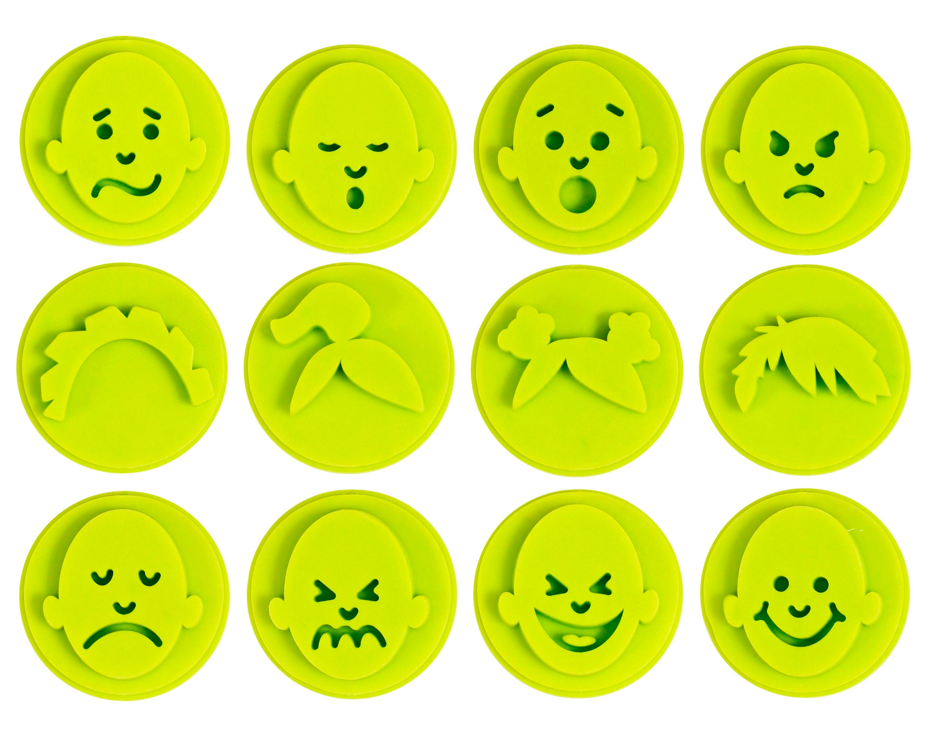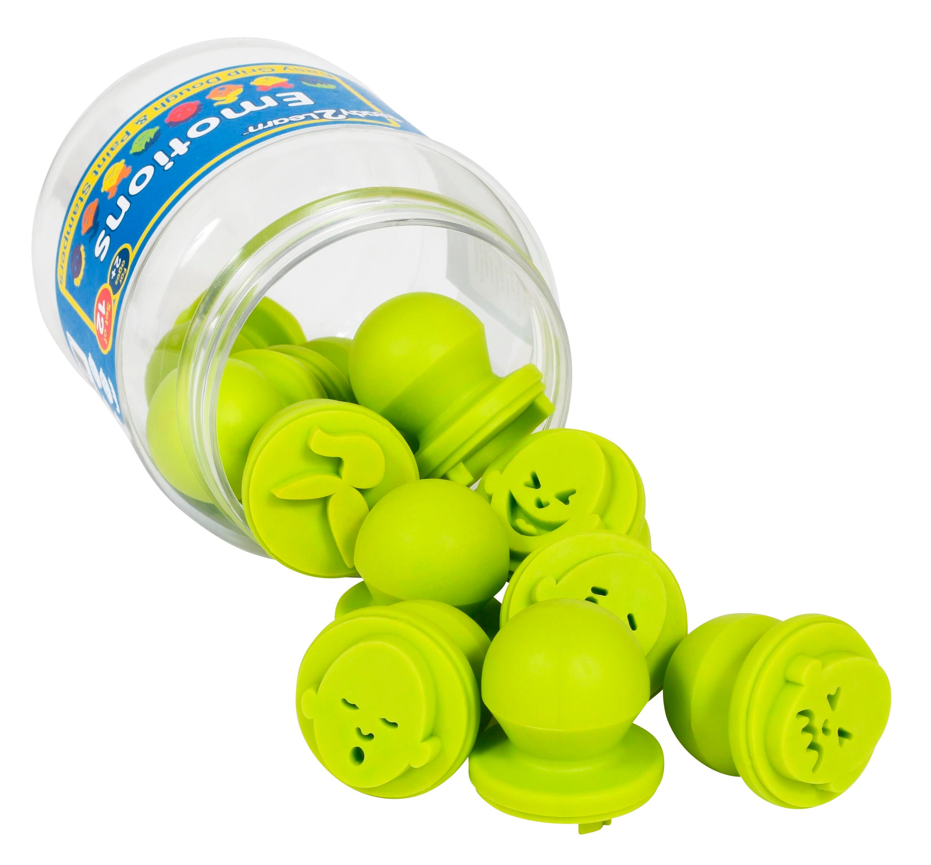 This set includes 12 emotion-themed stampers with 8 faces and 4 diverse hair styles. Mix and match the stamps to create a variety of emotions and characters. These stampers feature round, easy-to-grip handles that nest comfortably in small hands. An ideal tool for toddlers and special needs children, these stampers provide greater fine motor control as children make patterns in clay, dough or paint. Emotion stampers inspire young children to explore mindfulness, emotions and empathy. Encourage children to express their emotions and feelings with this hands-on, social-emotional resource. The stampers also encourage descriptive language and imagination as children craft and create new narratives. When craft time is over, easily clean the stampers with warm water and soap. The stampers are packaged in a plastic jar with carry handle. For ages 2+. Size: 1.75"H x 1.5" dia.