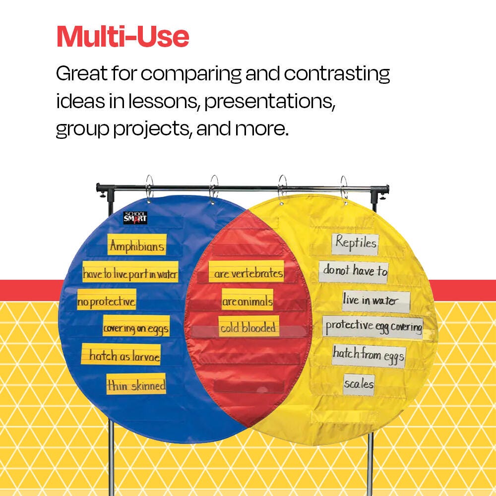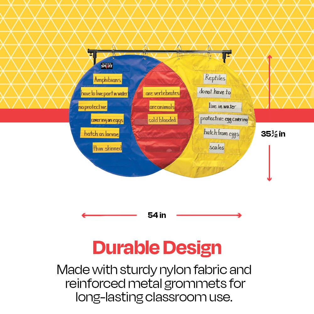 The School Smart Venn diagram pocket chart is a simple and effective way to visually reinforce classification and graphic organization lessons. This chart is great for cross-curricular subjects and group sharing, comparisons and contrasts between two things, group presentations, and more. This pocket chart features bold primary colors, including red, yellow, and blue. Grommet rings across the top allow for easy hanging (stand is sold separately). The full pocket chart measures 35-1/2 L x 54 W inches and has 23 durable plastic pockets.
