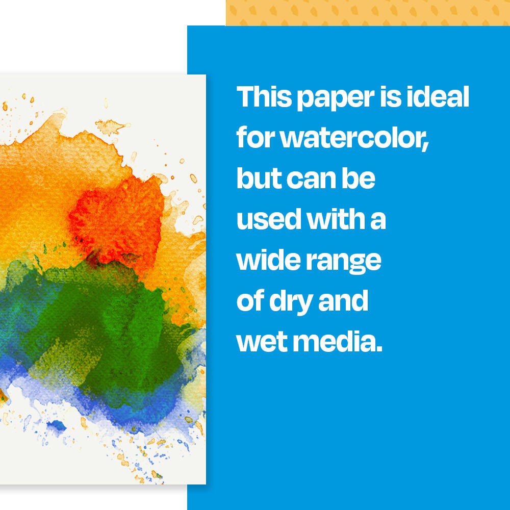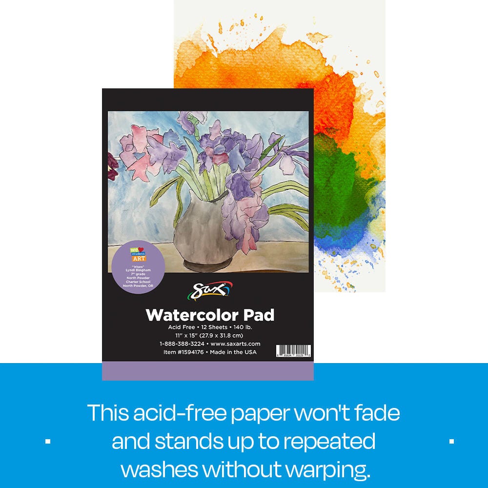 Description The Sax Watercolor Paper Pad is the perfect option for students practicing their technique. The paper is specially designed to hold up to repeated washings during watercolor projects and is also suitable for use with dry mediums. This pad offers 12 sheets of 140-lb basis-weight watercolor paper with an acid-free construction that resists fading. Each sheet measures 11 x 15 inches.Features Acid-free construction for longevity and fade resistance Sized perfectly to create landscapes, cityscapes and elaborate scenes Durable front and back covers protect your work during storage and transport Heavy-weight construction makes this paper ideal for use with watercolors but can be used with a variety of other mediums for versatile application Great for watercolor painting projects in studios, art classes and homes Includes: 1 Pad of Watercolor Paper