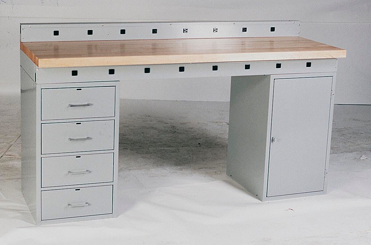 Flexible Montisa 1-Station Electronic Bench in gray measuring 72 in x 24 in x 36-3/4 in and has a 3/8 in thick hard phenolic top and bottom over a 1 in particle board. The single door base with an adjustable shelf measuring 18 in x 21 in x 31 in features 4 drawers with each drawer measuring 14-3/4 in x 19-1/2 in x 5-5/8 in. It also includes 4 in apron and a wiring tunnel with wire receptacles.Features