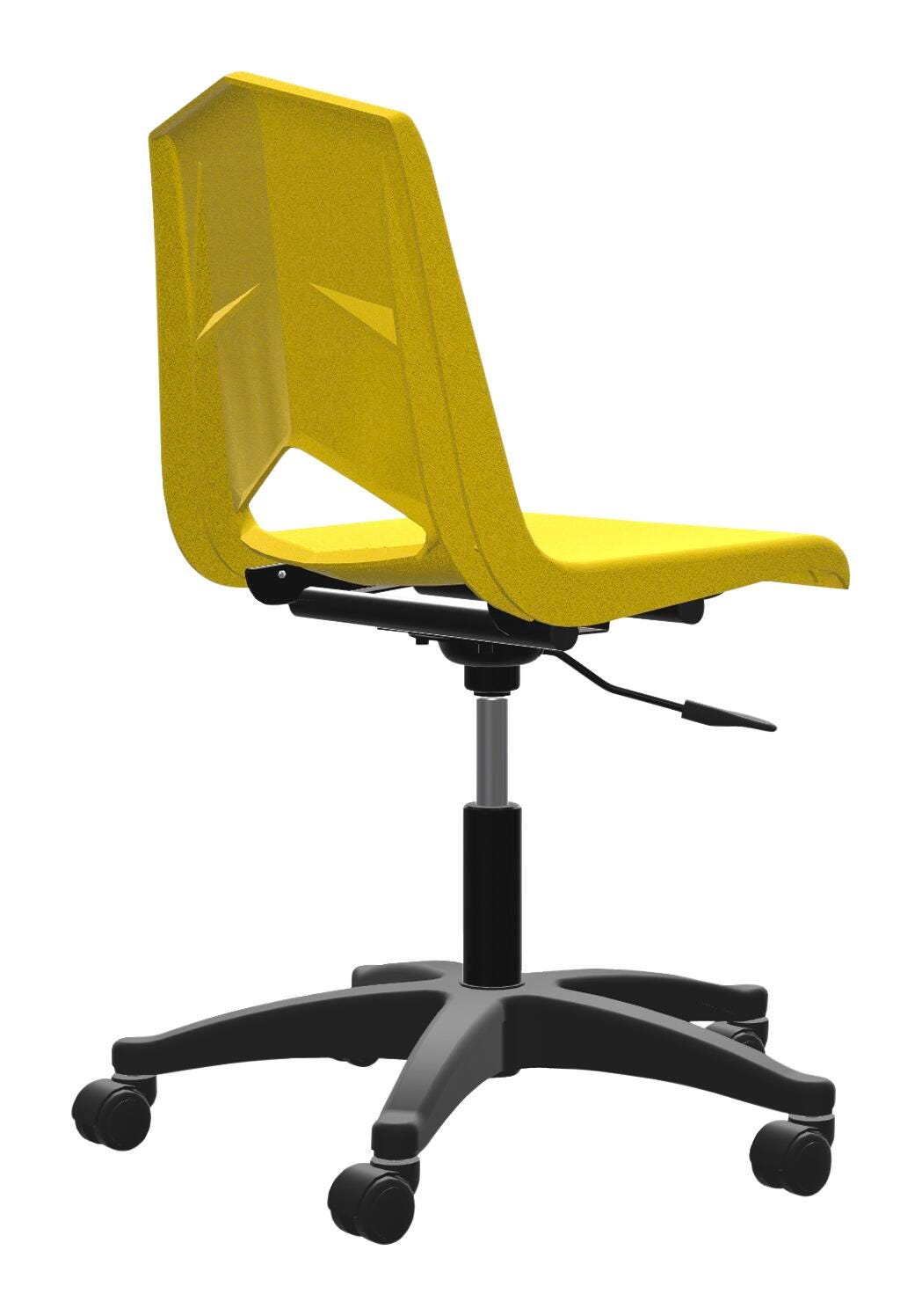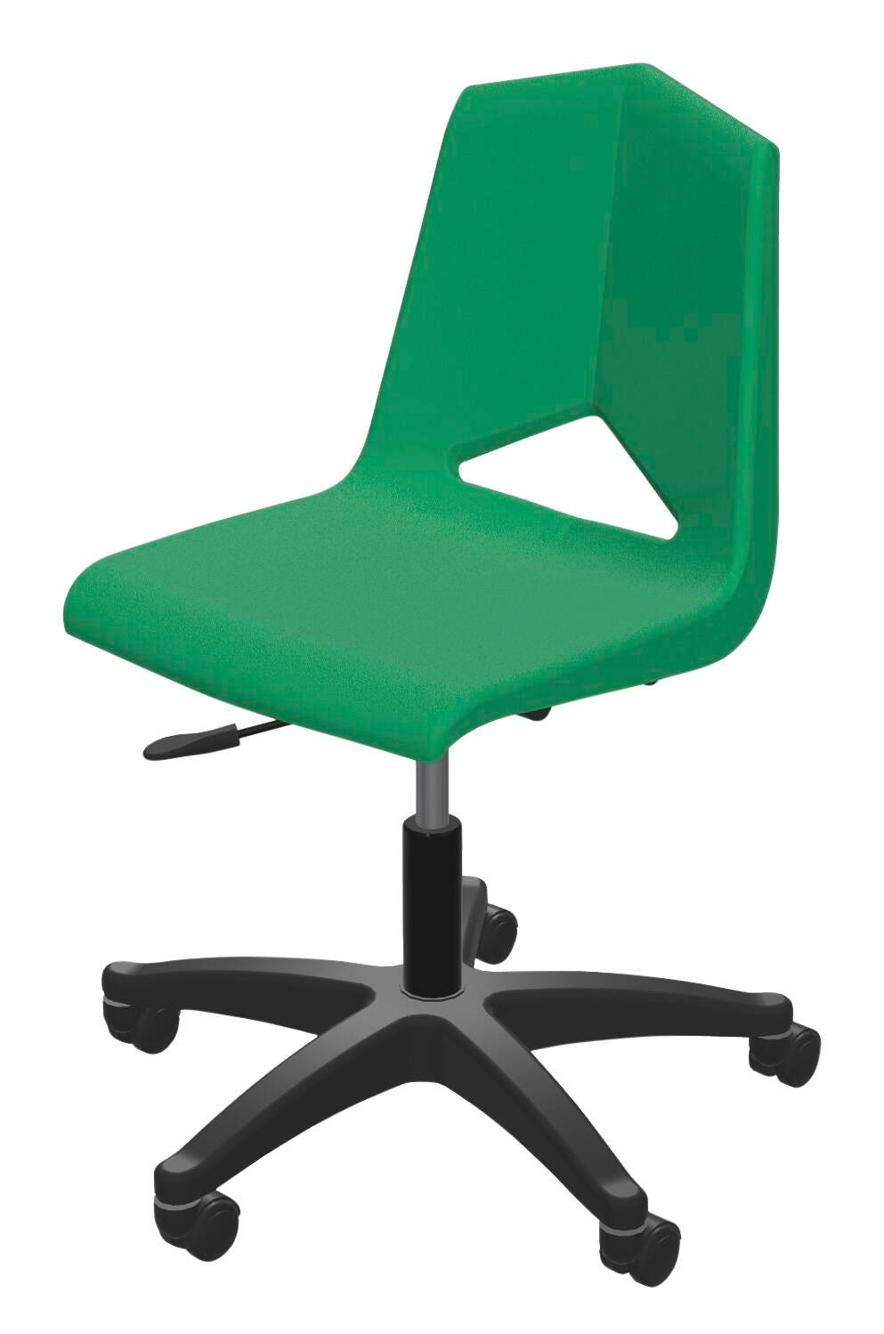 The Royal Seating 1100 pneumatic lift chair has the same features as the Royal Seating 1101 model; however, this has the additional benefits of easy height adjustment and mobility. This makes the chair a great addition to classrooms, offices and computer labs. It has a one-piece, extra-large, high-density polypropylene shell that is mounted onto a 5-star base with 2-inch dual wheel casters. A side lever adjusts the height pneumatically from 17-3/4 to 22-3/4 inches for ergonomic comfort. Chair swivels 360 degrees.Includes: