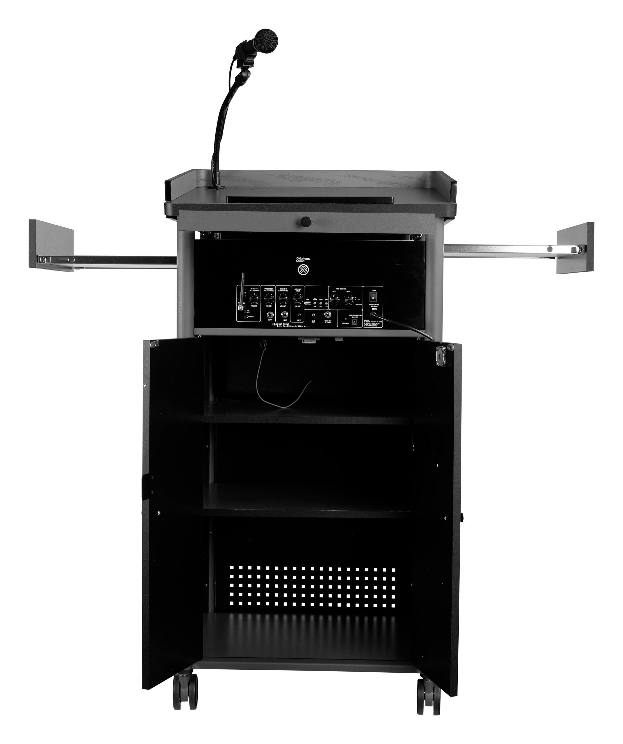 The Greystone Lectern with sound from Oklahoma Sound is far more than just a basic lectern. This elegantly designed unit offers an all-in-one presentation experience. Large reading surface (22-3/4W x 18-1/4D inches), two side pull-out shelves (14-1/4W x 12D inches), and a sliding keyboard tray (17-1/2W x 9-1/4D inches) provides for a complete multi-media presentation experience. Designer curved grey plywood adds a sophisticated look. The cabinet includes three large shelves plus an oversized front drawer for ample storage. 2-1/2 inches hooded twin wheel matching casters makes for easy mobility. Elegance & functionality for all your presentation needs.