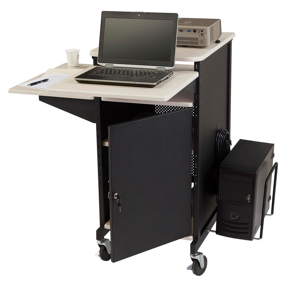 Oklahoma Sound Jumbo Plus Presentation Cart built from an 18-gauge black steel frame on an attractive ivory wood grain finish offers ample storage and display of A/V equipment like laptops, projectors and document cameras. Presentation cart features extra-large work surface and wide adjustable side shelf that helps in easy setup for all presentations and includes a 6 outlet power strip with a 20 foot cord, an adjustable side shelf and a CPU holder. Presentation cart has spacious locking storage cabinet with an adjustable/removable middle shelf that protects A/V equipment. Presentation cart smoothly moves on 4 inch heavy-duty casters (two locking) and includes wire management and grommets that assists in simplifying the presentation.