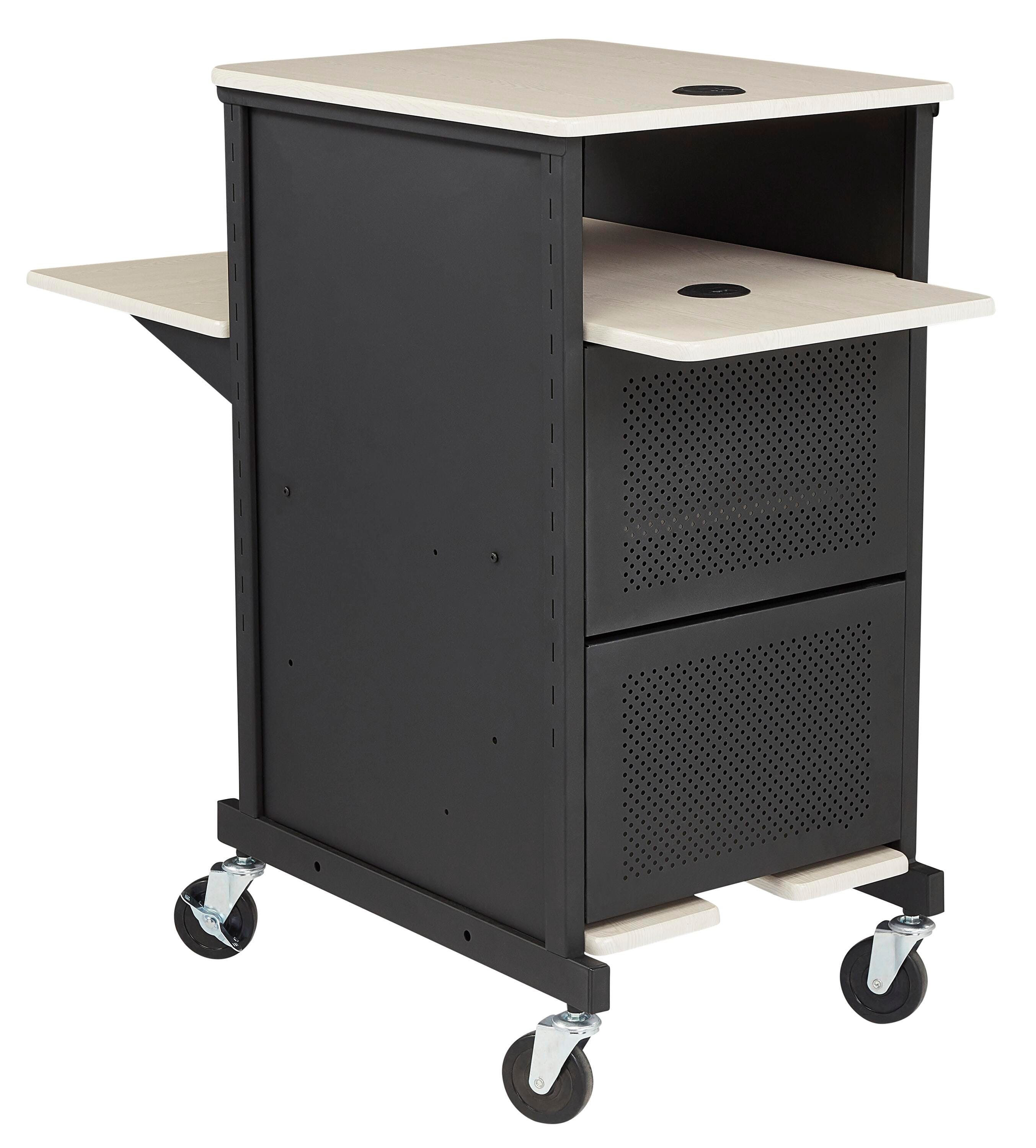 Oklahoma Sound Jumbo Presentation Cart is made of 18-gauge black steel frame on an attractive ivory wood grain finish. Multifunctional wide presentation cart provides extensive storage and display of A/V equipment like laptops, projectors and document cameras. Presentation cart features locking storage cabinet with an adjustable/removable middle shelf to protect the valuable A/V equipment. Presentation cart includes 4 inch heavy-duty casters (two locking) to provide smooth mobility, wire management and grommets.