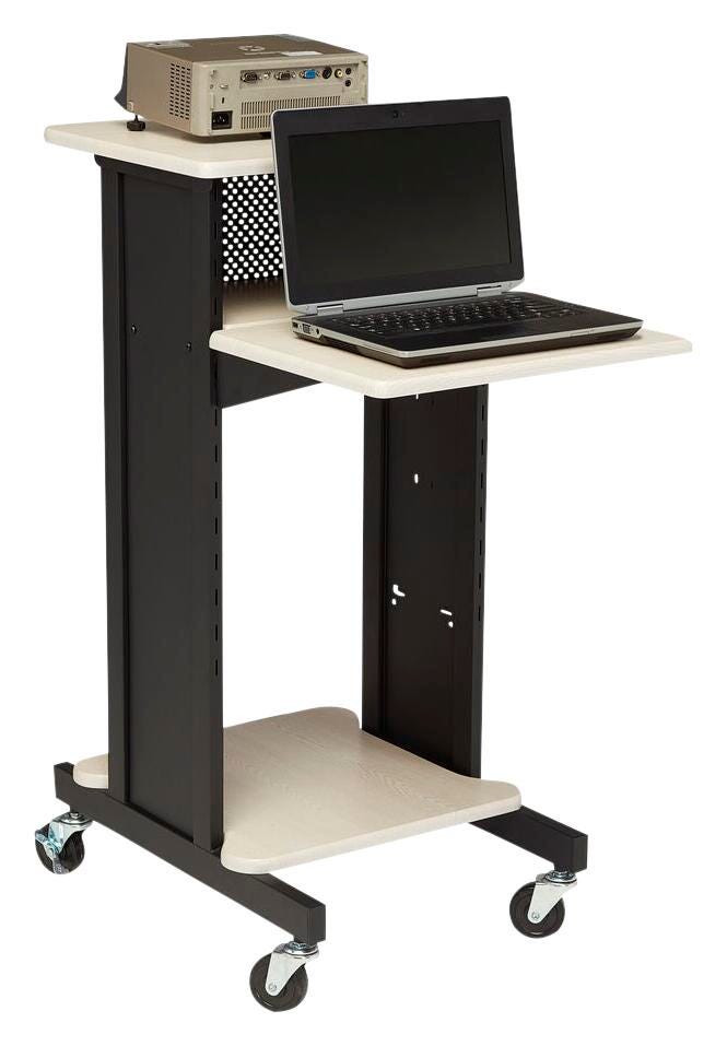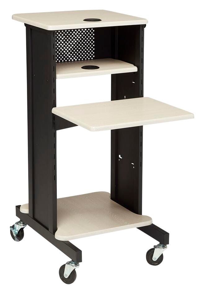 Oklahoma Sound PRC 200 Presentation Cart measuring 30 in x 18 in x 40 1/2 in comes with black frames and an ivory wood grain finishing. Presentation cart offers 4 different shelves to accommodate A/V equipment, including a height adjustable shelf so that laptop can be kept at the desired level. Presentation cart features heavy duty casters with 2 locking casters for stability and is an economical choice for a variety of A/V functions.