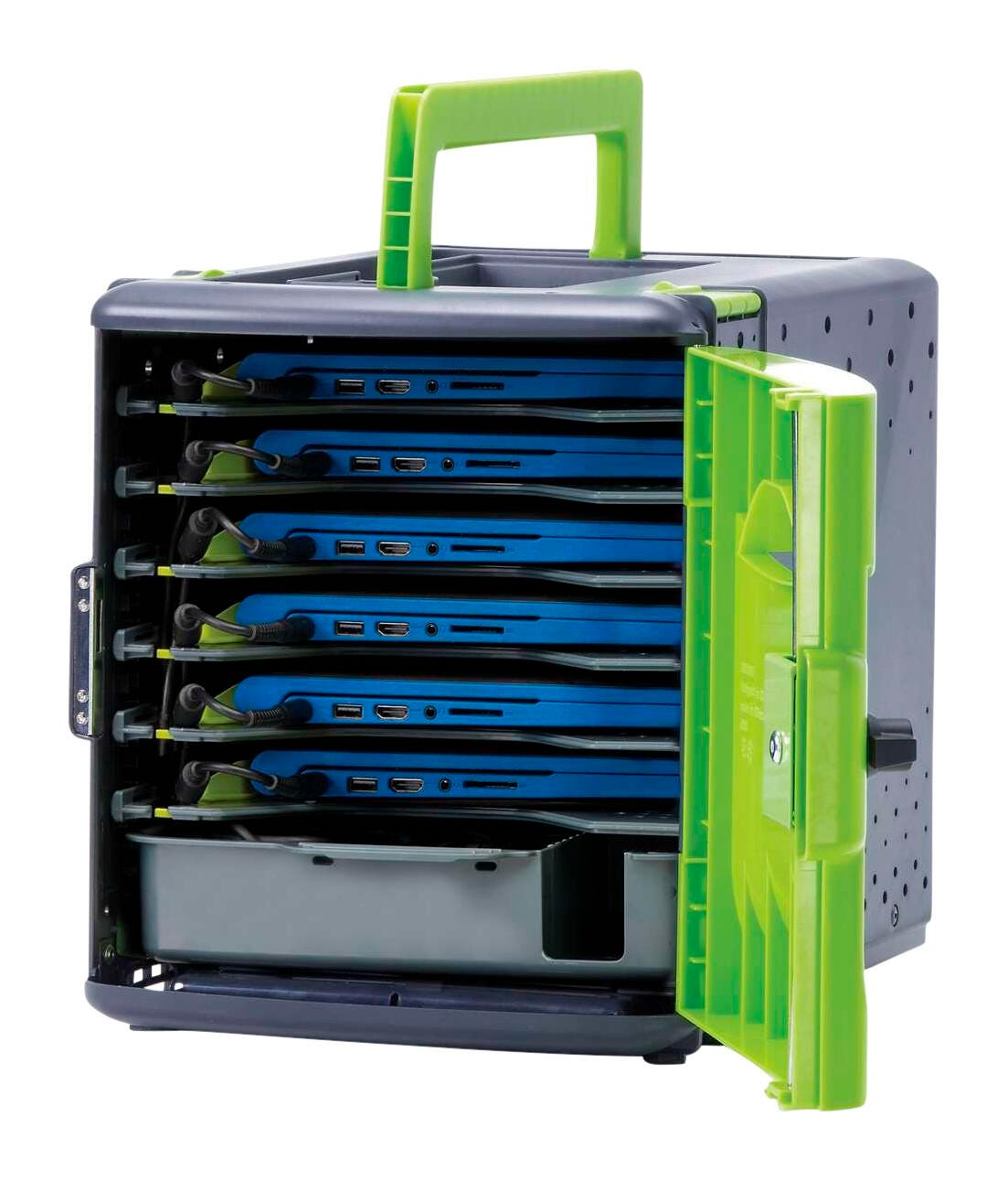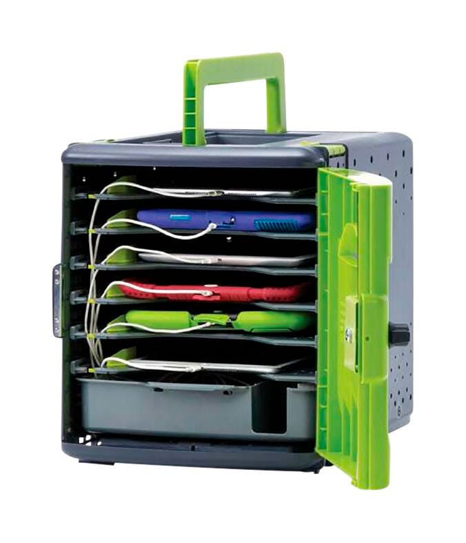 Description Premium Tech Tub2 is made from durable, high impact ABS plastic, and stores and charges up to 6 devices. Ventilation holes throughout the case prevent heat build up. There are two ergonomic handles on the door and back as well as a flip up handle on the top. The adjustable shelves accommodate devices with and without cases. To keep cords and adapters tidy, there is an easy to use side cable organizer and lower compartment. Cable hooks are on the back to manage the cord during transport. To secure the tub to a surface, there is mounting hardware. The tub has a 3 point lock and comes with 2 sets of keys.