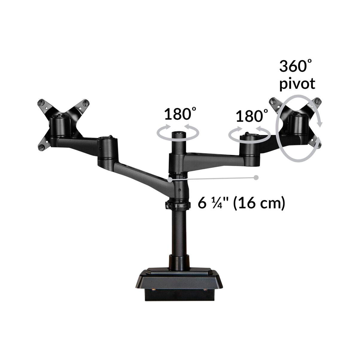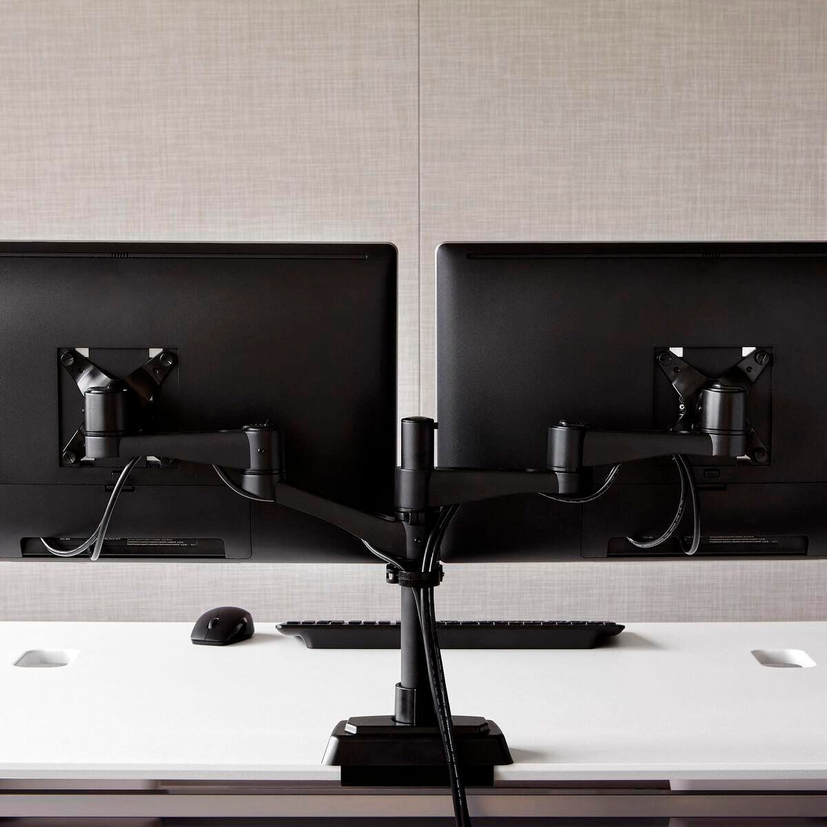 For spaces low on space with heavy work demands, meet the VARI Dual-Monitor Arm designed to swivel two monitors up to 180 degrees. This classic black design is made to blend with your current tech space's aesthetic while providing a dynamic solution to small work spaces like computer labs, cubicles, or high-tech educational spaces.