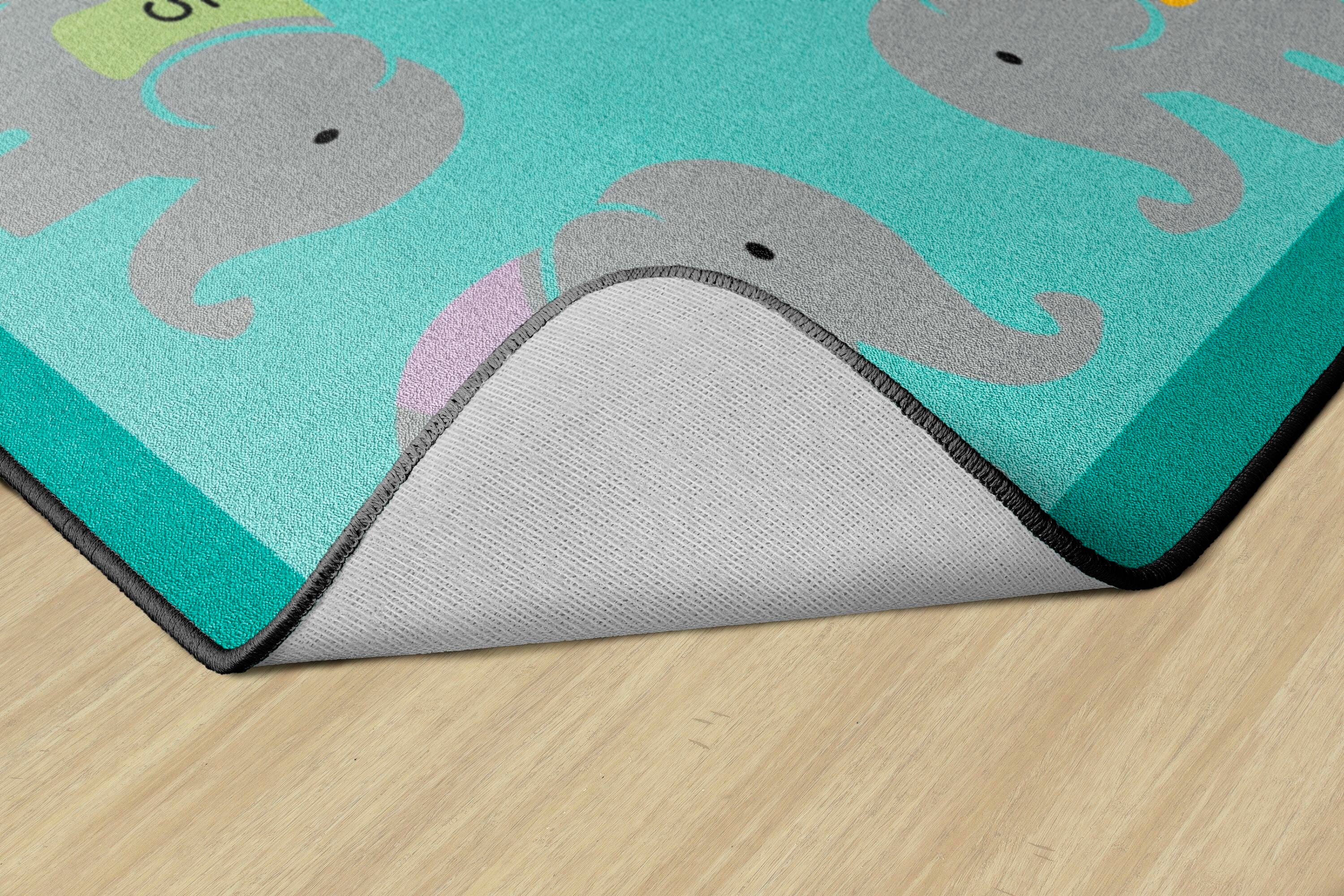 Childcraft® Counting Elephants Carpet brings a touch of whimsy and color to nurseries, playrooms, preschools, and classrooms. Adorned with a playful parade of elephants, this rectangular carpet is ideal for storytime, snack time, or as an inviting accent carpet to brighten your room. Designed for durability and comfort, you can count on this adorable carpet to add warmth to any style. Each Childcraft carpet is performance tested for durability, color fastness, and stain and soil resistance for quality you can trust.
