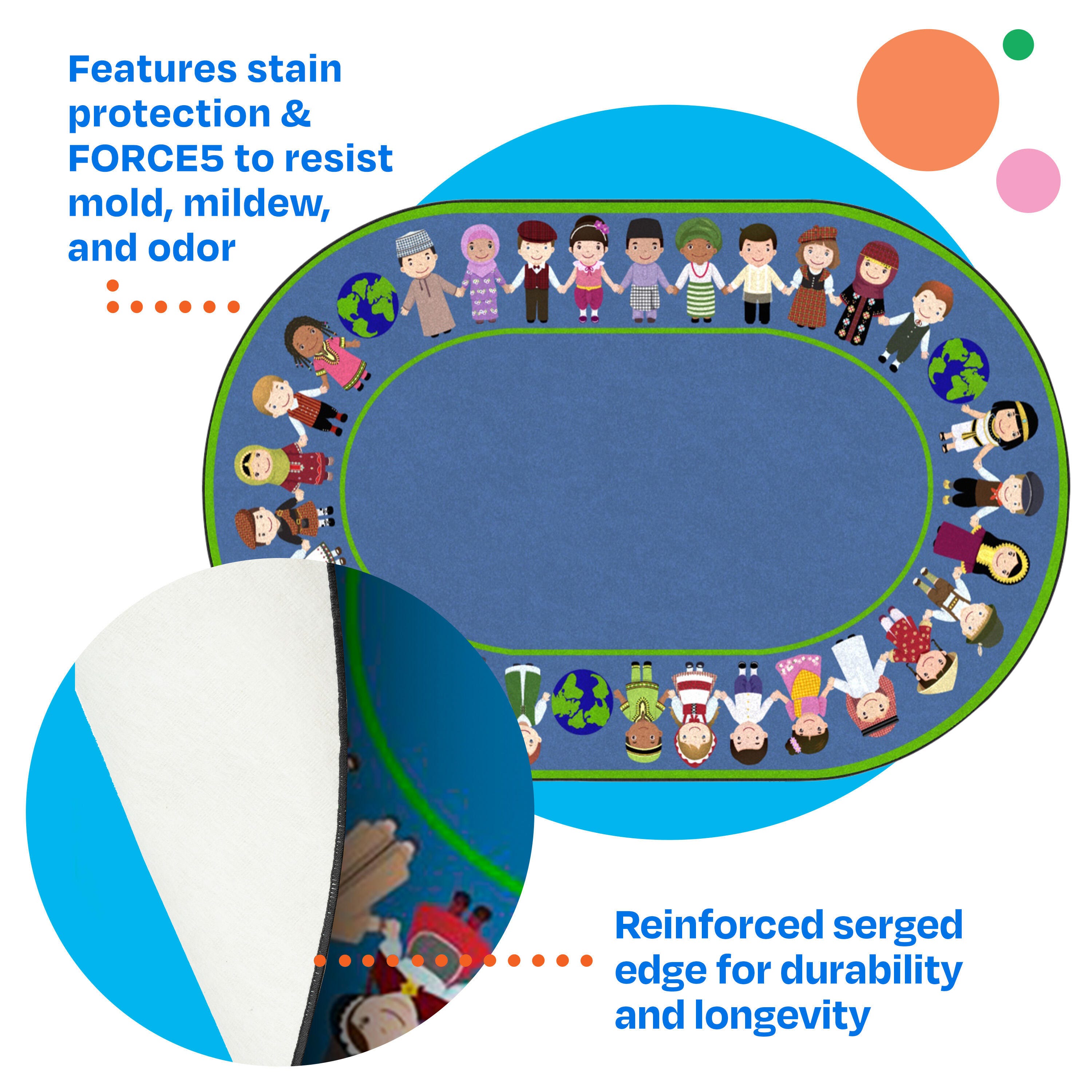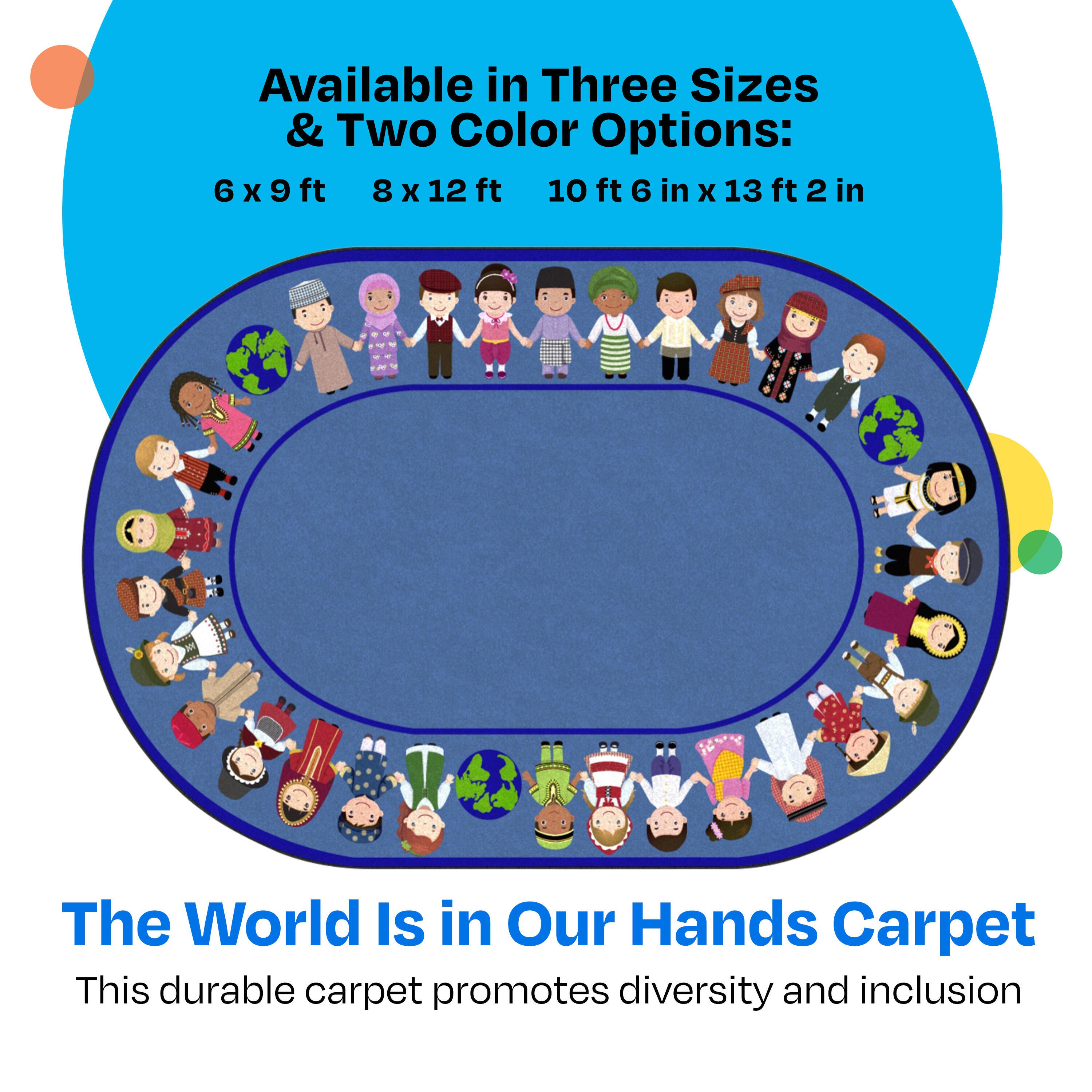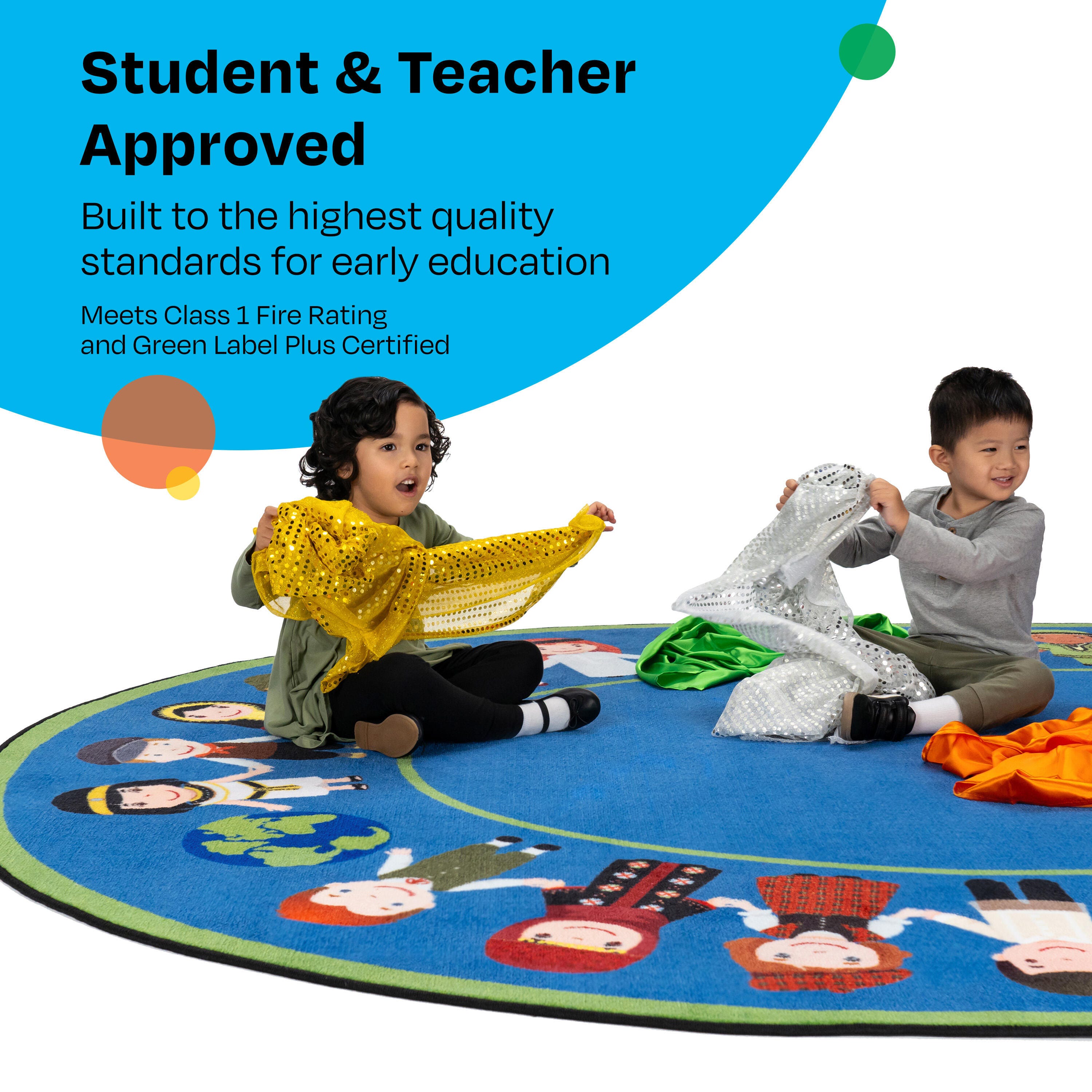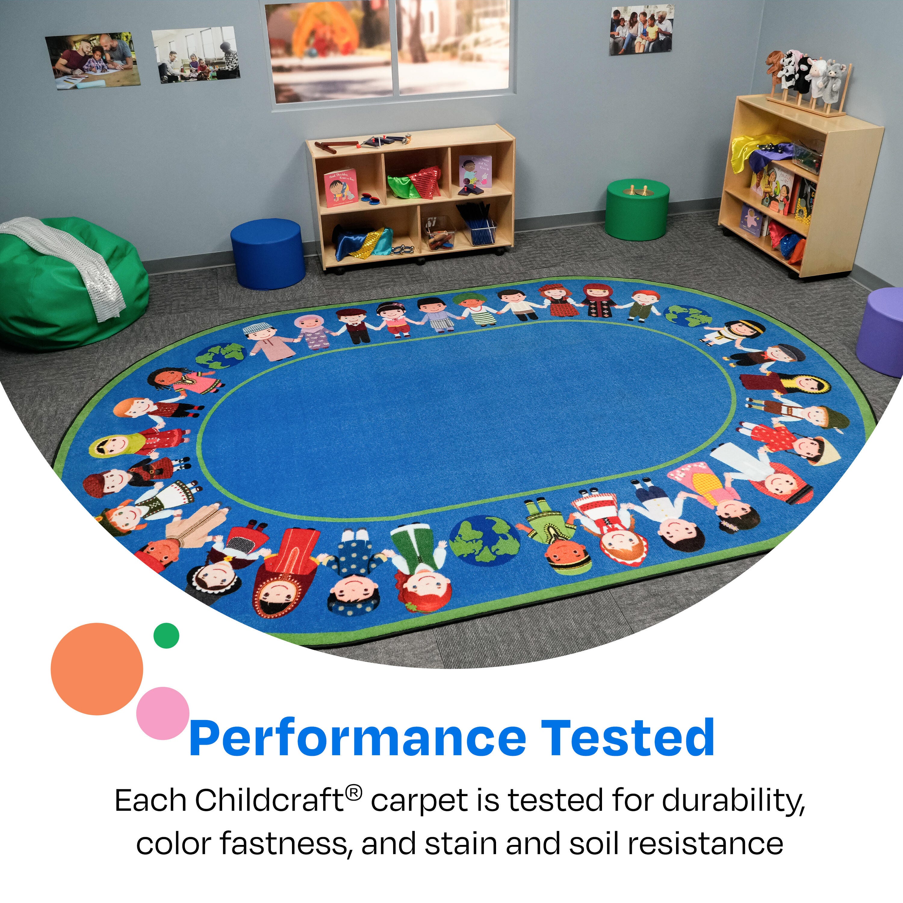 This Childcraft® The World is in Our Hands Carpet features images of children from around the world holding hands, illustrating unity across all cultures. Made of high-quality materials, the sitting carpet is great for everyday use for circle time, group activities, relaxation, creative play, and more. Each Childcraft® carpet is performance tested for durability, color fastness, and stain and soil resistance for quality you can trust. The Green Label Plus Certification also helps ensure the best indoor quality for a safe and healthy environment all year long. Please Note: Childcraft® carpets are custom designs that are made to order and are therefore non-returnable.