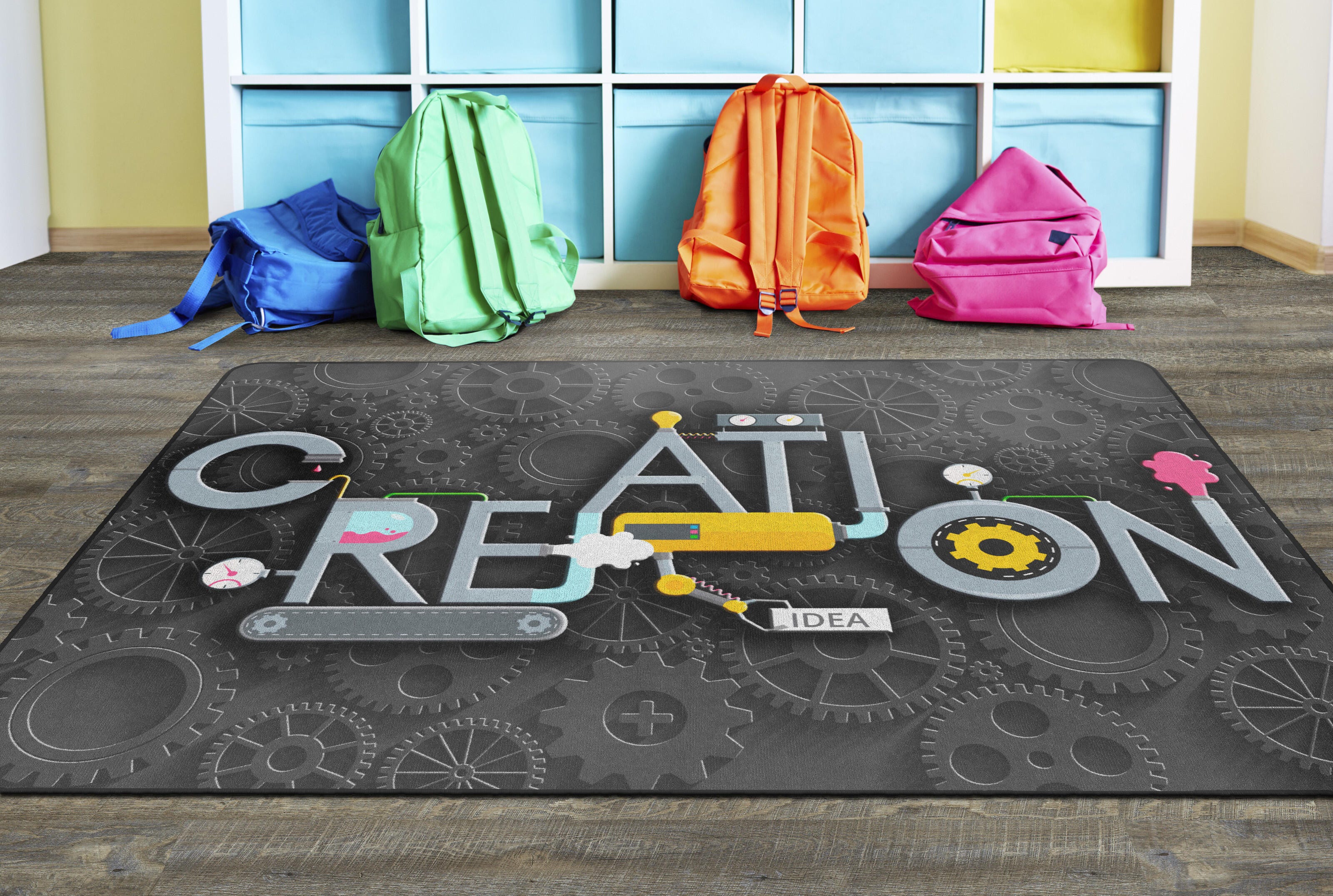 Encourage Science, Technology, Engineering, and Math in your space with this engaging STEM Creation Gears classroom carpet. Features CREATION spelled in a technical font to inspire STEM minds. Available in several sizes.