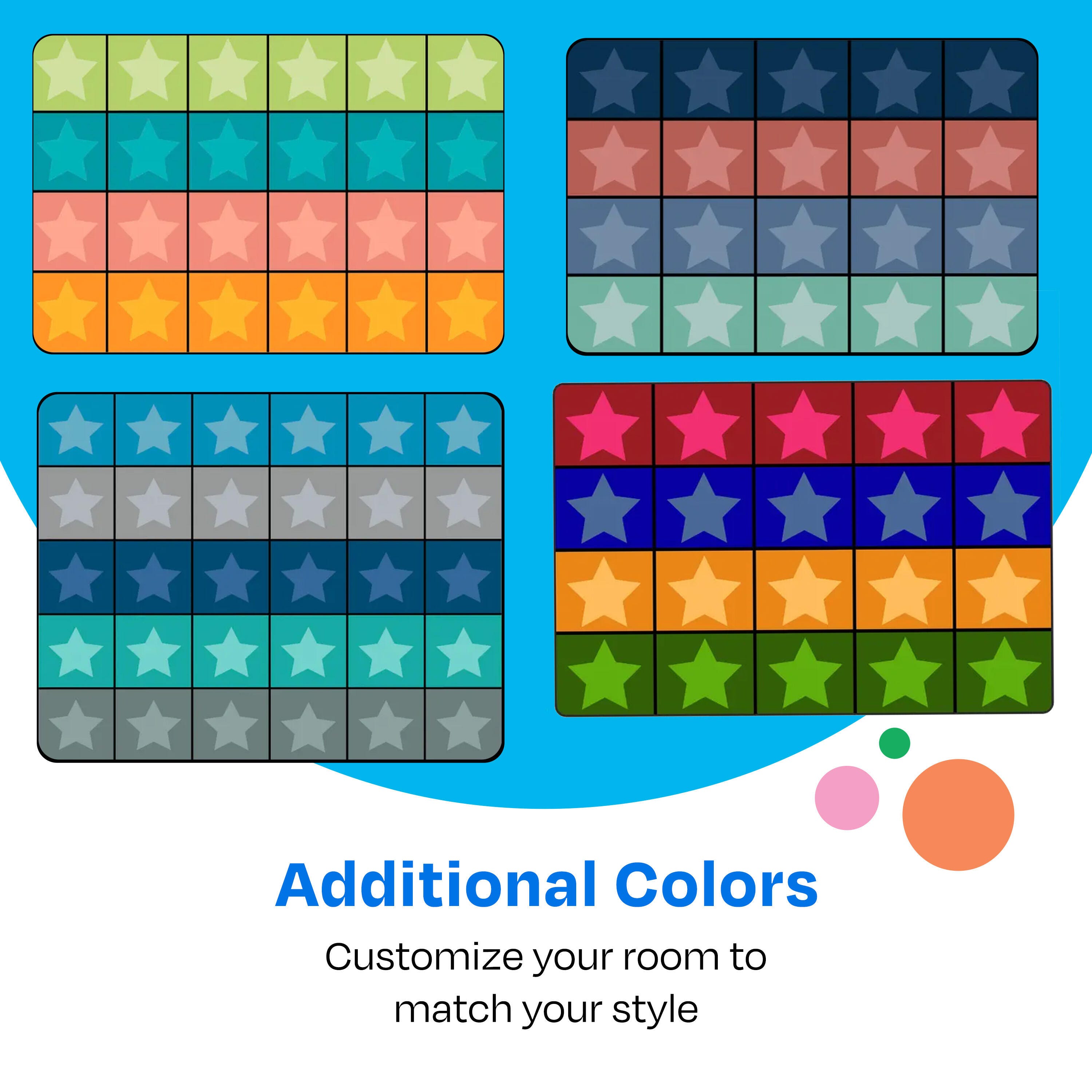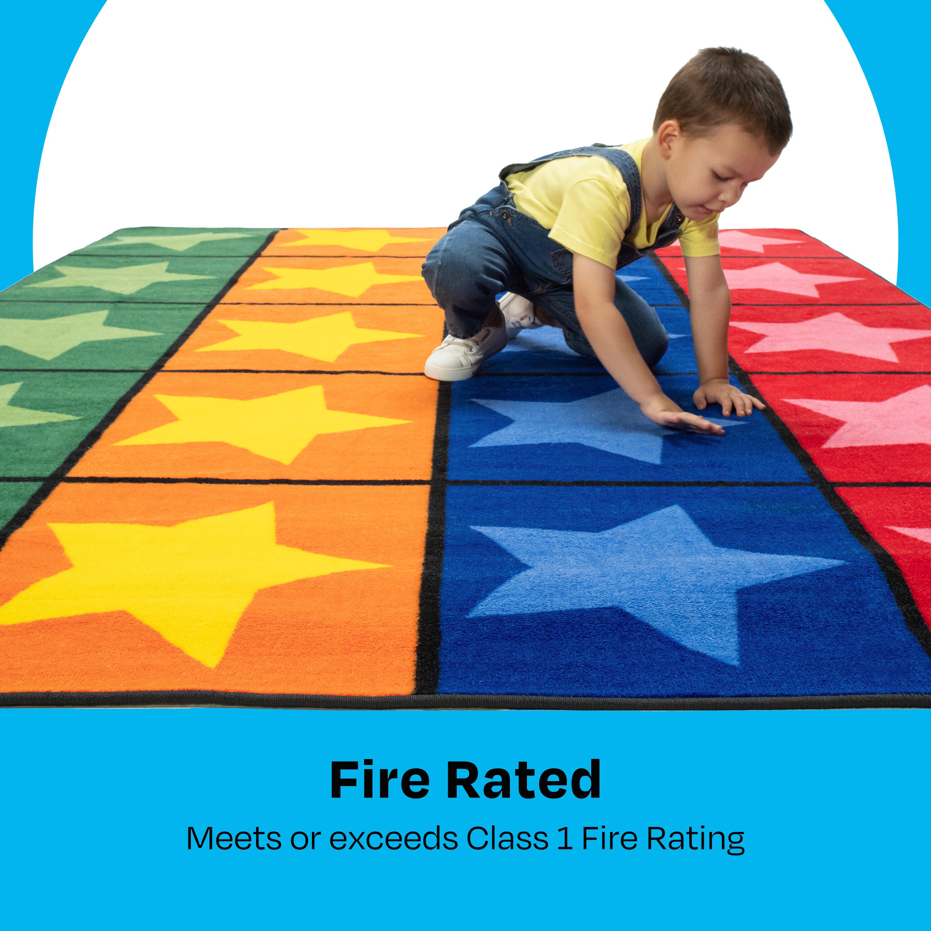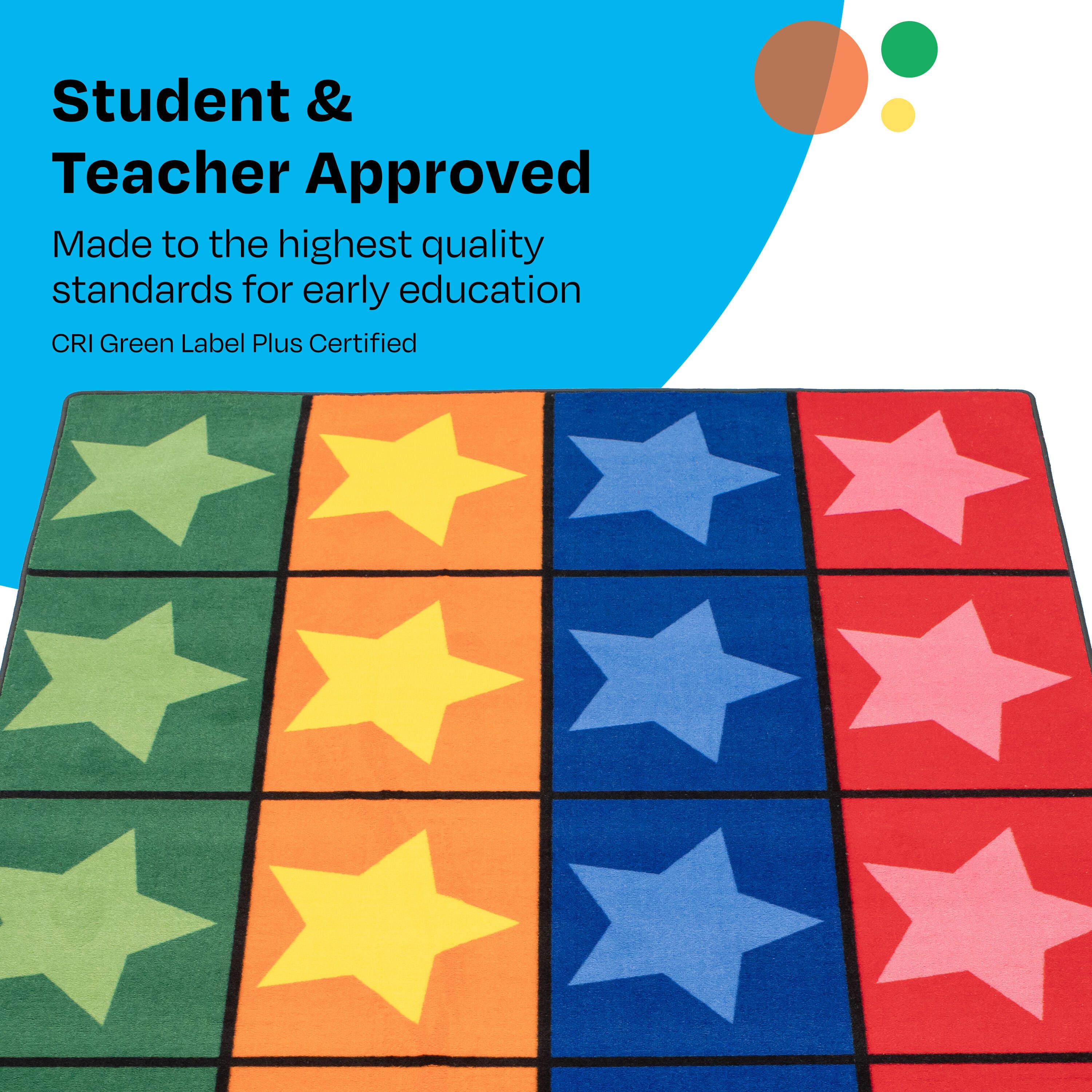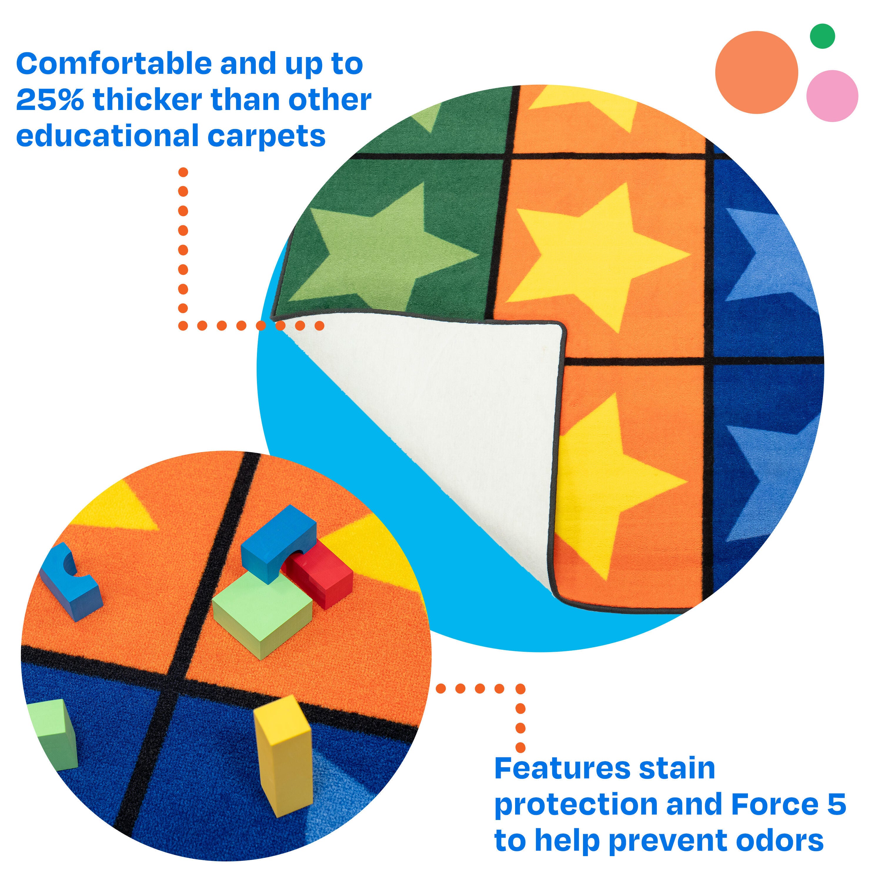 Every child will feel like a star from their own spot on this brightly-colored classroom rug. Horizontal rows feature 30 colorful stars within square sections for story time seating or other group activities. Childcraft carpets are performance tested for durability, color fastness, and stain and soil resistance for quality you can trust. Because of its versatility, this carpet can be used as a playroom rug, a preschool rug, a childcare center rug, a reading rug, or simply as the perfect rectangle carpet to match your space. This area rug is Green Label Plus Certified, meaning it promotes the best indoor air quality for a safe and healthy environment all year long. When ordering, choose the size that best fits your space. durability, color fastness, and stain and soil resistance for quality you can trust. Available in several colors and sizes. Please select which fits best when ordering. Please Note: Childcraft® carpets are custom designs that are made to order and are therefore non-returnable.