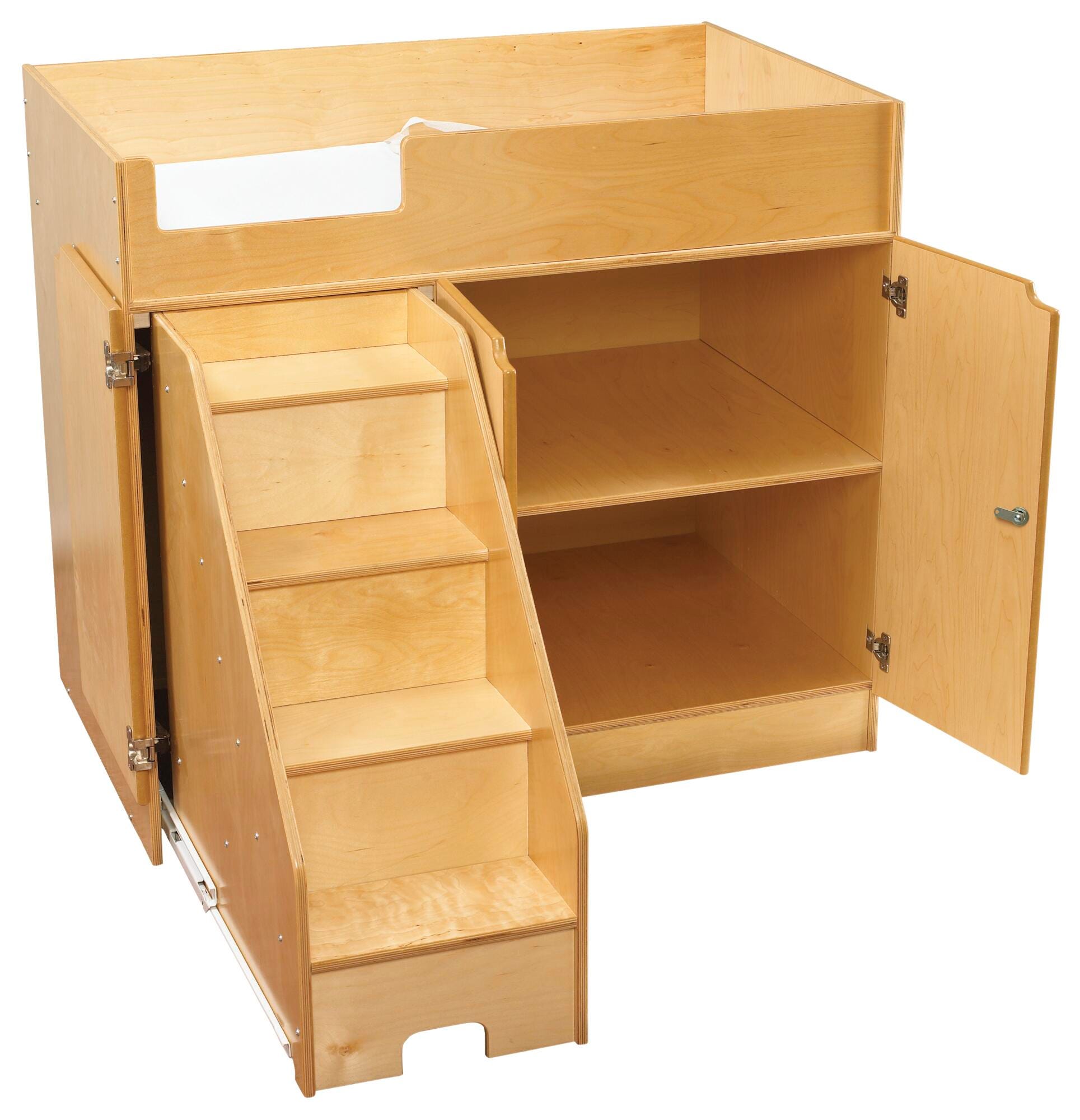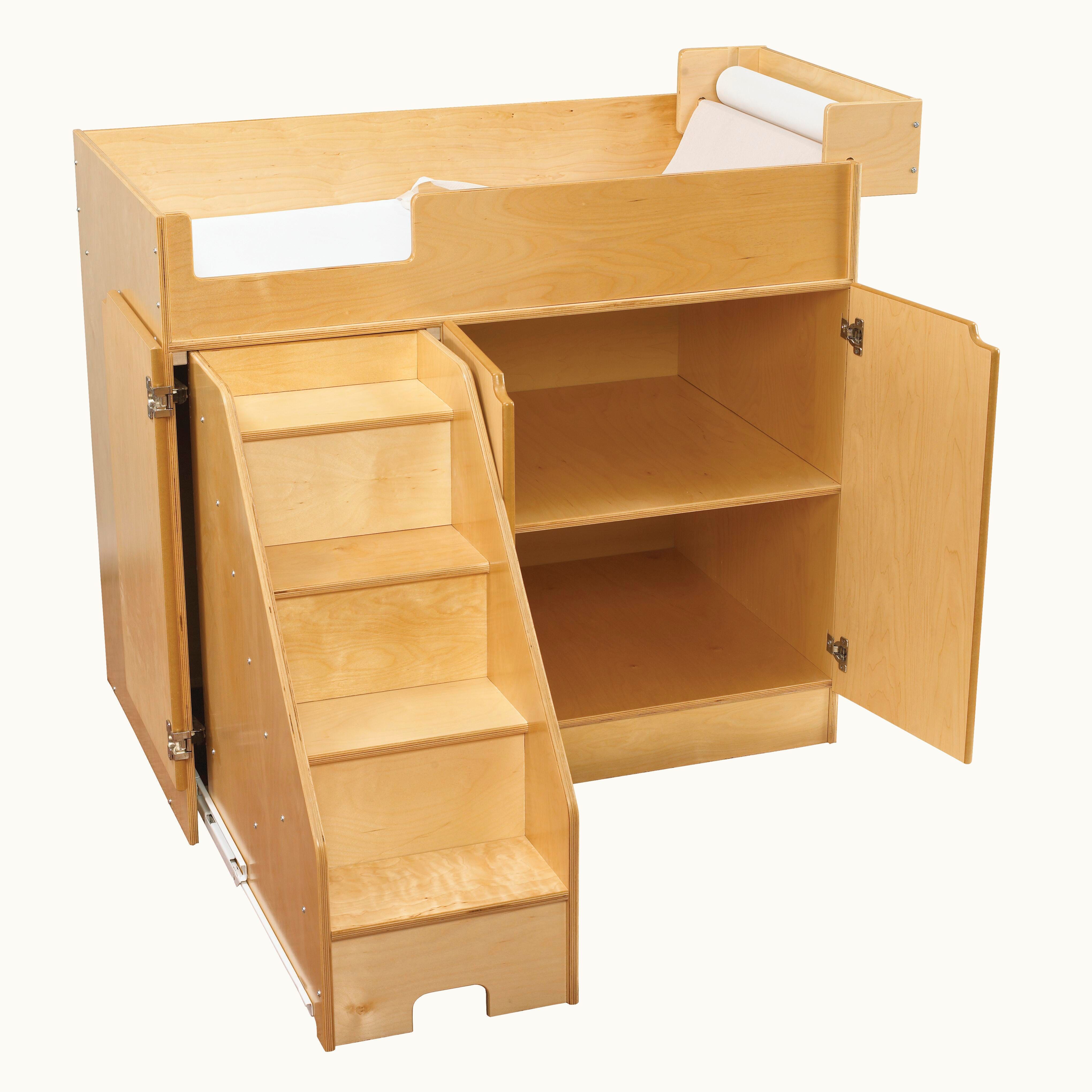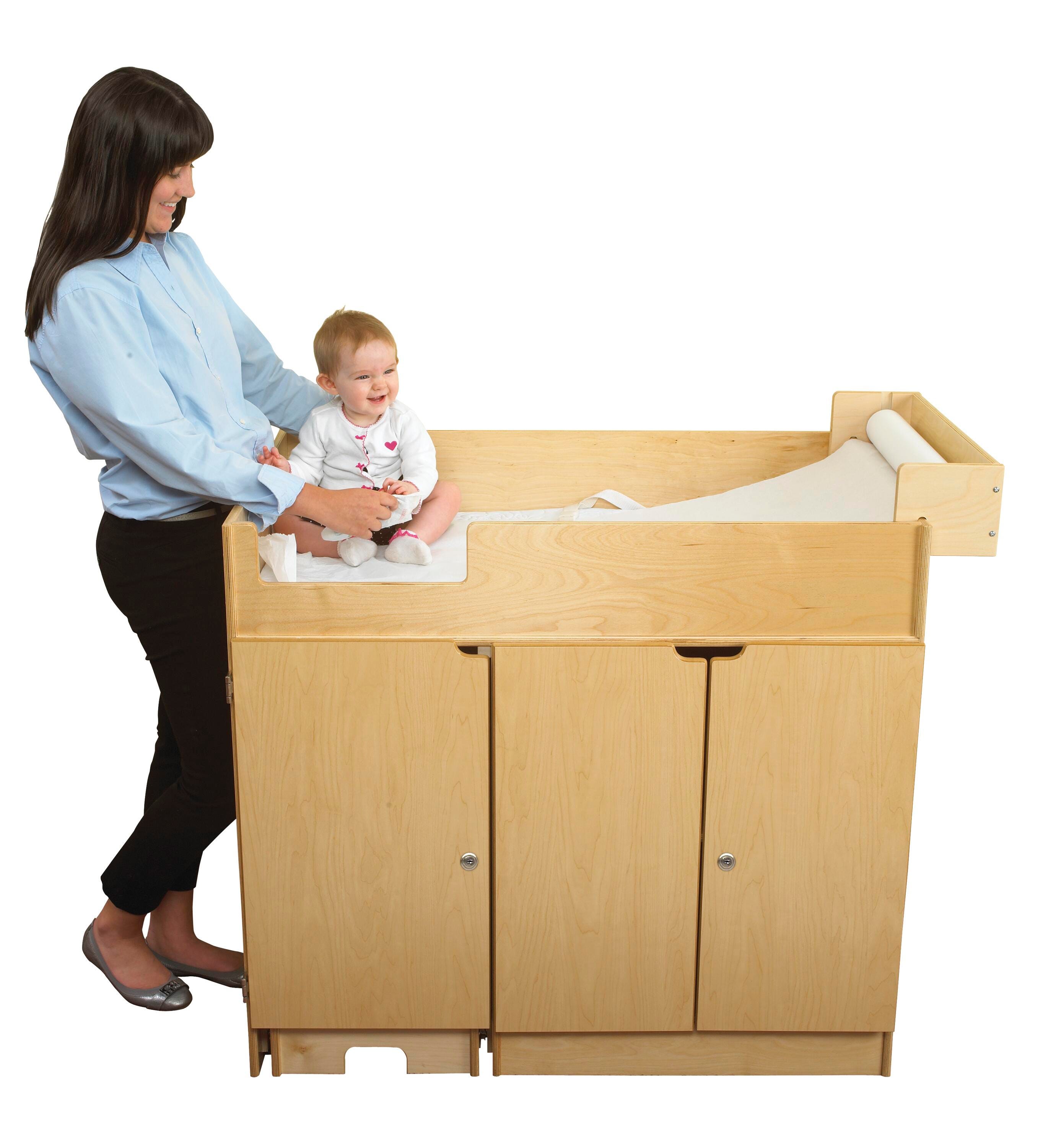 Make diaper changes easier and more organized with this sturdy, space-saving changing table for classrooms, featuring built-in storage and convenient steps.