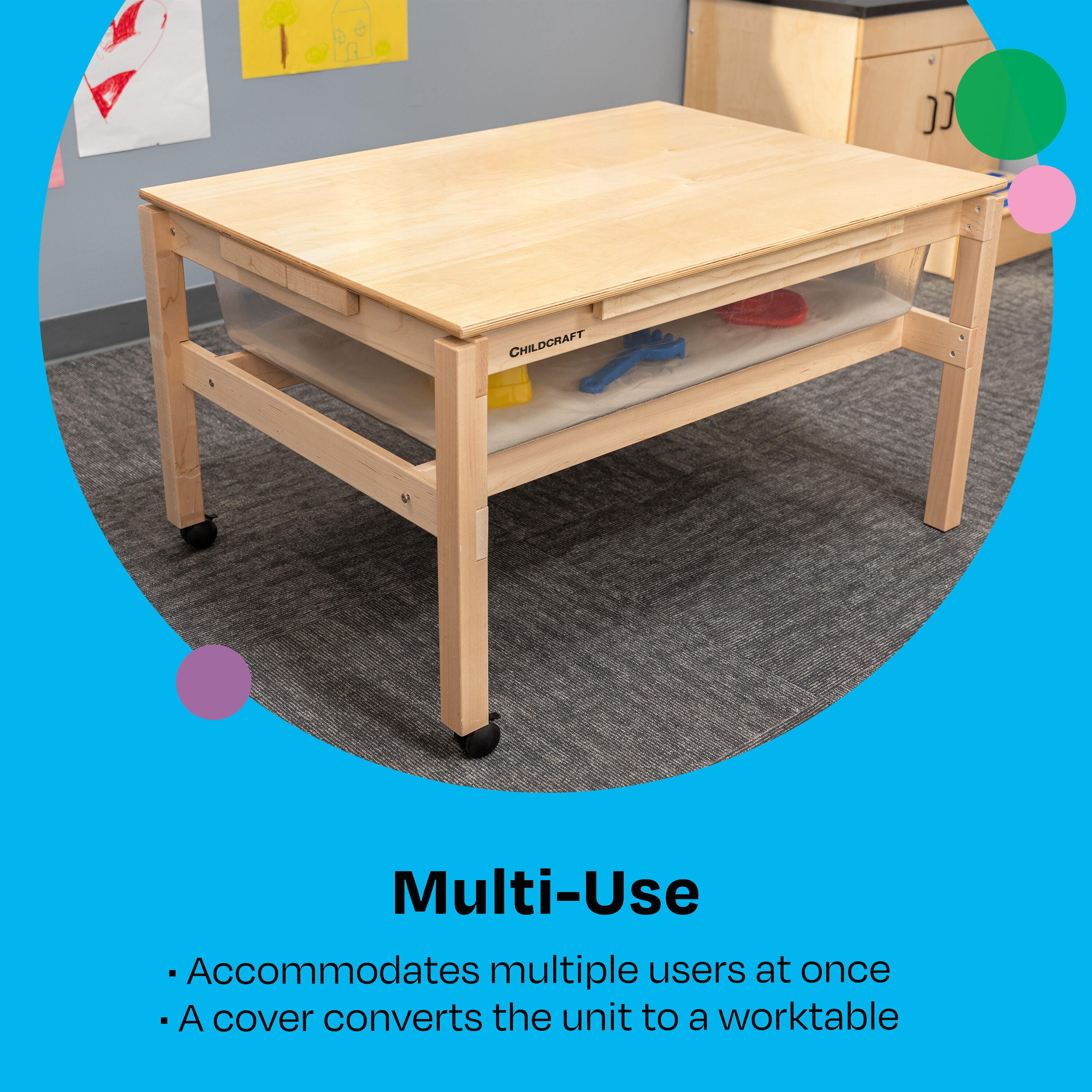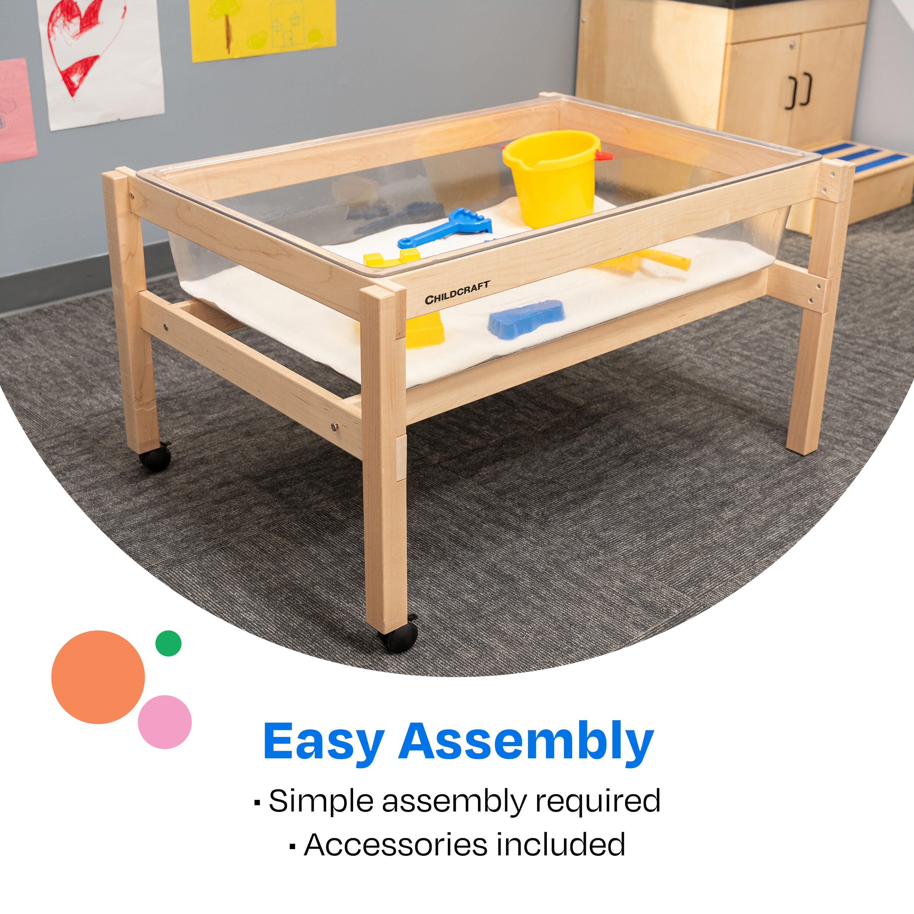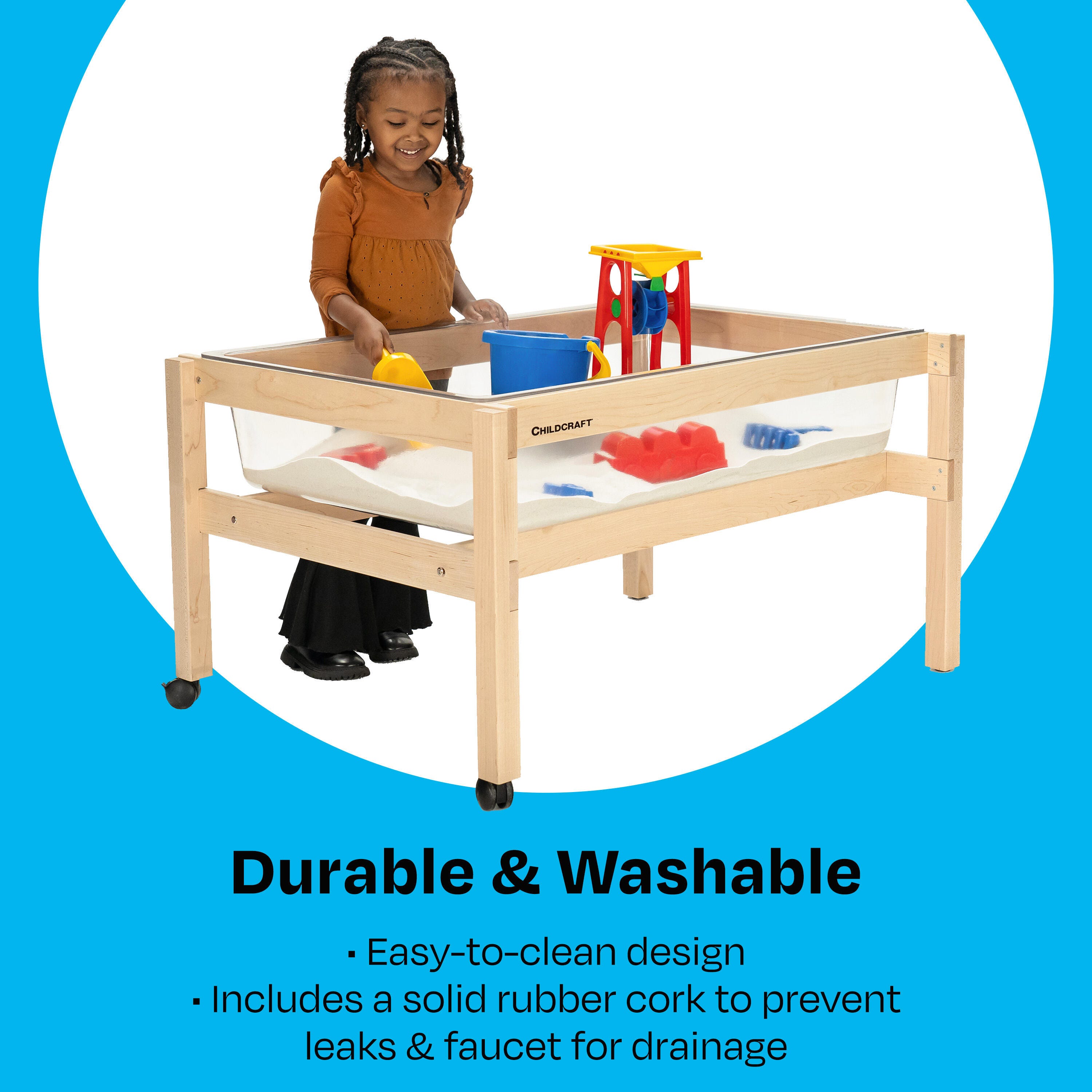 Childcraft® Sand and Water Table Package provides endless opportunities for sensory play and group interaction. Designed to hold either wet or dry materials, this sturdy wooden table and tub is built for durability and easy cleaning. The included cover converts the unit into a versatile classroom worktable when not in use. Equipped with casters for mobility, a faucet for easy drainage, and a solid rubber cork to prevent leaks, this sensory table is as practical as it is engaging. Assembly is quick and simple, allowing more time for exploration and creativity. This sand and water table measures 42-3/8 W x 30-1/8 D x 23-5/8 H inches.
