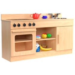 Childcraft® Modern Compact Kitchen Center offers a realistic and engaging play experience that inspires imaginative role-play and social skill development. Designed with a sleek, contemporary style, this wooden kitchen features a four-burner stove with smoke-colored shatterproof acrylic top, five rotating dials, and a functional oven door with a clear acrylic window. The realistic sink and faucet provide plenty of counter space for food prep and play dishes, while built-in storage below the sink keeps pretend kitchen supplies organized. Made from high-quality birch plywood, this play kitchen is built to last with a stain-resistant, ultra-cured clear acrylic finish for easy cleaning. Arrives fully assembled and ready for play. This children's kitchen measures 47-3/4 W x 14-1/2 D x 27-3/4 H inches.Features