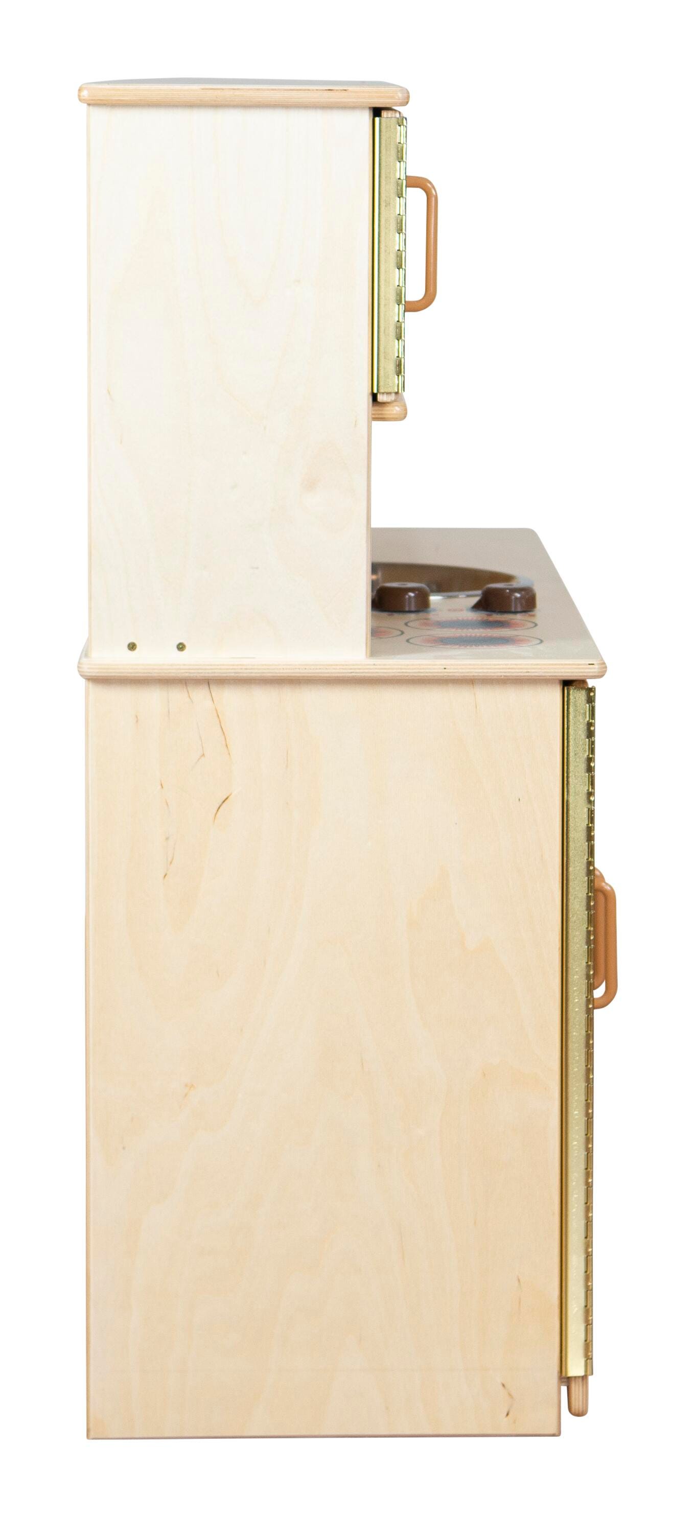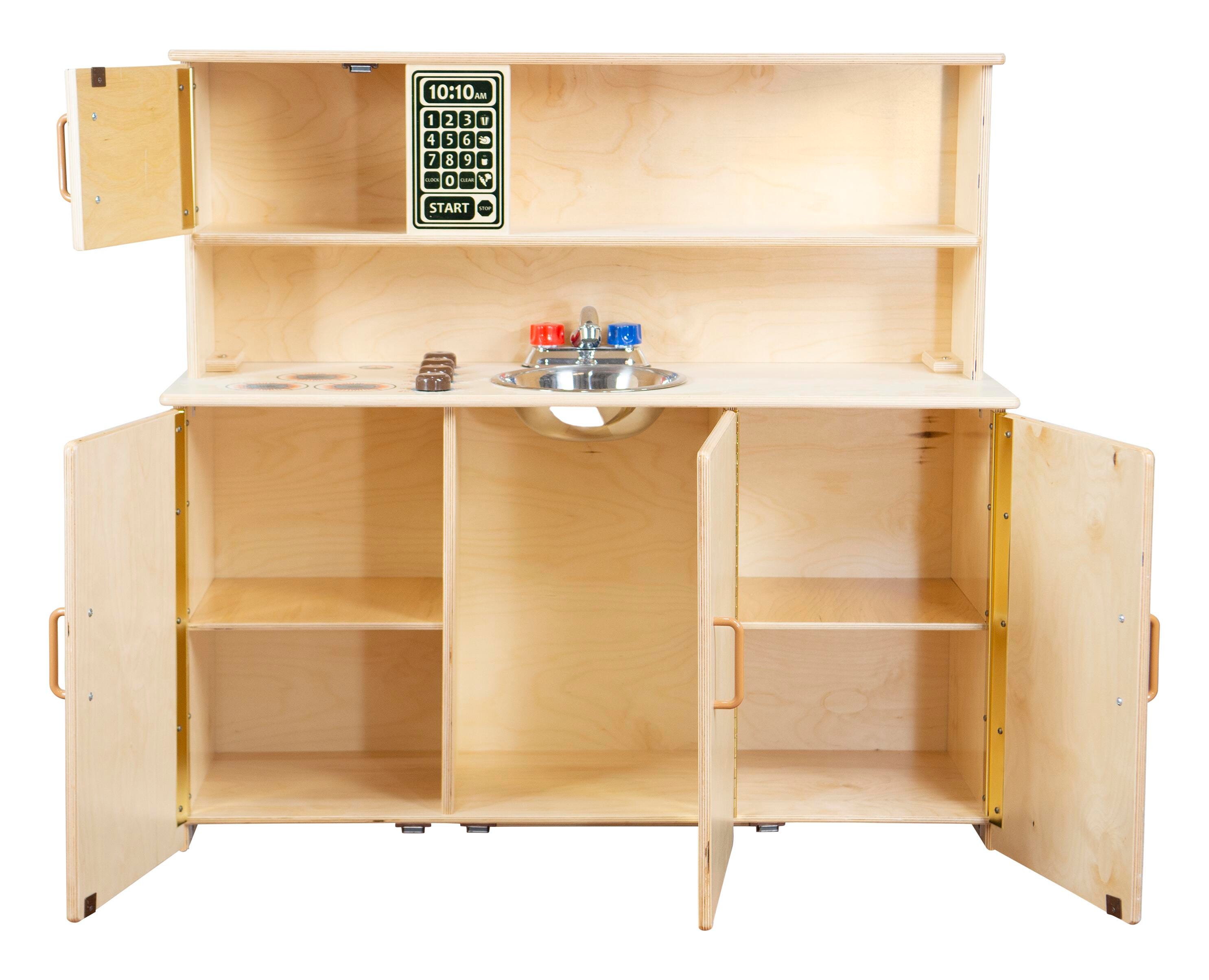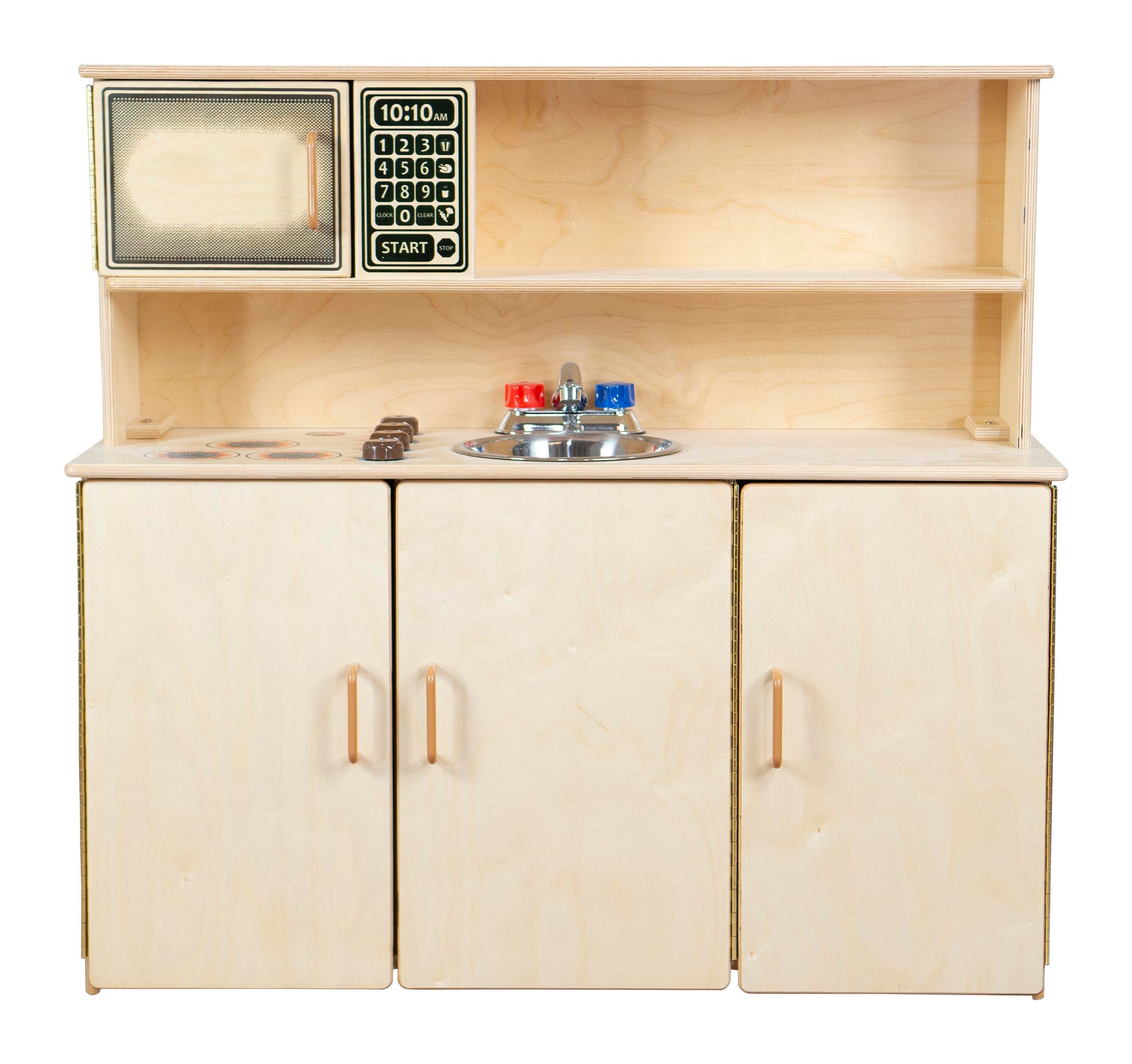 Description Wood Designs 5-in-1 Kitchen Center provides all your basic kitchen needs and spacious storage in one unit. Features durable plastic handles, burners, microwave, and removable sink tray. 100% Healthy Kids? Plywood with our exclusive Tuff-Gloss? UV finish. Full length Pinch-Me-Not? hinges and doors for added safety. Lifetime warranty. Measures 40 in W x 15 in D x 40 in H.Features Potential LEED? v3 credit support: MRc4, 5, 7 & IEQc4.4 Formaldehyde-free adhesive system CHPS compliant - California section 01350 approved Counter is 20 in high