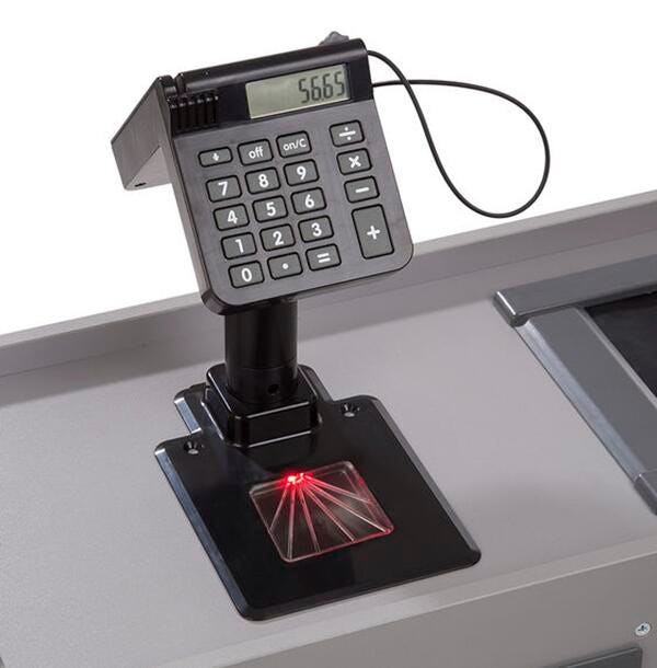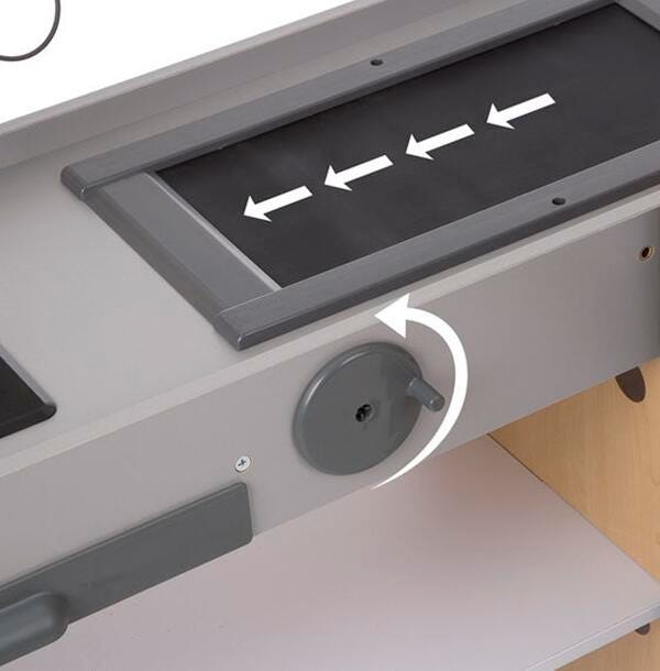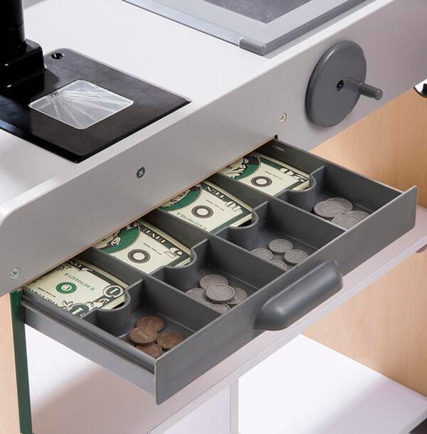 Hand-cranked conveyer belt, beeping 'scanner", bagging area, card swipe machine, and cash drawer add realistic feel to dramatic play fun