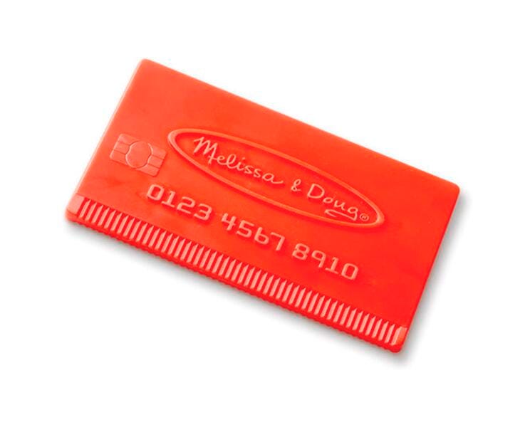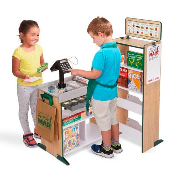 Shop, stock, and roll! This sturdy wooden Fresh Mart Grocery Store allows your little shoppers to take on the grown-up role of loading up weekly "meal" goodies with a cart or basket and checking out at the register/conveyer belt. Free-standing playset features one 5-shelved side where various play food pieces can be placed (sold separately), while the other side has a "checkout" area where someone can play the role of grocer to ring up items. Realistic beeping scanner, card-swiping machine, keypad/calculator, and cash drawer add to the fun (all while introducing basic math skills, too!). Complement with Melissa & Doug Fresh Mart Grocery Store Companion Collection Set (sold separately; Item # 1609385) for the ultimate play set. For ages 3 and up. Total wooden grocery set measures 42 H x 35 L x 27-1/2 W inches. Adult assembly required (manual included).