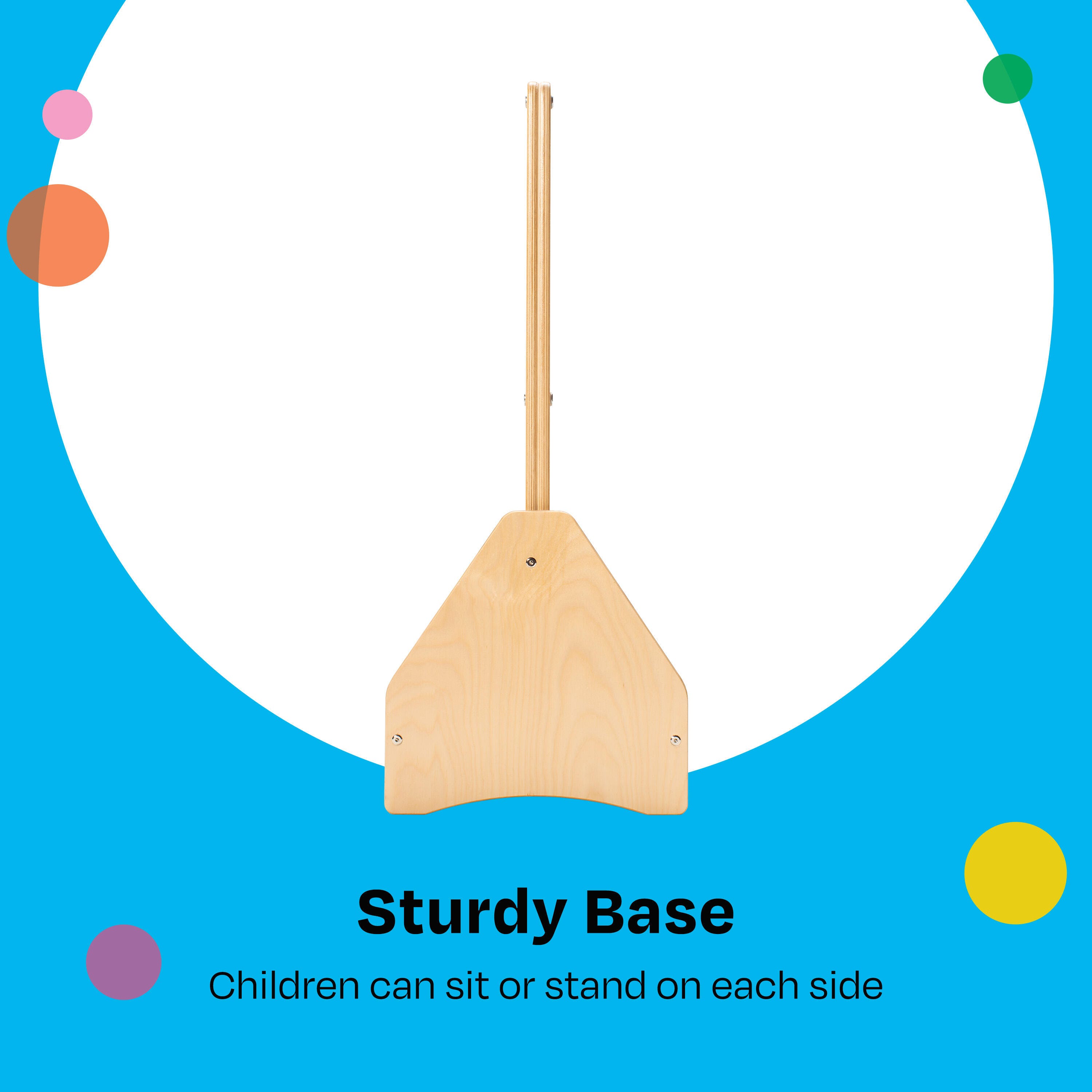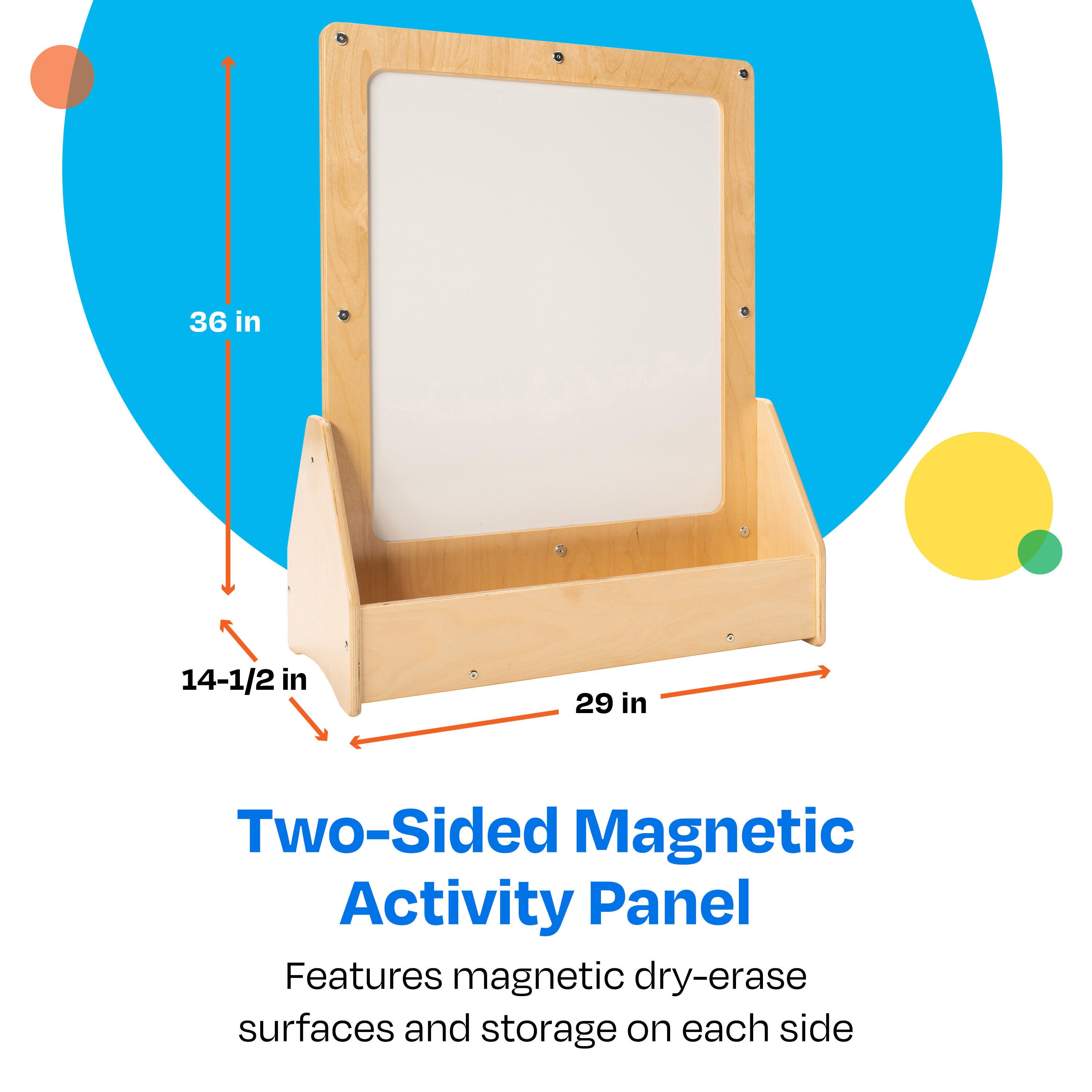 The Childcraft® Two-Sided Magnetic Activity Panel features a magnetic dry erase board and storage on each side. Easy to use, store, and clean, the wooden art easel allows children to sit or stand as they create art or attach magnets. A child-friendly design includes top rounded corners and smooth exposed edges. Use the double-sided whiteboard for preschools, elementary schools, early childhood programs, child development centers, and headstart centers. Light assembly is required. This activity panel measures 29 W x 14-1/2 D x 36 H inches.