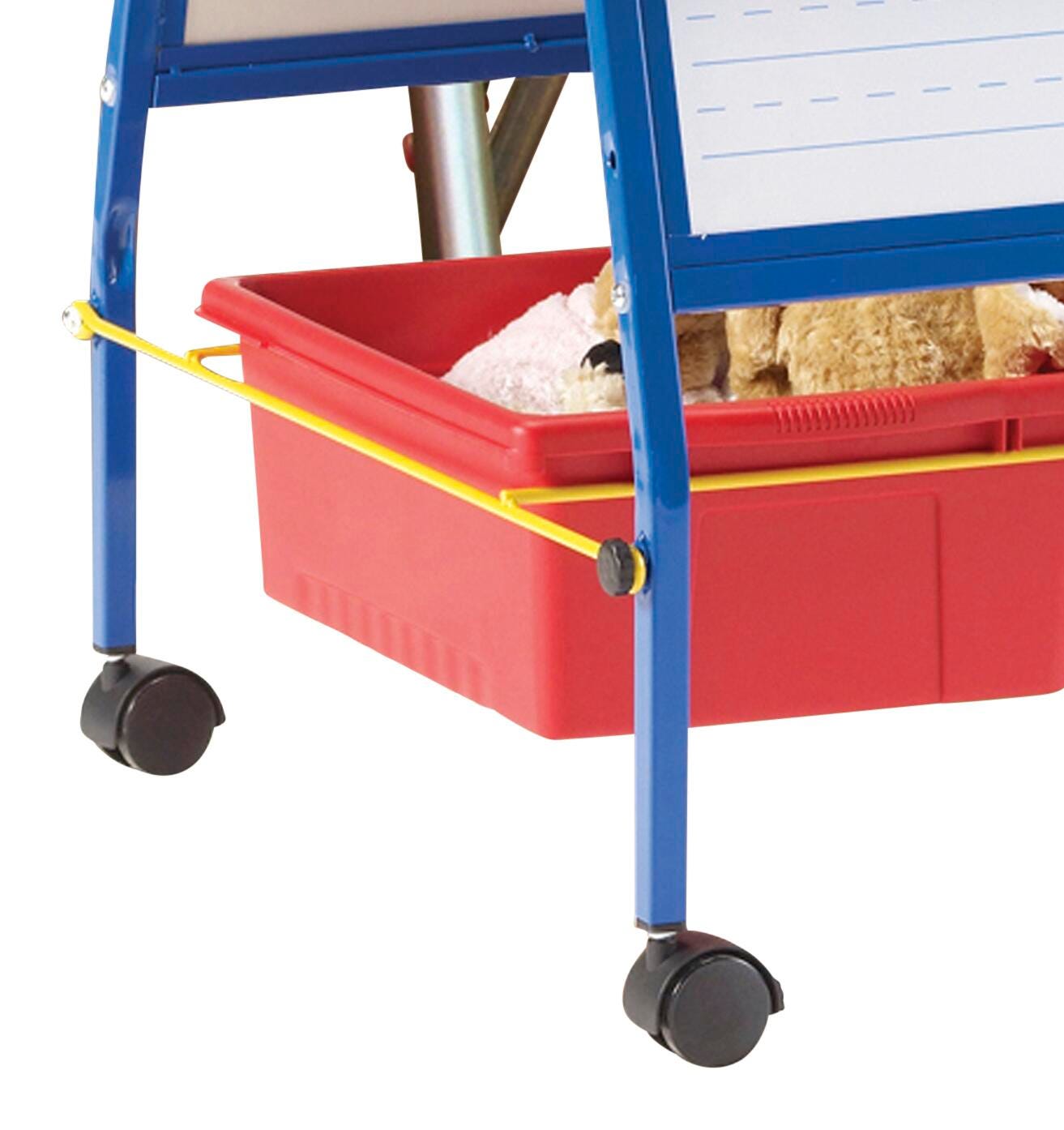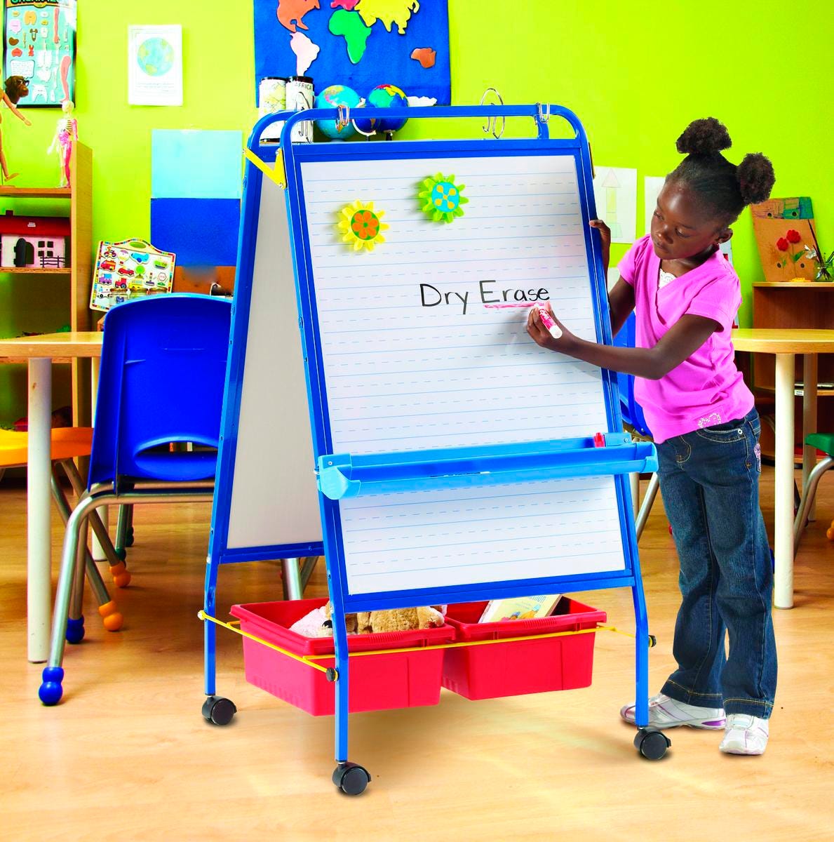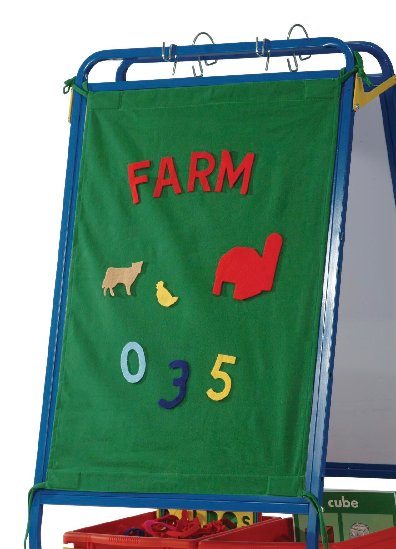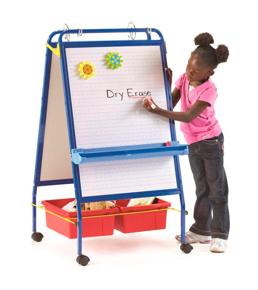 Perfect for Grades PreK-1, with multiple activity-based features. Provides teachers with quick set-up and the ability to change lessons when needed. Two magnetic dry-erase whiteboards, 23 W x 33 H inches, one side with solid/dotted/solid line sequence and roll-up felt, 31 W x 22 H inches, for creative play, along with corner ties and magnets to secure on station. Measures 26 W x 29-1/2 D x 47-3/4 H inches.