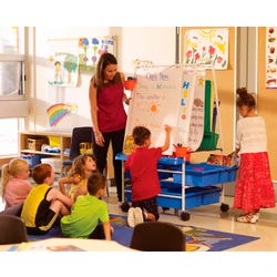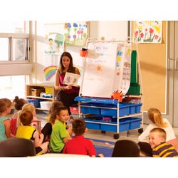 This easel is now available with see-through hinged lids that make it easy to keep things tidy and allows the tubs to be stacked when not in the cart. The hinge eliminates the need to remove the lid when accessing materials inside, so no missing lids! This easel is an essential teaching tool for all primary and junior classes. Designed with teacher-driven features that help keep everything organized and lessons more engaging. It combines a chart stand, storage for books and materials, dry-erase surfaces, and a book ledge for storytime.Features