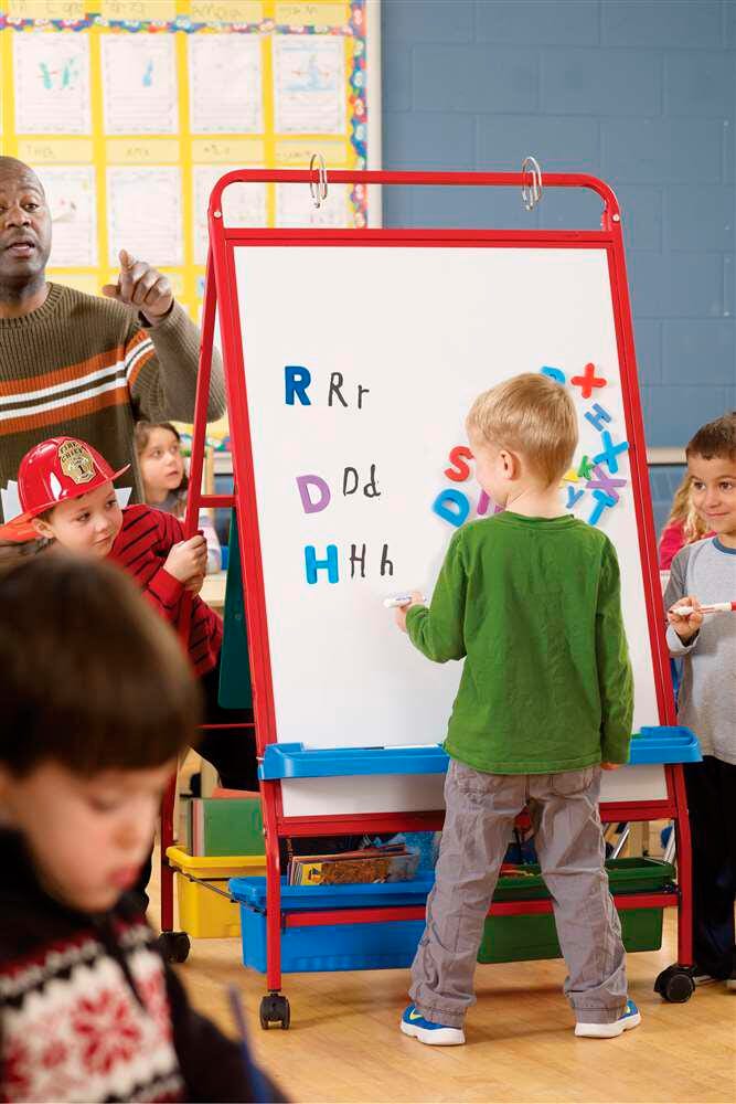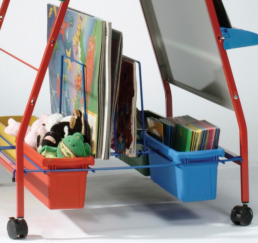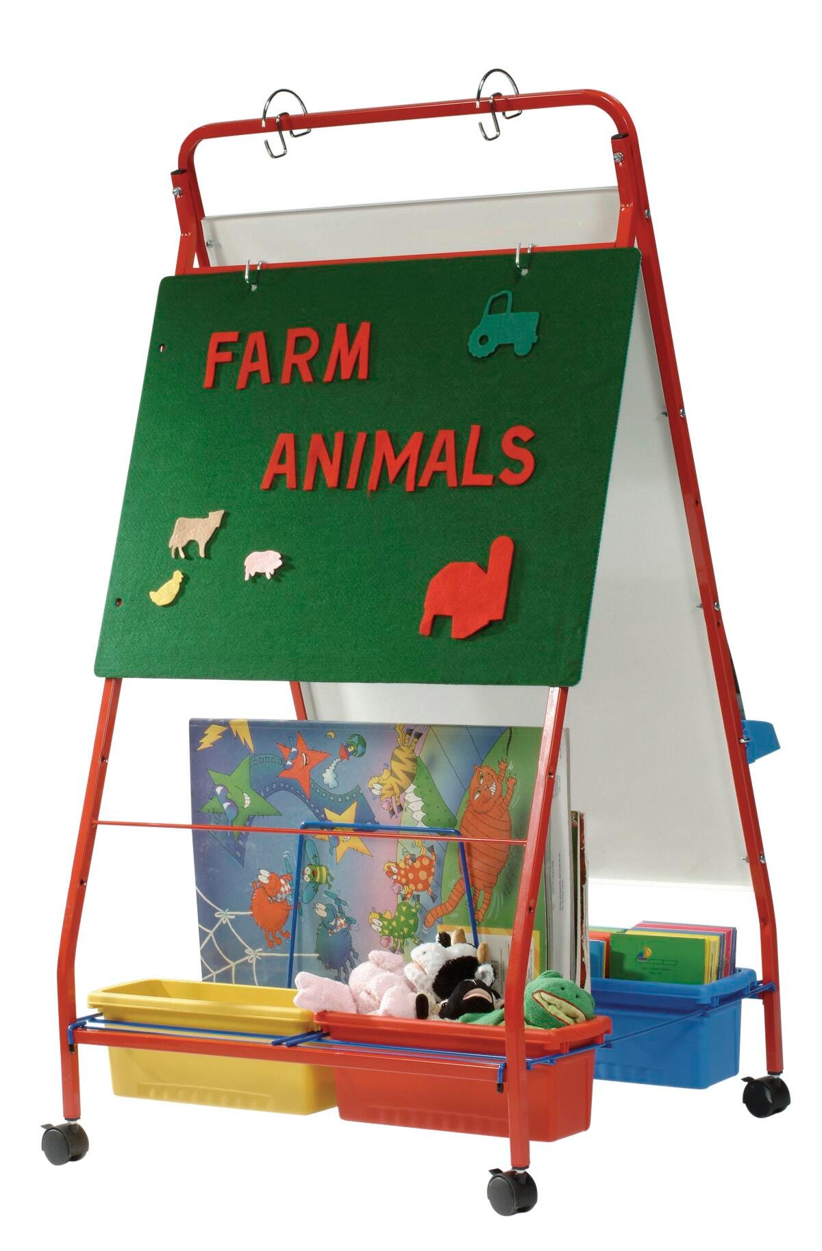 With room for two little learners, multiple independent and group lessons are a breeze. Features a front magnetic dry erase board and a rear removable felt board. There are felt board hooks and snap-on chart paper. The ultra-safe premium book ledge locks into multiple positions. Below the easel, are tub racks with 4 small open tubs for lesson storage and a place for big books. Lifetime warranty on easel components and 5-year warranty onf whiteboards.Features