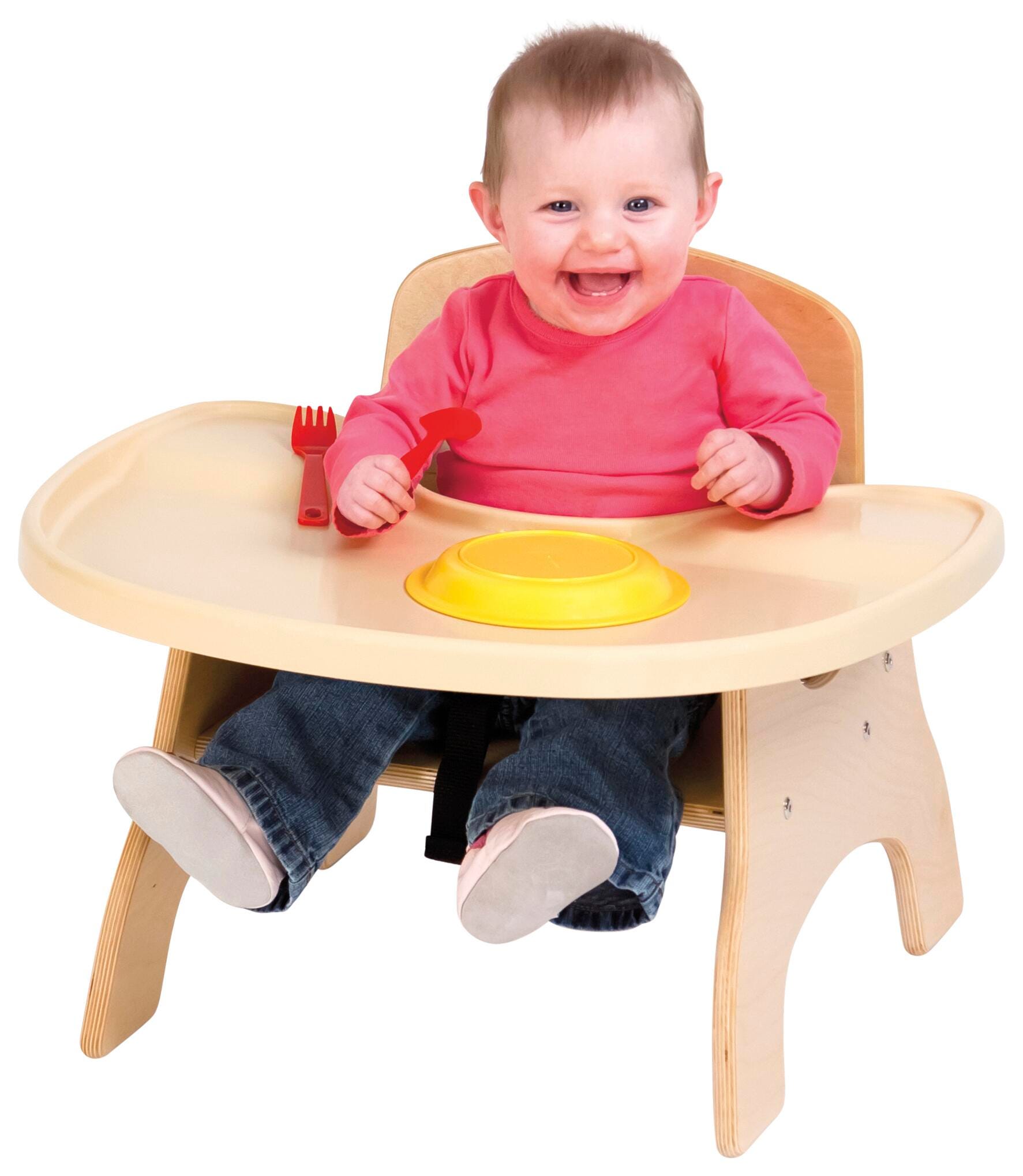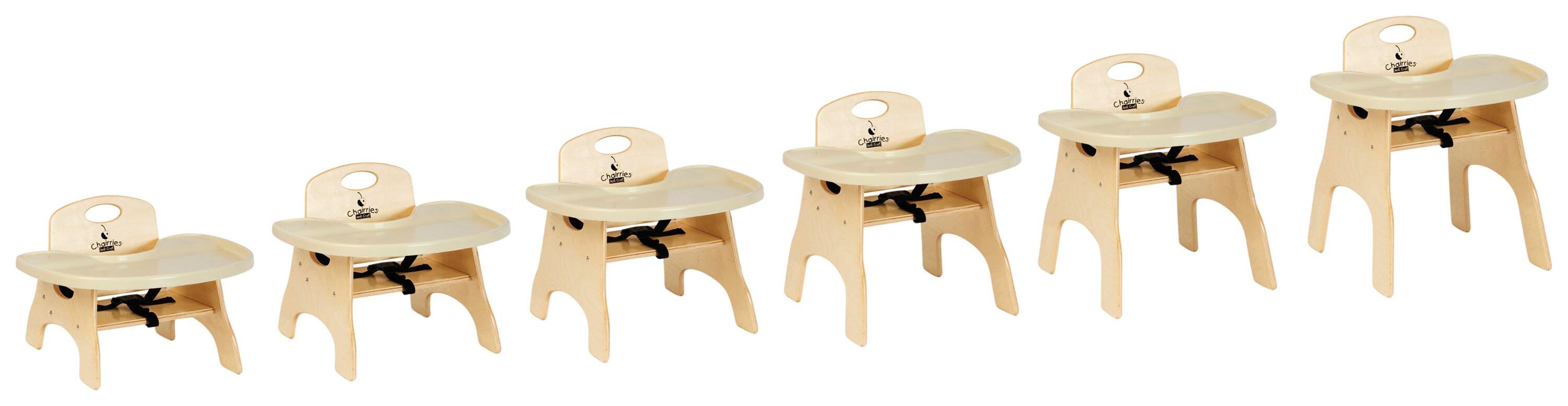 Jonti-Craft High Chairries Premium Tray is ideal for the early education environment and is designed to make feeding and clean-up a snap. The removable 3-point seat belt makes for easy cleaning and an excellent fit. 9-inch high chair seat. Tray measures 22 W x 17 D inches and features a stain-resistant plastic for added durability, a raised lip for holding spills and can hold up to a half gallon of liquid. Birch chair includes a BPA-free plastic tray that has 126% more surface space.