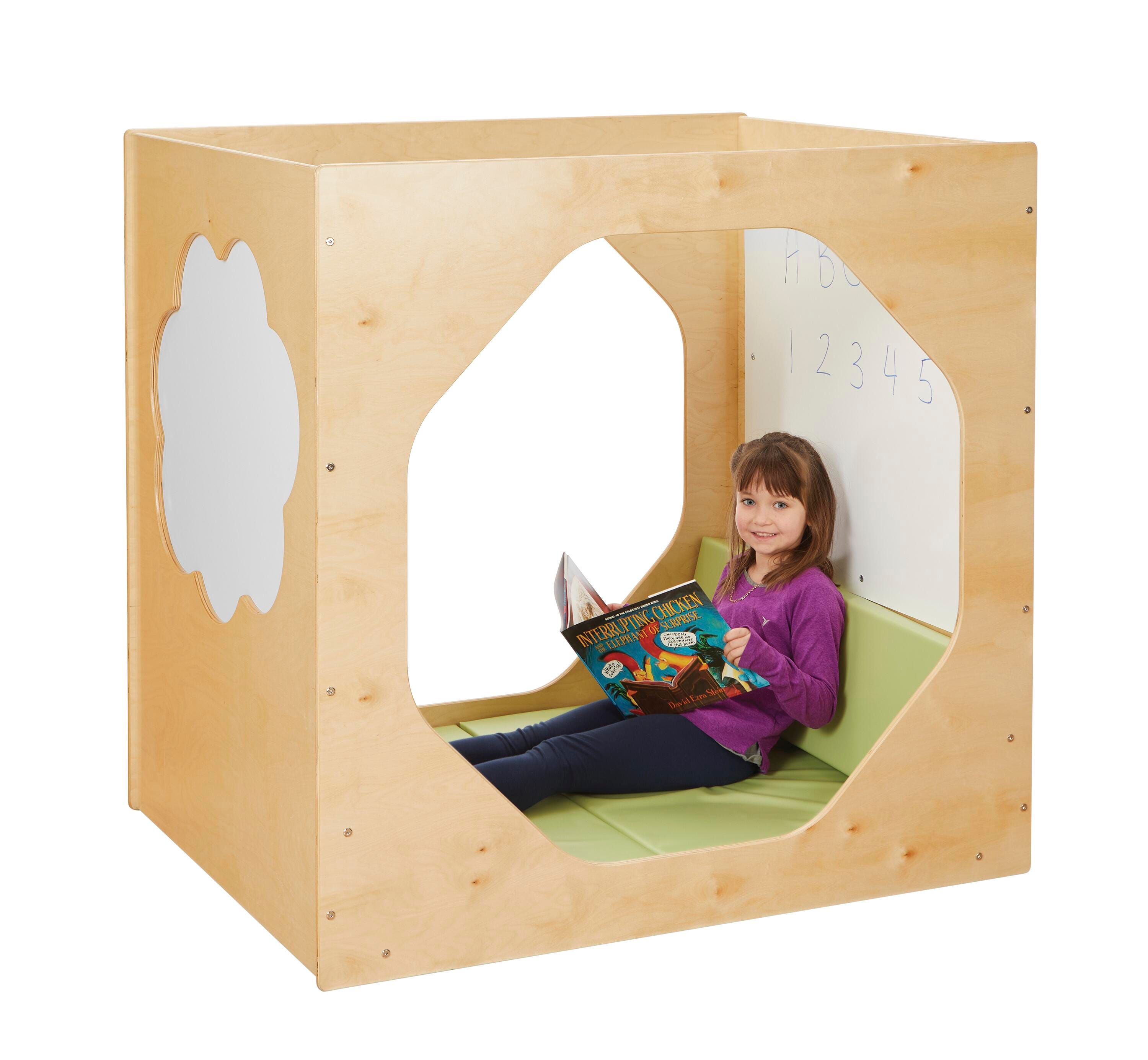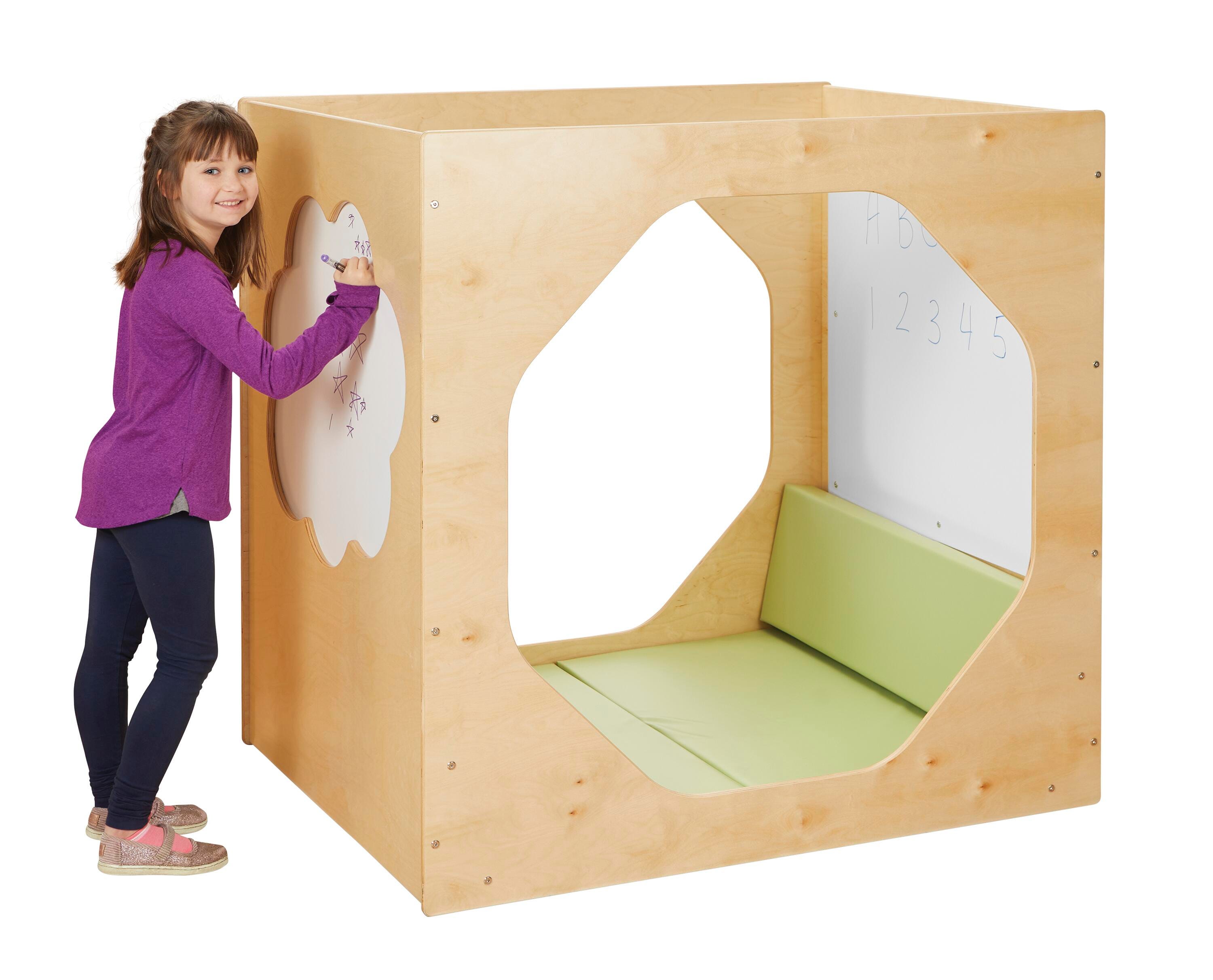 Create a retreat for students to separate themselves from the hustle and bustle of the classroom. Perfect for reading, studying, and relaxing, the Dream Cube features comfy cushions that are easy to clean and angled back rests. Double-sided Write-n-Wipe surfaces on the sides provide a space for students to jot down ideas, learning concepts, and work out problems. Large cutouts in the sides and the open top give teacher visibility while still creating a private area for students. Side openings are 37 inches in diameter. Cloud Write-n-Wipe surfaces are 28-1/2 W x 24 H inches. Inside Write-n-Wipe panels are 33 W x 29-1/2 H inches.