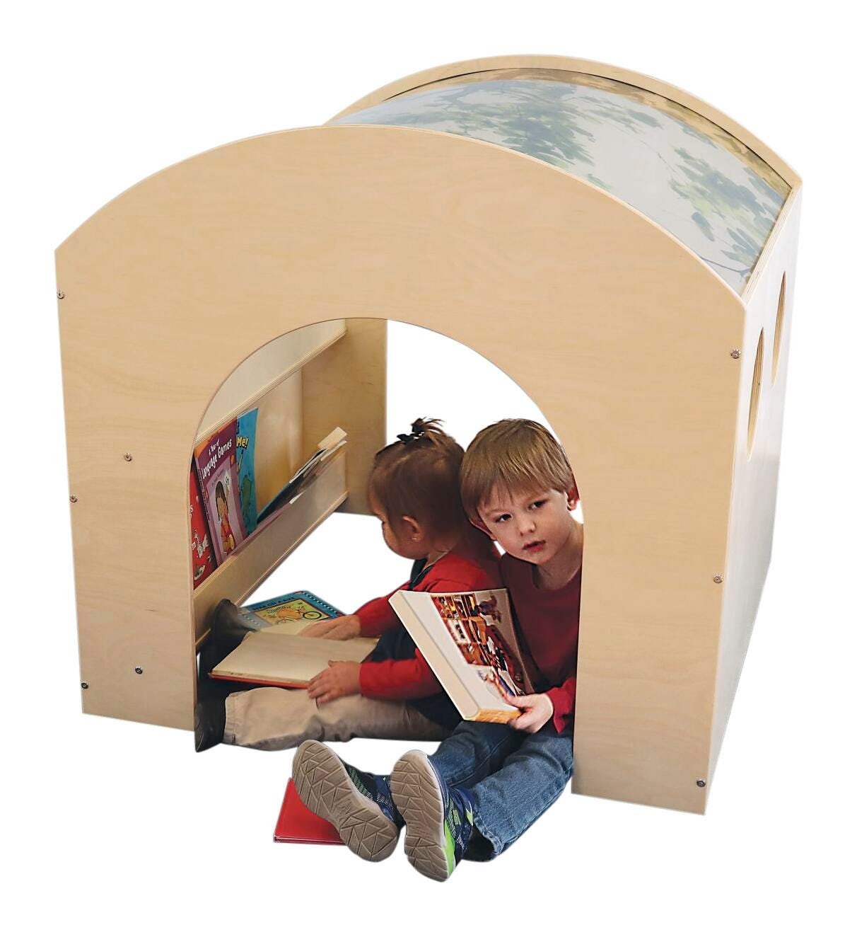 Another innovative Whitney Brothers® oasis for children! The biophilic design of this reading space features a unique curved acrylic roof imprinted with the realistic image of a spreading tree canopy that beckons children inside for a peaceful break yet provides easy visibility for adult supervision. The cozy interior features two built-in book display shelves on one side panel, viewing cutouts on the opposite panel and tunnel openings on each end panel that provide easy access and maximum visibility of children inside. Bring nature indoors and create a delightful quiet space that children will love!