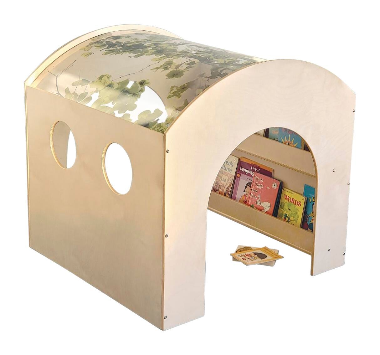 Another innovative Whitney Brothers oasis for children! The biophilic design of this reading space features a unique curved acrylic roof imprinted with the realistic image of a spreading tree canopy that beckons children inside for a peaceful break yet provides easy visibility for adult supervision. The cozy interior features two built-in book display shelves on one side panel, viewing cutouts on the opposite panel and tunnel openings on each end panel that provide easy access and maximum visibility of children inside. Bring nature indoors and create a delightful quiet space that children will love!