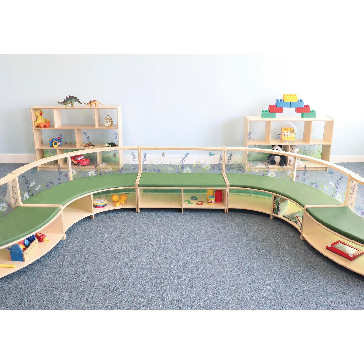 Create a flexible nature-inspired reading area! The sofa features an open compartment for book storage beneath the seat and an innovative back panel constructed in safe, shatterproof clear acrylic imprinted with an inviting nature scene that integrates with all other pieces in our exclusive Nature View collection. Combine with other Nature View Straight or Curved Sofas [each sold separately] to form a horseshoe, circle, S-shape or other inviting and flexible learning area that children will love! All corners and edges are rounded over and finished smooth for safety. Fitted matching green seat cushion and floor glides included.