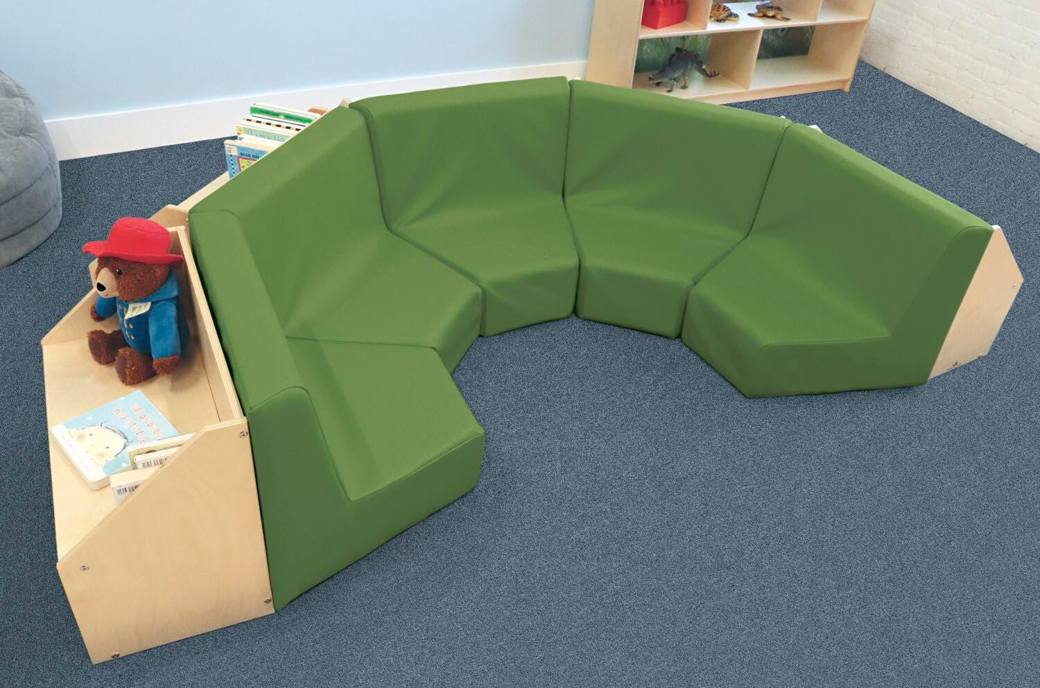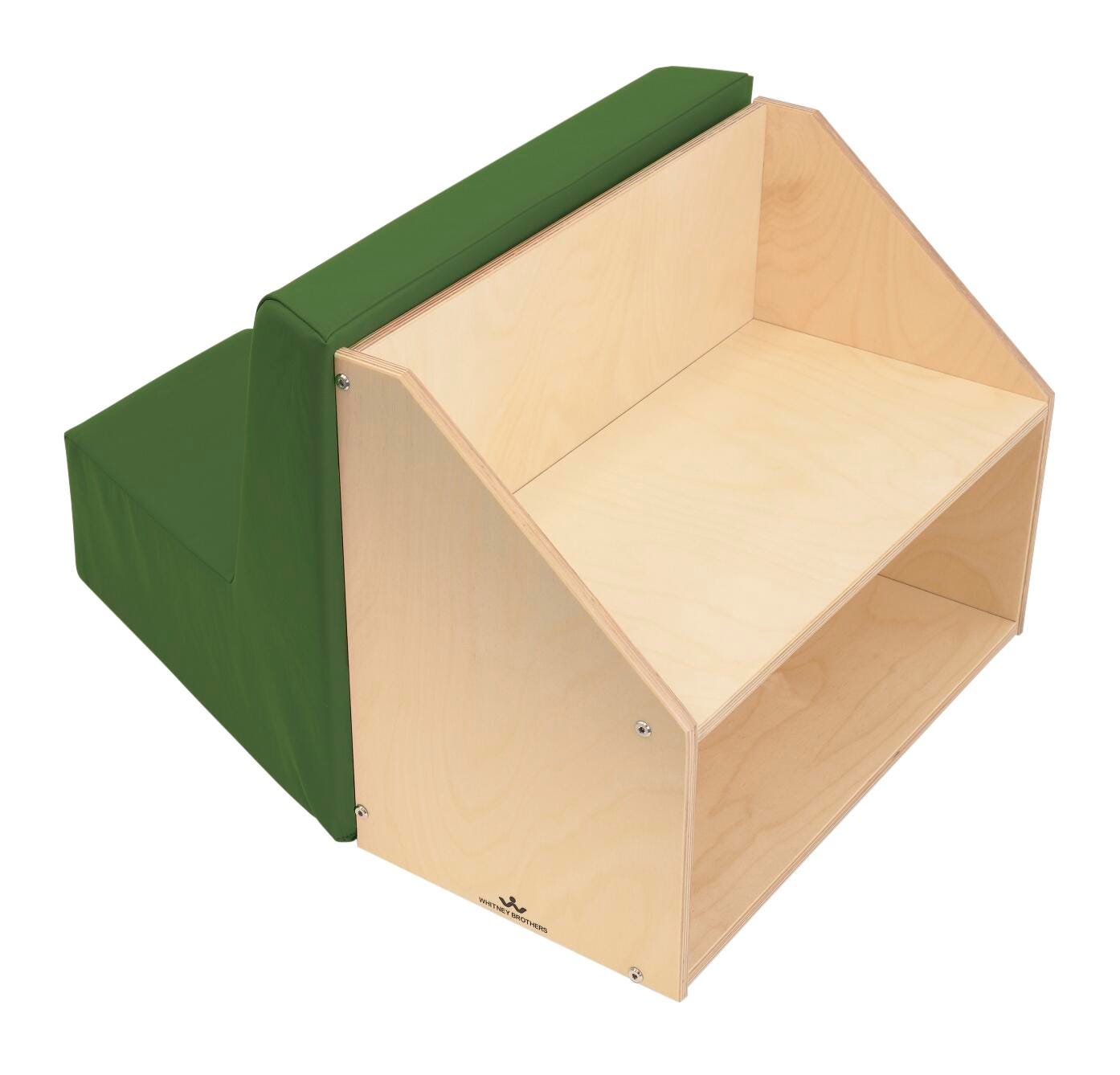 Whitney Brothers Single Reading Nook measures 24 W x 29 D x 18 H inches and offers storage for chairs and books. It is ideal for group reading and is used to establish comfortable play and learn areas.