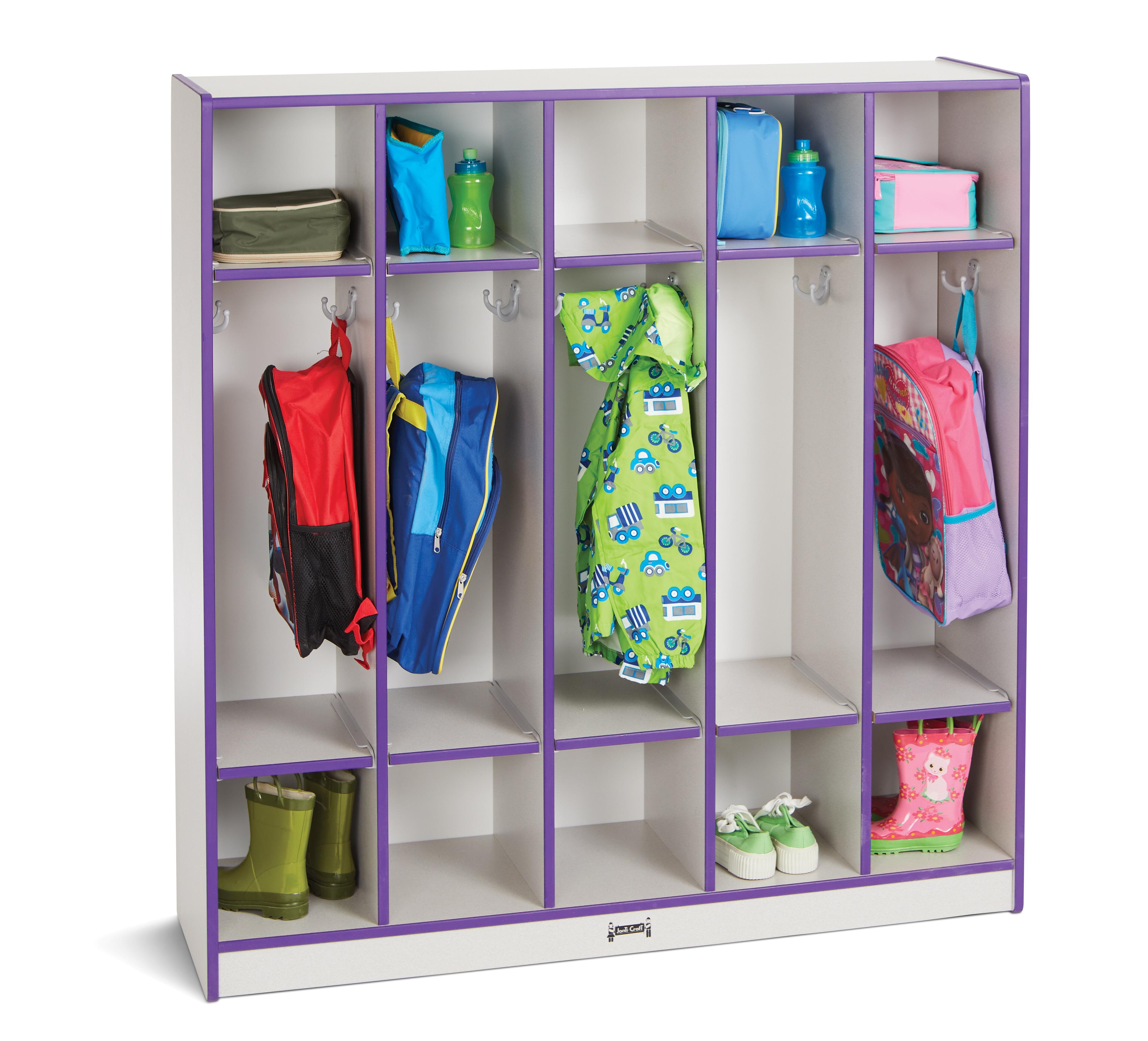 The Jonti-Craft Rainbow Accents 5 Section Coat Locker is made of durable freckled gray melamine with colored, safe edge banding. The locker can be configured and features a write-n-wipe recessed back with side-mounted double coat hooks. From materials that add long-lasting strength and durability, to functional features like hinges that prevent pinching small-sized fingers, Jonti-Craft has developed a portfolio of uniquely designed and constructed features that make our furniture perfect for kids, classrooms, and homes. These features make a difference from the moment you place them in a learning or home environment and you can be sure they will last through the years with our steadfast warranty.Features