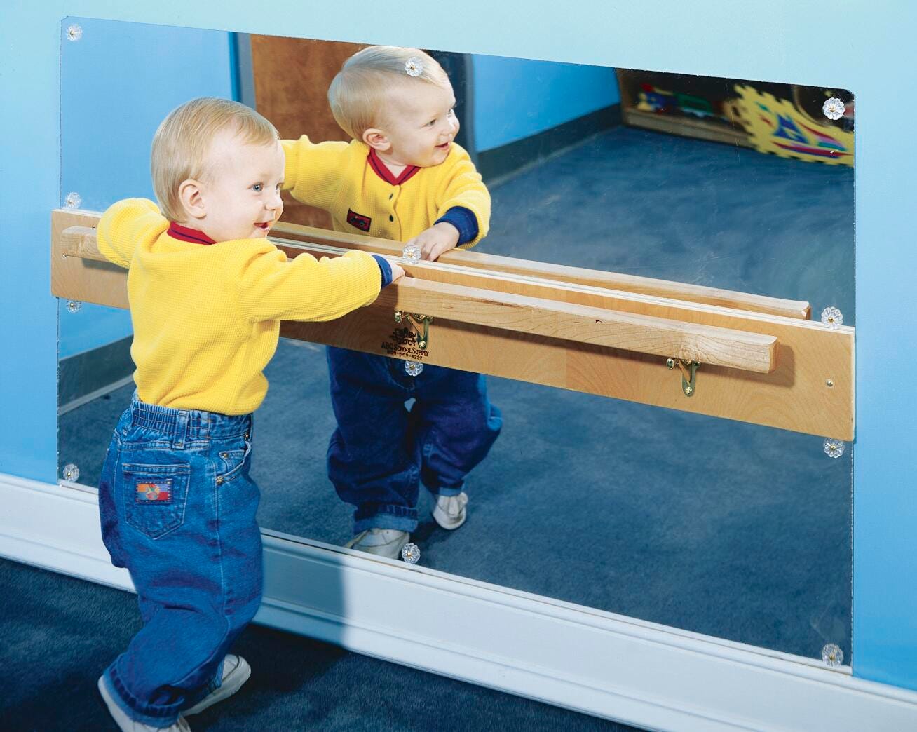 Encourage self-recognition and motor skill development with this shatterproof acrylic mirror and sturdy safety bar, perfect for early learning environments.