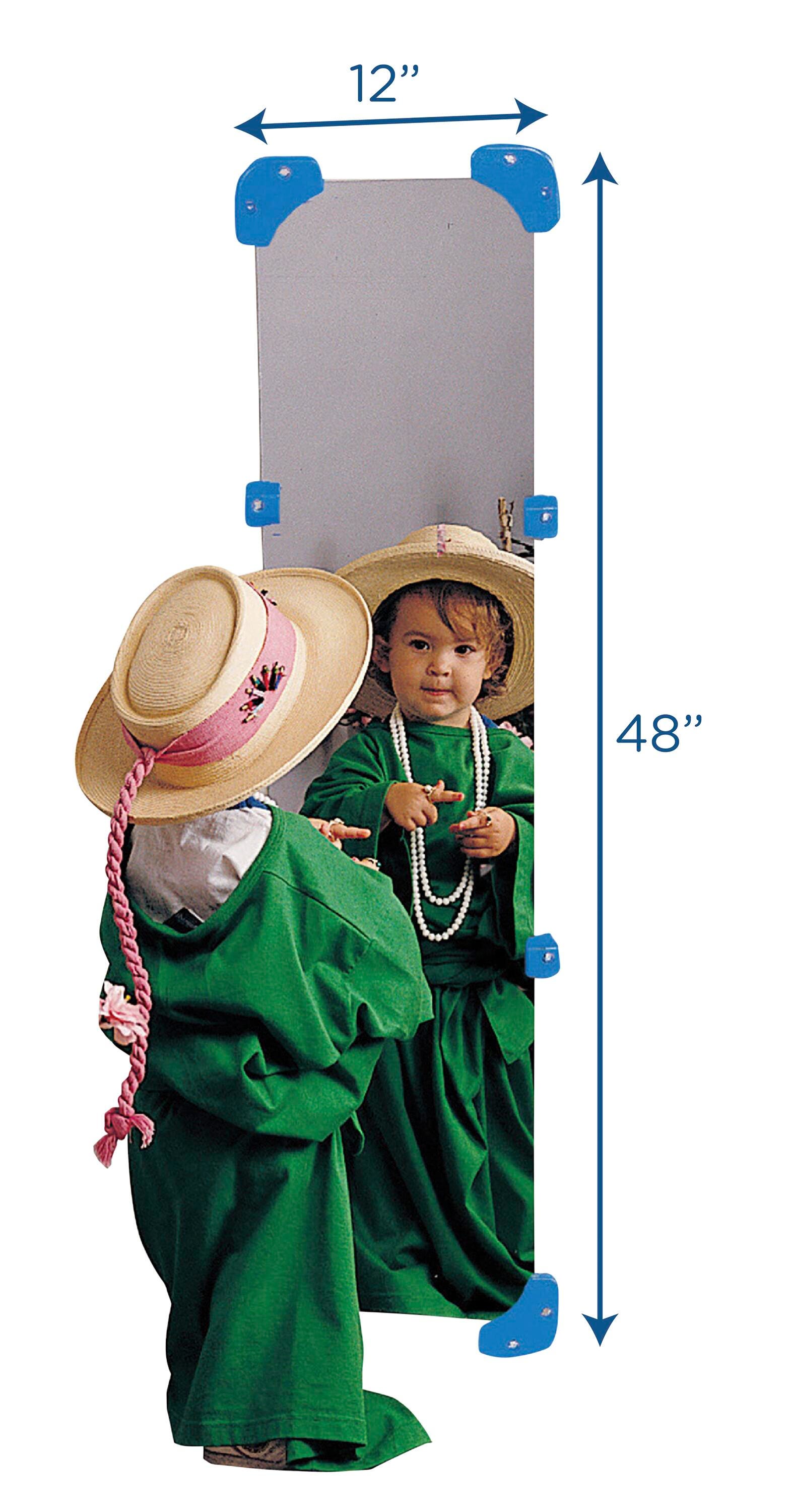 Add a new dimension to dramatic and creative play! This shatter-resistant acrylic wall mirror fastens easily to wall creating an irresistible focal point for play. Attach mirror to the wall with our molded polyethylene corners and sides. Corners and sides make installation simple and hold mirror securely to wall. Mounting hardware not included. Measures 48 L x 12 W inches.Features